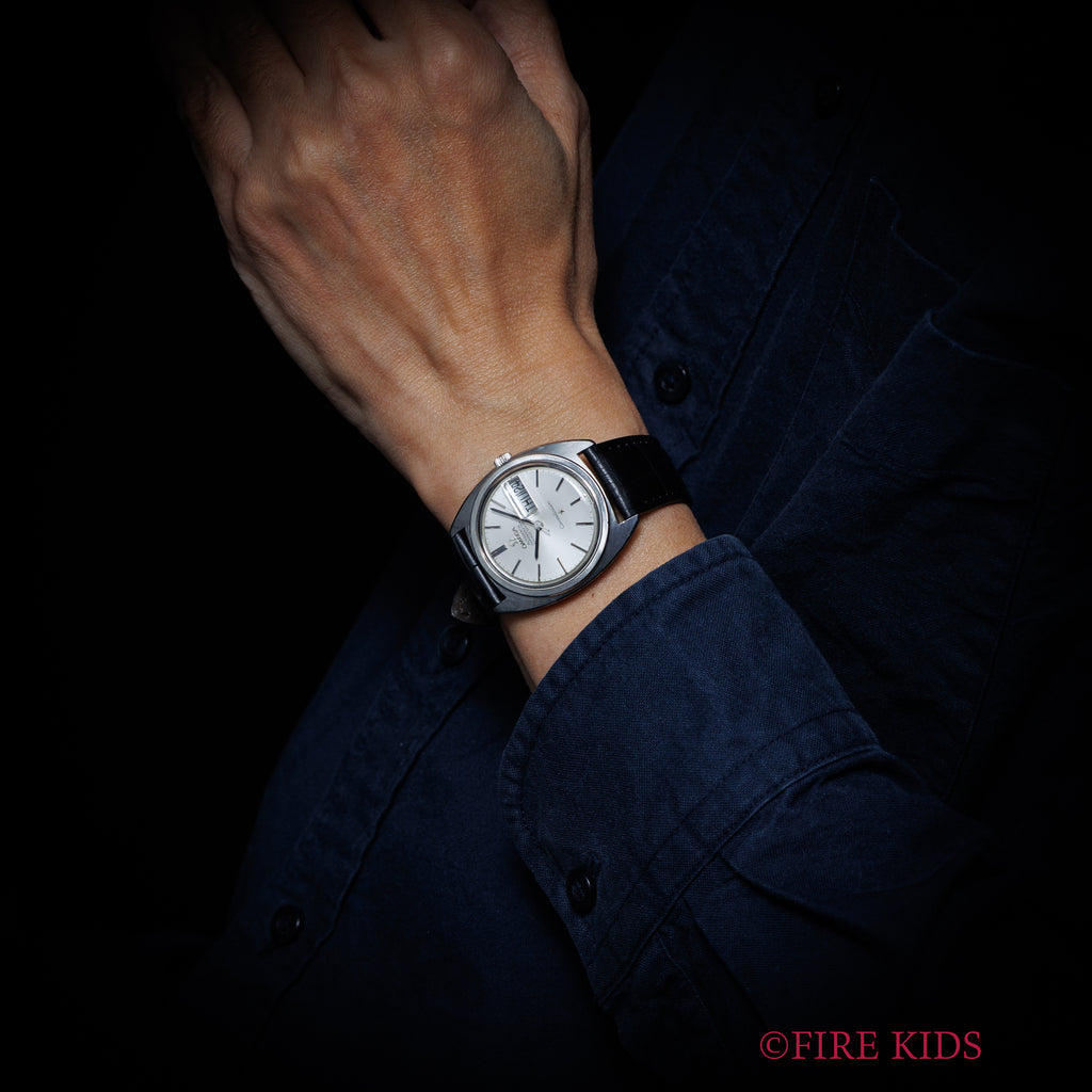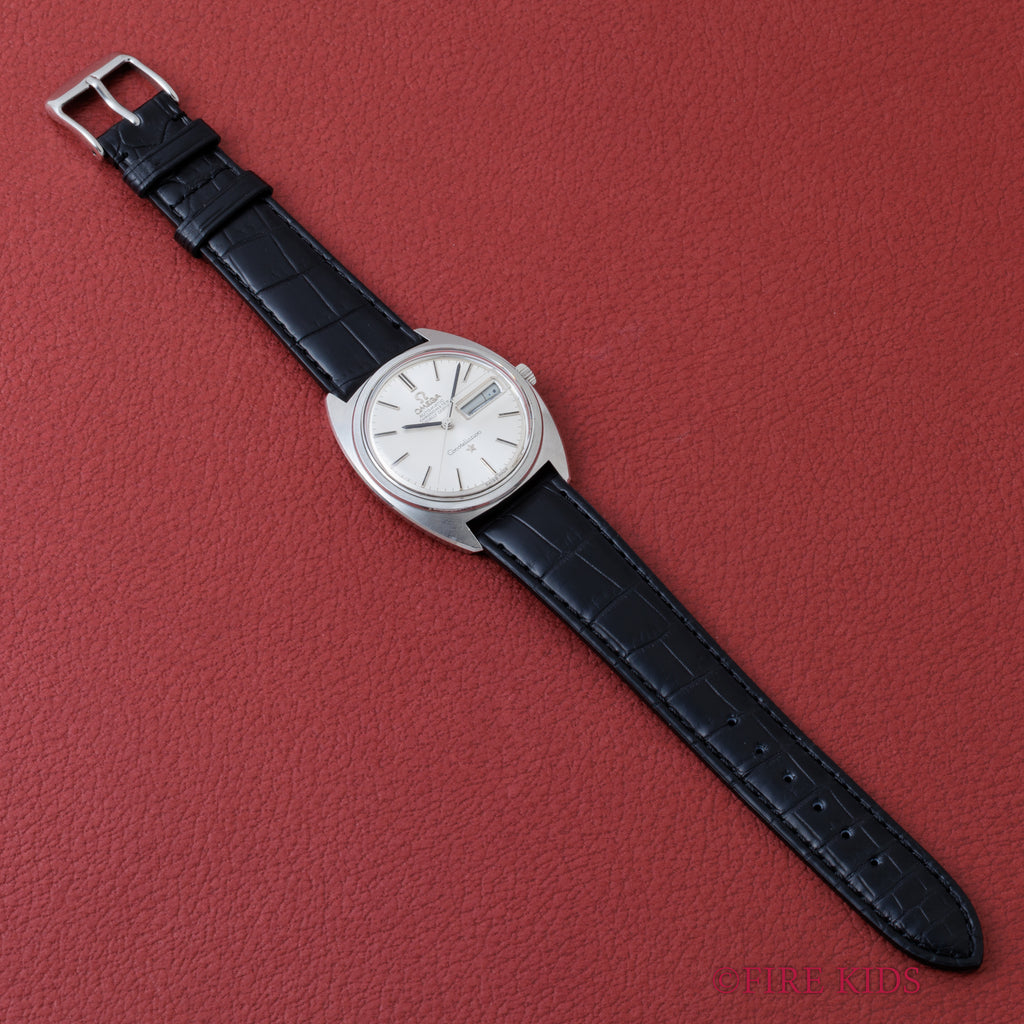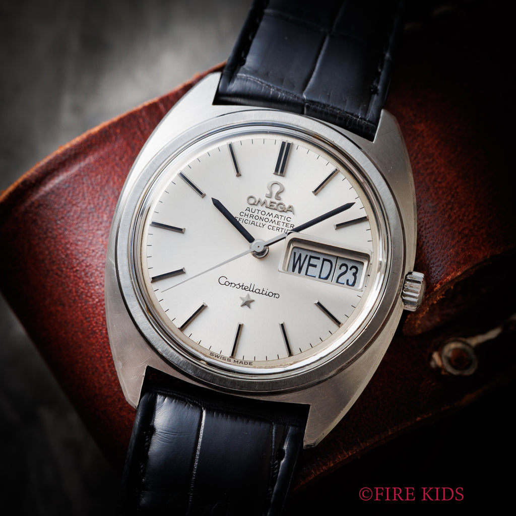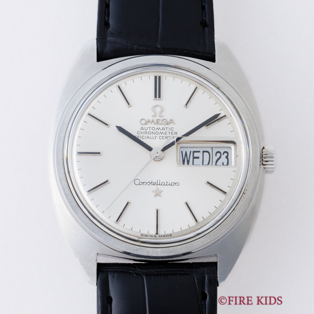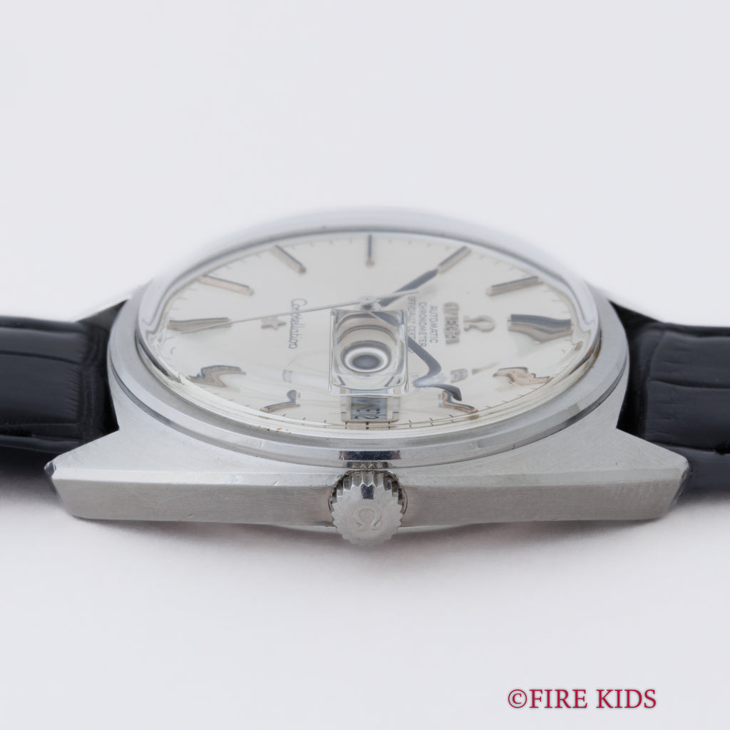 オメガ コンステレーション 1969年製 Ref.168.019 シルバーダイヤル 自動巻クロノメーターです。世界一有名な時計デザイナーとして知られるジェラルド・ジェンタ氏の代表作の一つです。ダイヤル、ケースともに多少の経年、小傷程度で大きなダメージはございません。ムーブメントはクロノメーターのCal.751を搭載、リュウズを2段階引っ張ることでカレンダーを早送りできます。手巻きや針回し操作もスムースです。ファイアーキッズオリジナルのクロコダイル革ベルトを合わせています。純正風防が装着されています。こちらは分解掃除済みになります。