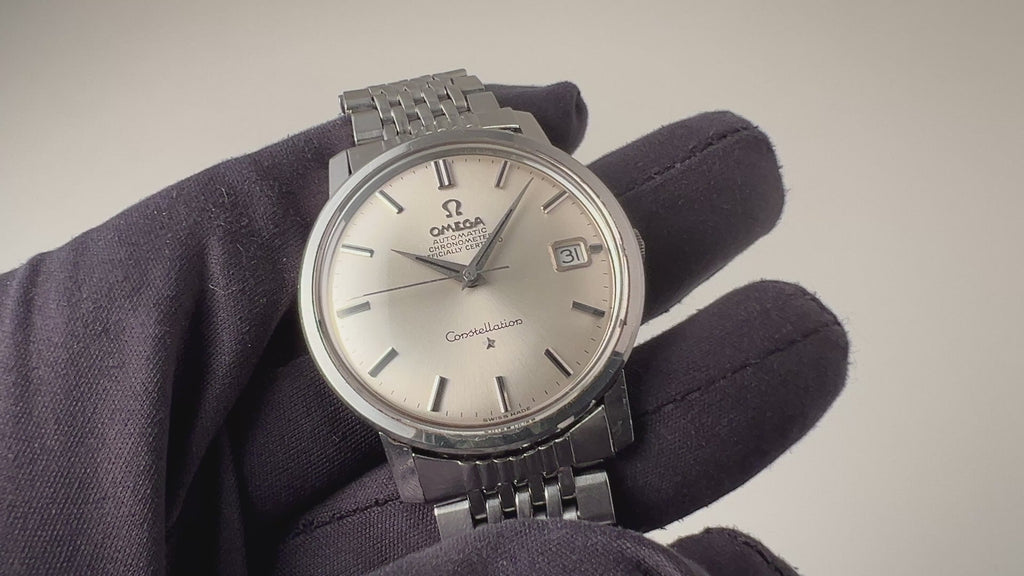 オメガ コンステレーション 自動巻きクロノメーター 1966年製 Ref.168.010 Cal.564 純正ブレスの入荷になります。シンプルなラウンドケースにサンレイのシルバーダイヤルは飽きのこないシンプルなデザインです。存在感のある35mmサイズのケースは小傷は見られますが、ラグの面取りがしっかりと残っています。ムーブメントは2段引きでカレンダーの早送りができる自動巻クロノメーターCal.564を搭載しており、巻き上げはスムーズです。ベルトは純正ブレスが取り付けされています。