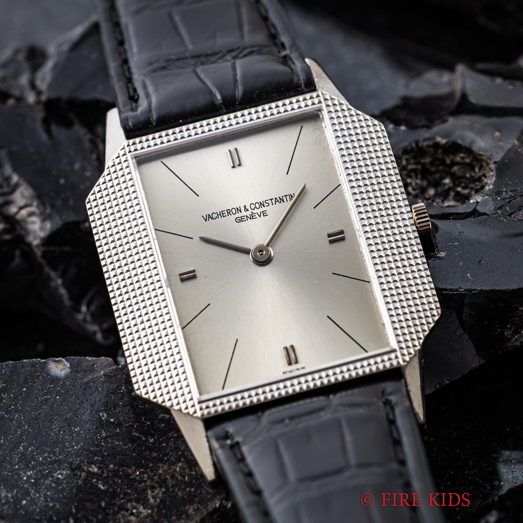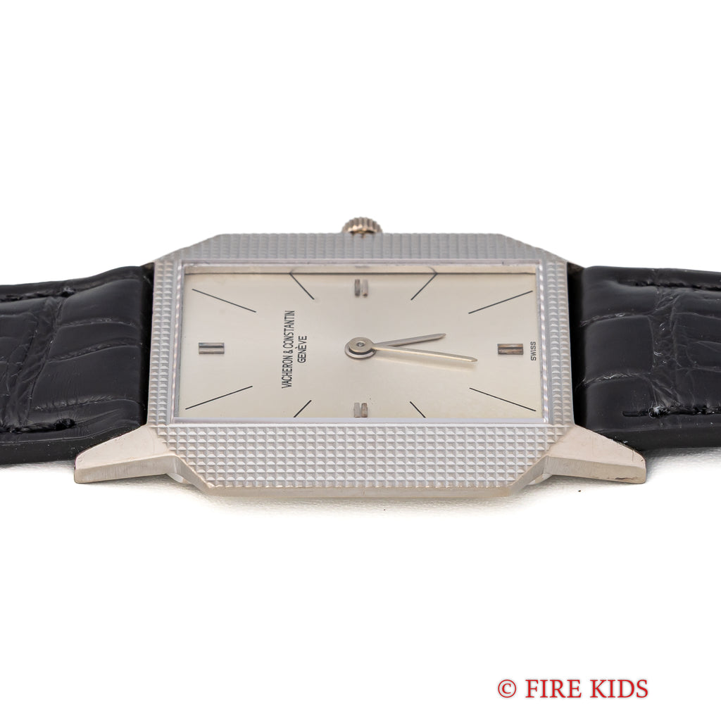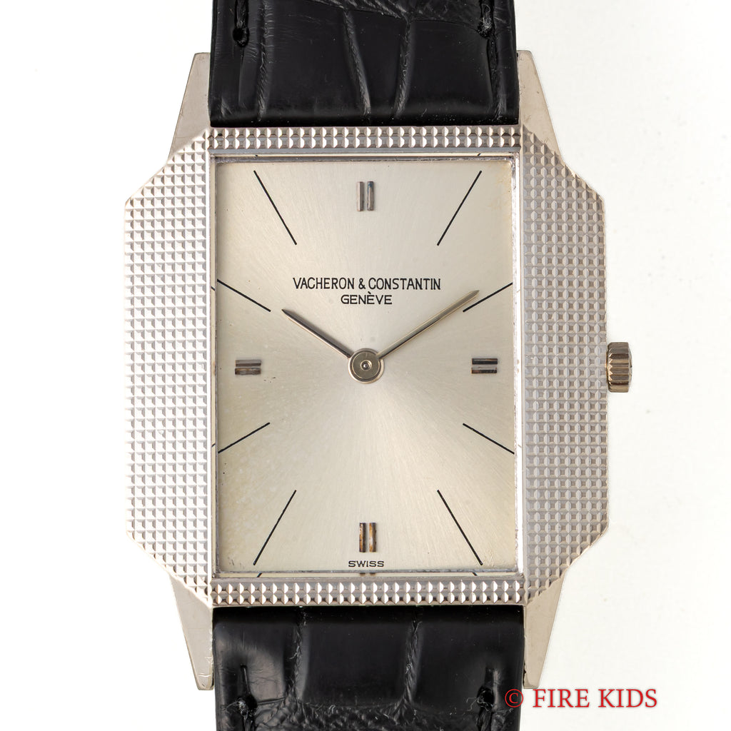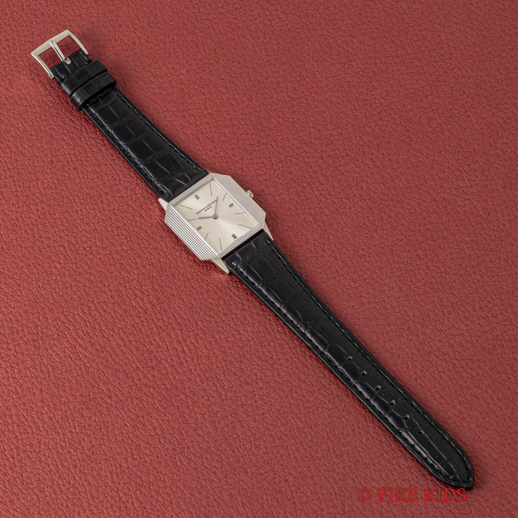ヴァシュロン・コンスタンタン 18金無垢ホワイトゴールドスクエアケース 1970年代製 手巻 Cal.1003 Ref.6989の入荷になります。厚さ僅か4㎜強の薄型ドレスウォッチでエングレーブが施されたスクエアケースが魅力的です。文字盤はシミ等無く綺麗です。ケースは小傷が見られますが大きなダメージはありません。ムーブメントはジャガー・ルクルトベースのCal.1003を搭載しています。手巻きや針回しの操作はスムースです。ベルトはファイアーキッズオリジナルのクロコダイル革ベルトに純正WG尾錠が取り付けられています。