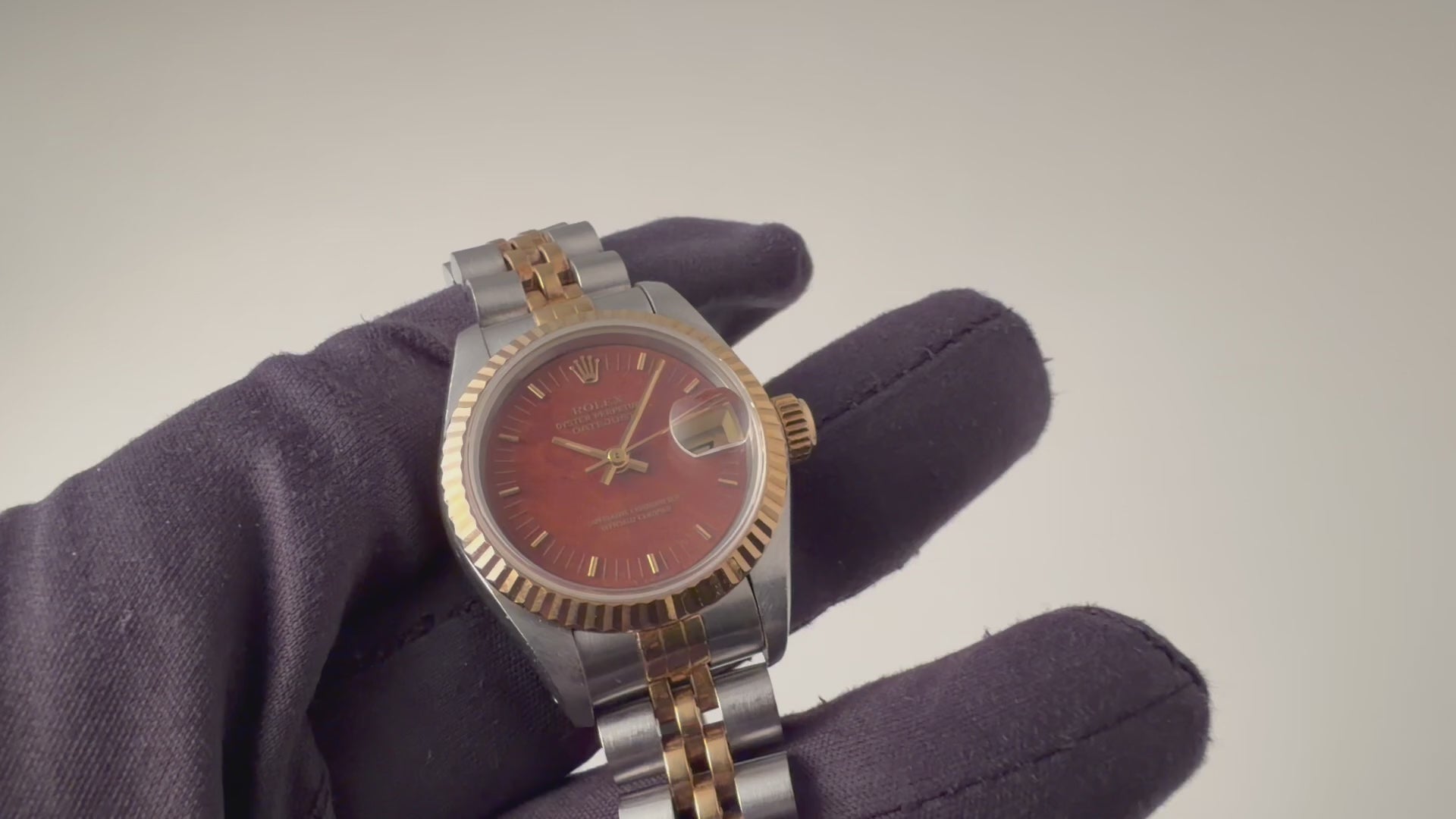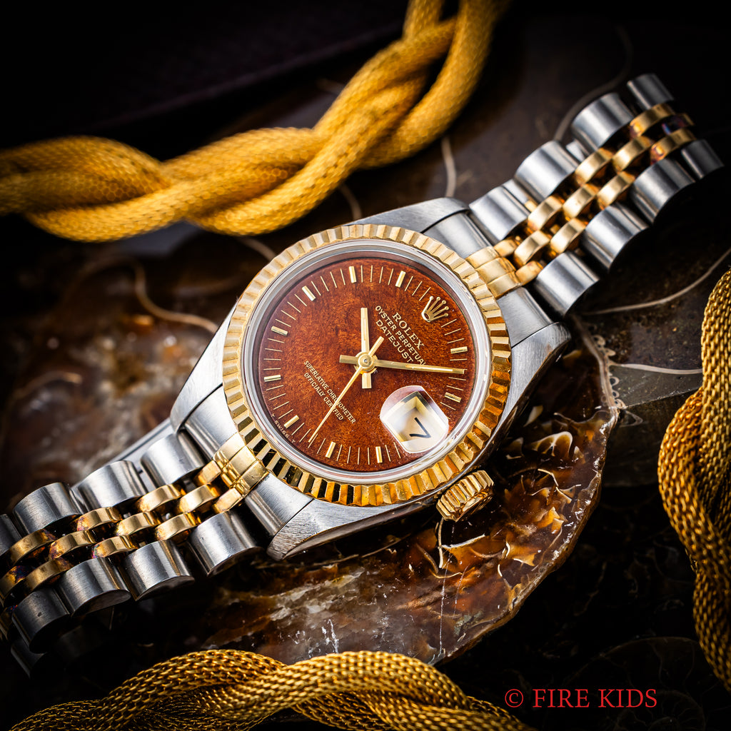 ロレックス デイトジャスト レディースコンビ ウッドダイヤル Ref.69173 1991年製です。珍しいレディースの木材を使用したモデルです。こちらは木材を特殊コーティングをして文字盤として落とし込んでいます。木目は天然素材なので一つとして同じ味わいのない唯一無二の存在感があります。文字盤の風合いによる「落ち着き」とシルバーカラーとゴールドコンビの「華やかさ」を両立した特別な1本です。小傷はありますが大きなダメージはありません。純正コンビブレス付きです。こちらは分解掃除済みです。