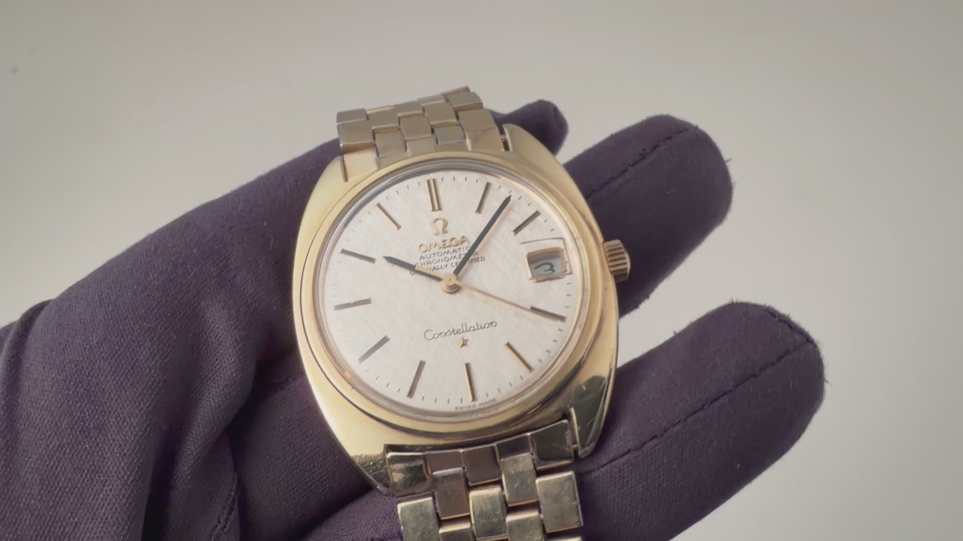 オメガ コンステレーション 1968年製 トップゴールドケース リネンダイヤル ジェンタデザイン 自動巻クロノメーター 純正ブレス付きの入荷になります。世界一有名な時計デザイナーとして知られるジェラルド・ジェンタ氏の代表作になります。 デイトのモデルかつリネンダイヤルの高級感のある一本です。 ケースは小傷程度です。文字盤は綺麗です。ムーブメントはクロノメーターのCal.564を搭載、リュウズを2段階引くことでカレンダーを早送りできます。手巻きや針回し操作もスムースです。少々剥がれはありますが、純正GPブレス付きです。こちらは分解掃除済みです。