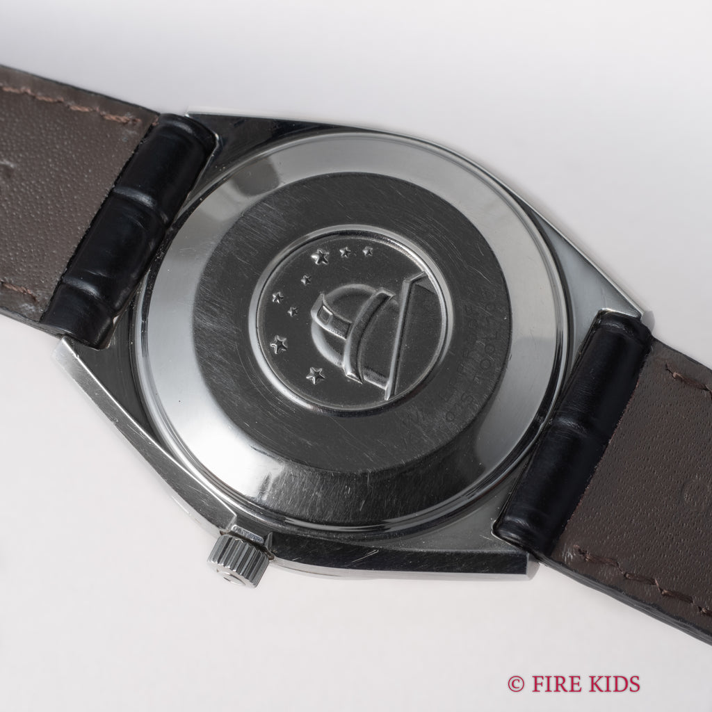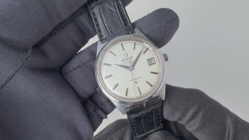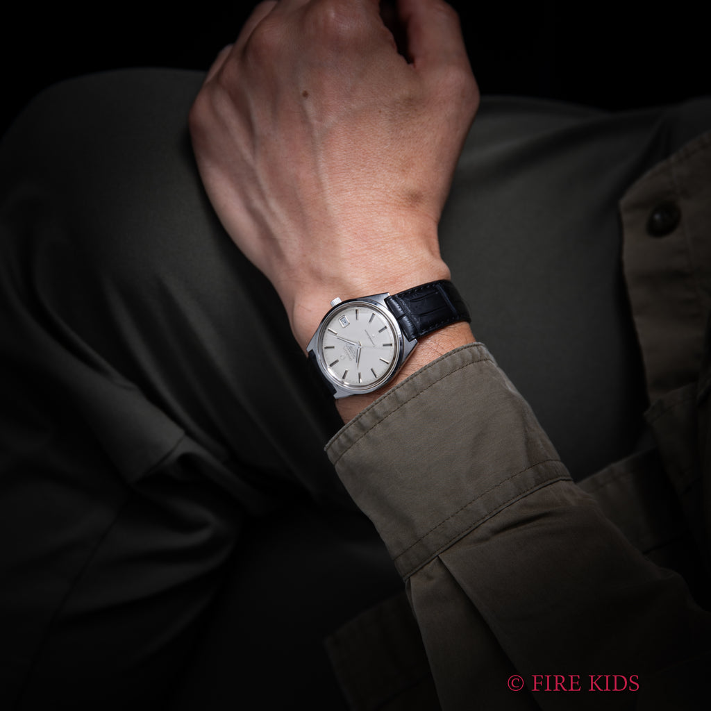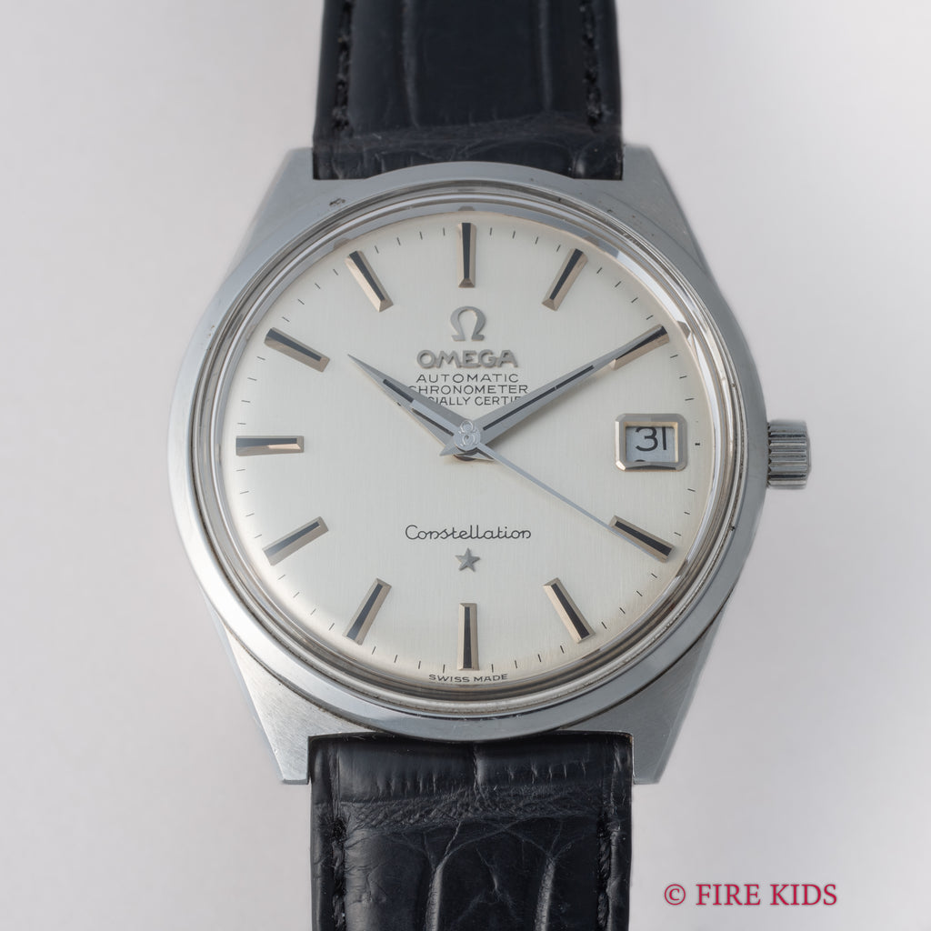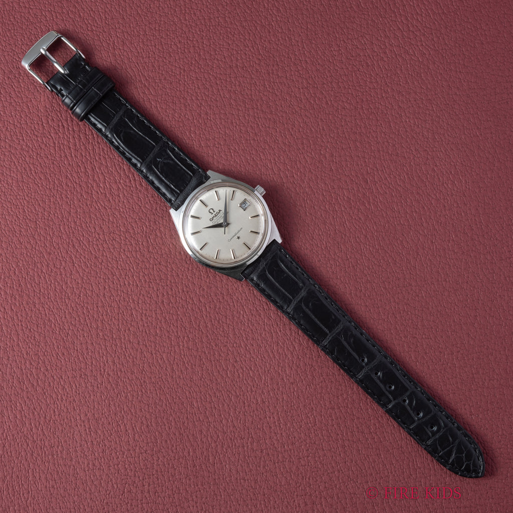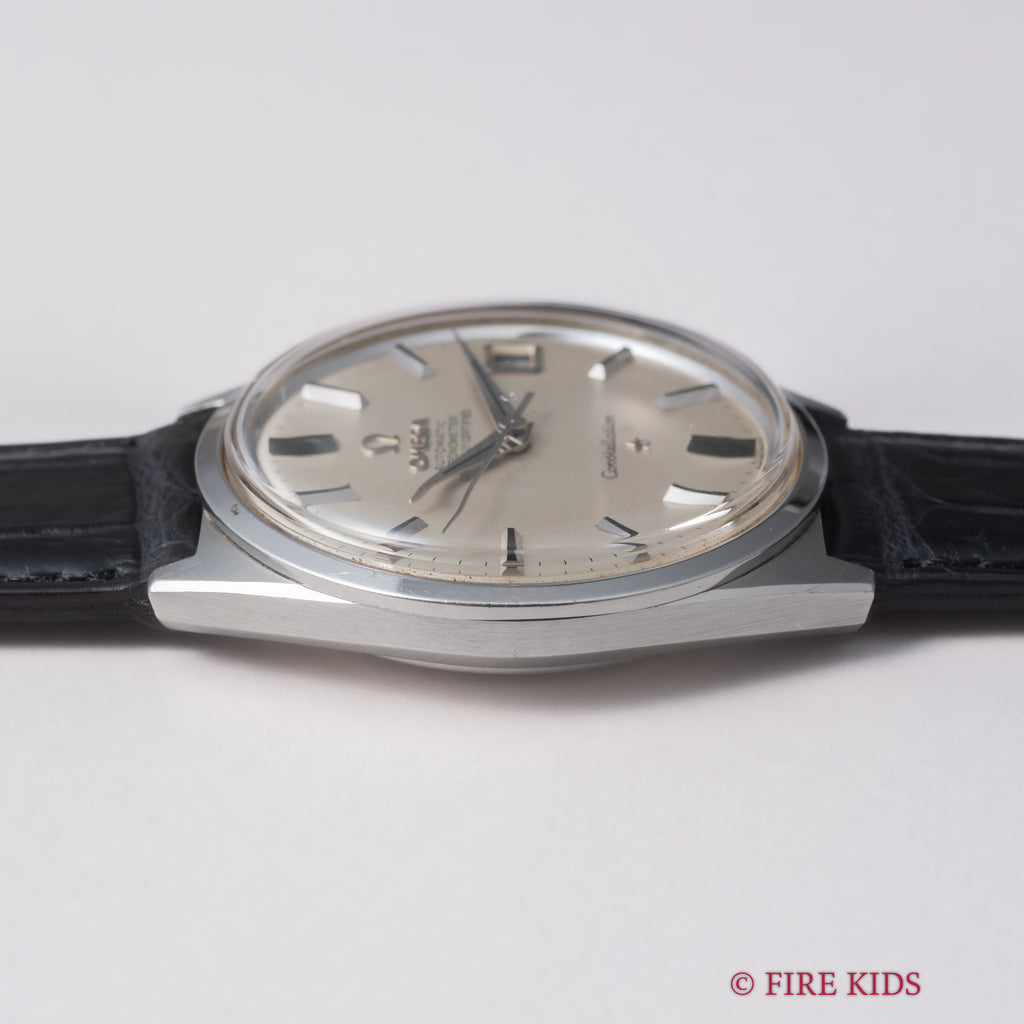 オメガの1968年製 コンステレーション シルバーダイヤルです。文字盤は気になるダメージのない良好な状態です。存在感のある34mmサイズのケースは小傷が見られますが、ラグの面取りがしっかりと残っています。ムーブメントは2段引きでカレンダーの早送りができるクロノメータームーブメントCal.564を搭載しており、巻き上げはスムーズです。ベルトはファイアーキッズオリジナルのクロコダイル革ベルトが取り付けられています。