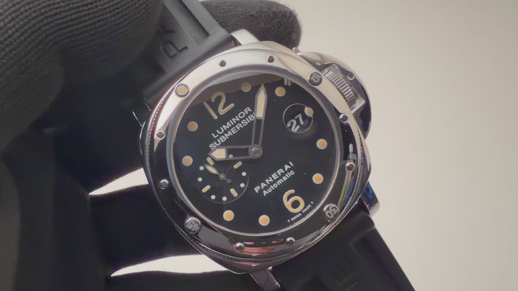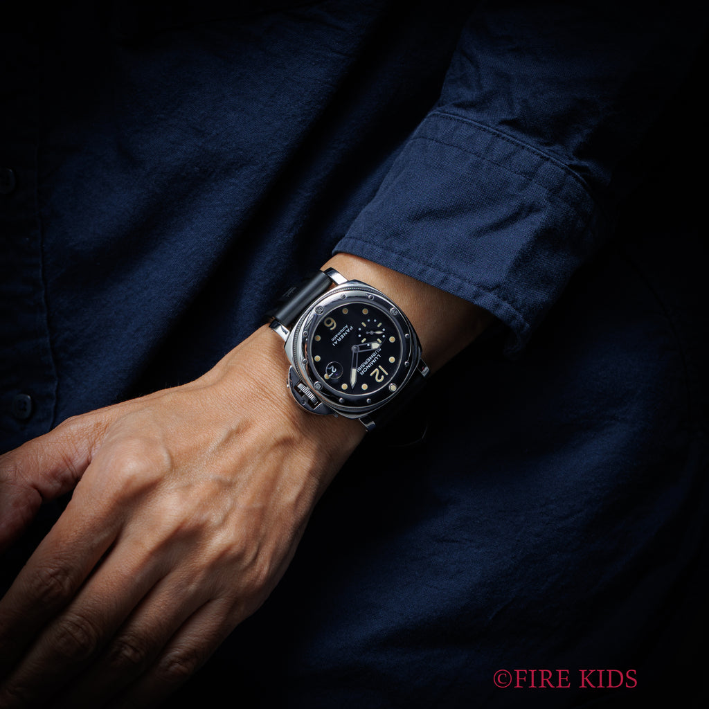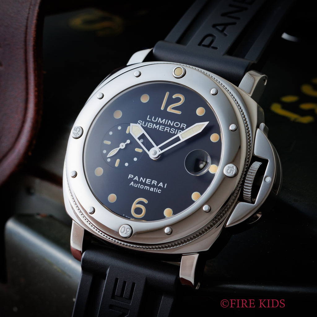 パネライ ルミノール サブマーシブル ピカサブ 2000年製(平成12年製) Ref.PAM00024/OP6527 自動巻 箱ギャラの入荷になります。1950年代にパネライがエジプト海軍の為に制作した防水時計がルーツと言われており、40mmを越える迫力のあるケースサイズかつ厚みがあり存在感があります。ベゼルに目盛りが無く、ポリッシュ仕上げがなされた貴重な初期タイプである通称「ピカサブ」です。フチの無いインデックス夜光が灼けていて良いヴィンテージの雰囲気です。リューズロックが効いていて、日付早送りと時刻合わせの際には開放して操作を行います。ダイヤル、ケースともに小傷はありますが高年式ということもあり特筆すべきダメージはありません。ベルトは純正のラバーベルトに純正尾錠が付いています。