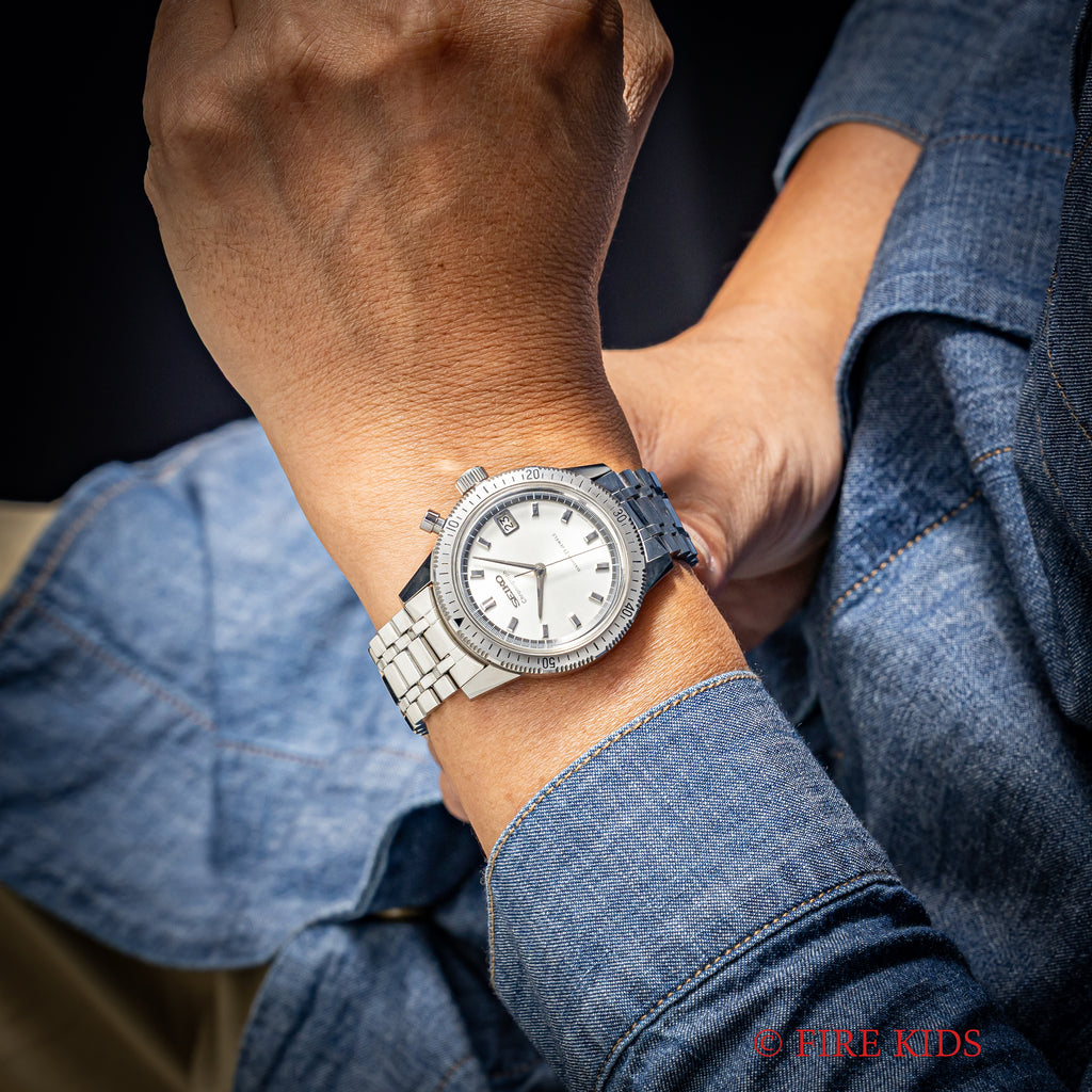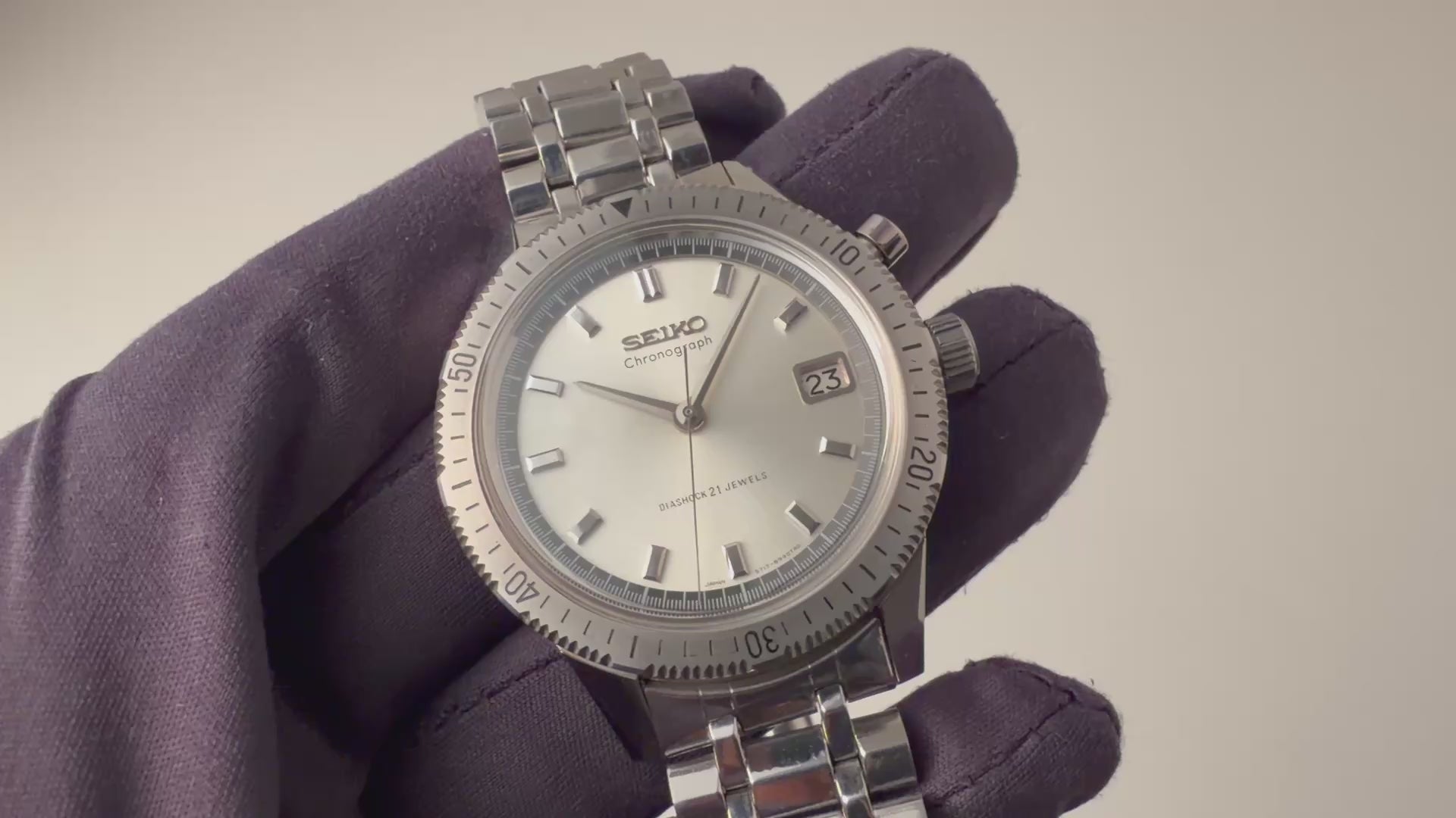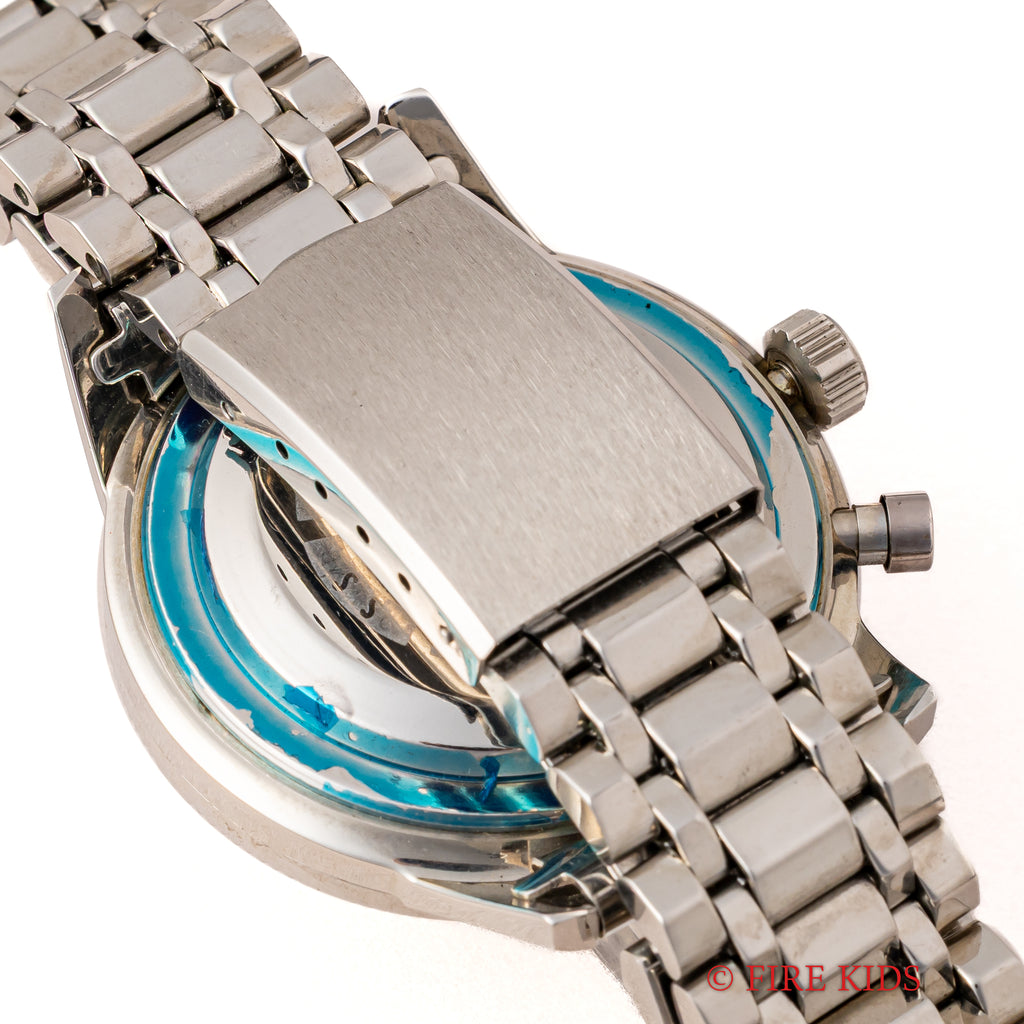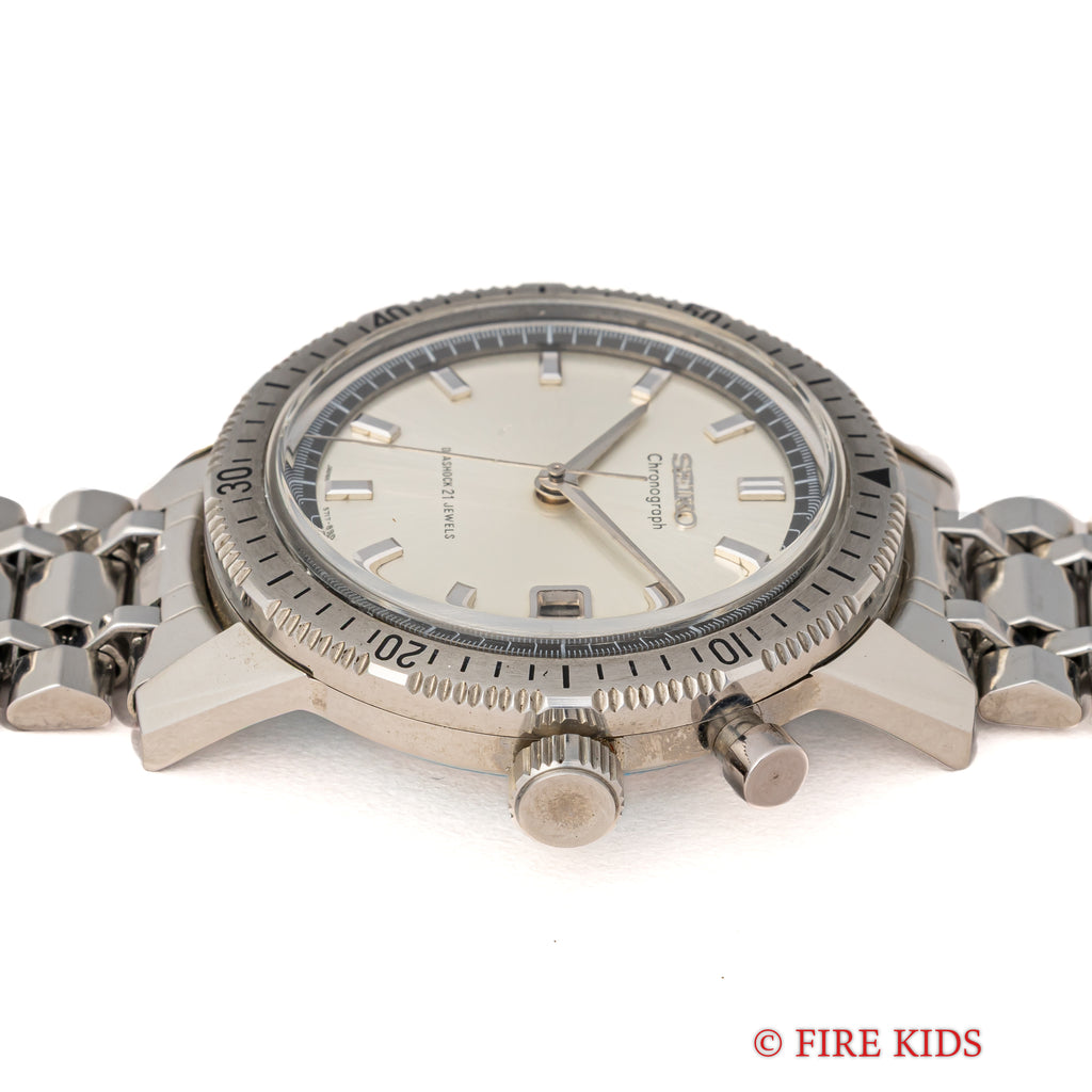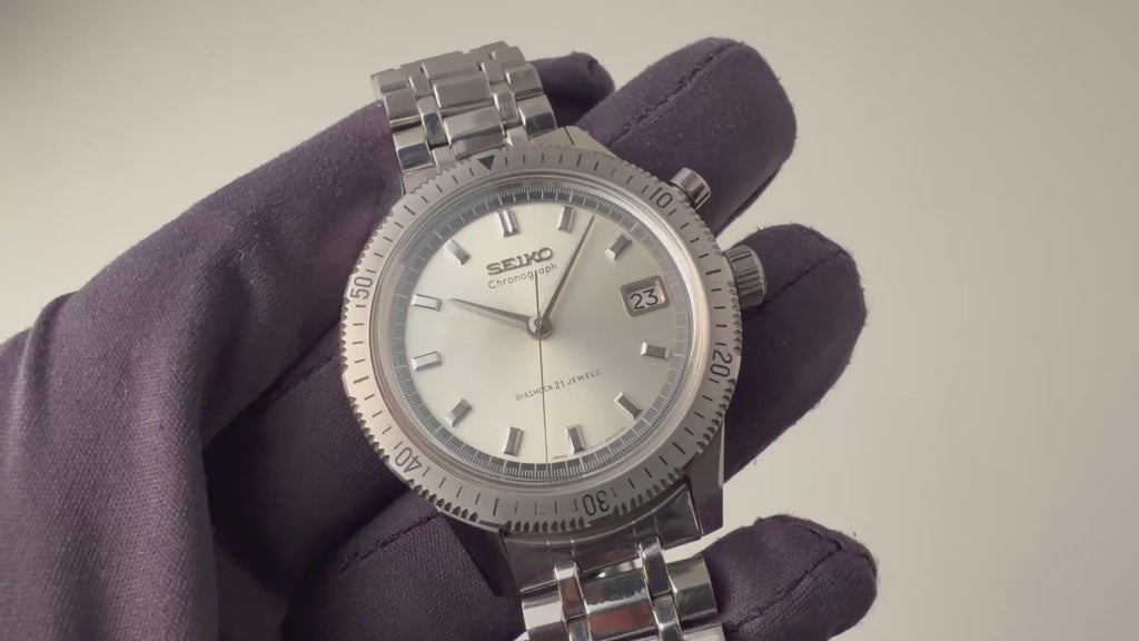 1964年製のセイコーワンプッシュクロノグラフ 後期 ステンレスベゼル手巻きモデルです。回転ベゼルがついたワンプッシュクロノグラフで、国産初のクロノグラフとしても知られ2時位置のプッシュボタンでクロノグラフを操作します。ムーブメントは手巻きのCal.5717を搭載、カレンダーのクイックチェンジ機能付きです。文字盤は肉眼で綺麗なコンディションを維持しています。ケースは小傷はありますが裏蓋シールも残るグッドコンディションです。ベルトは純正ブレスが付いています。