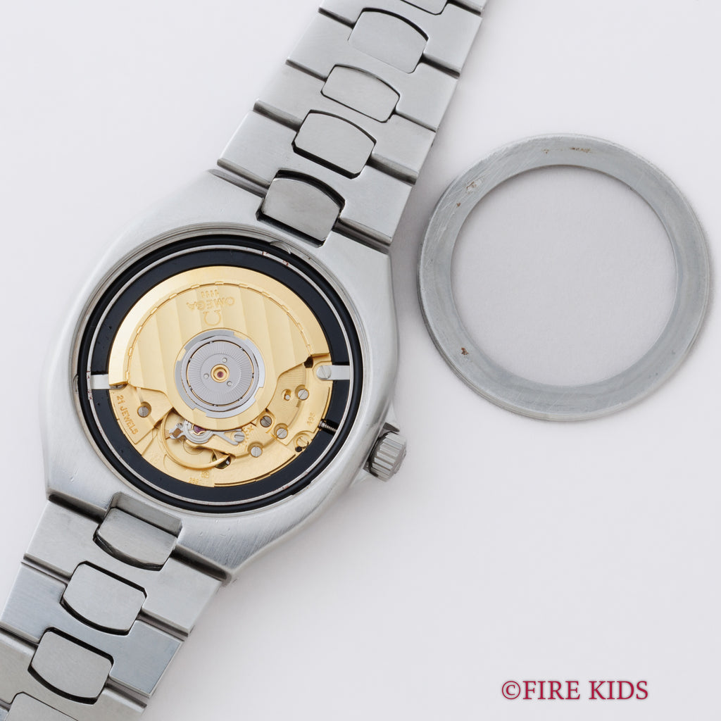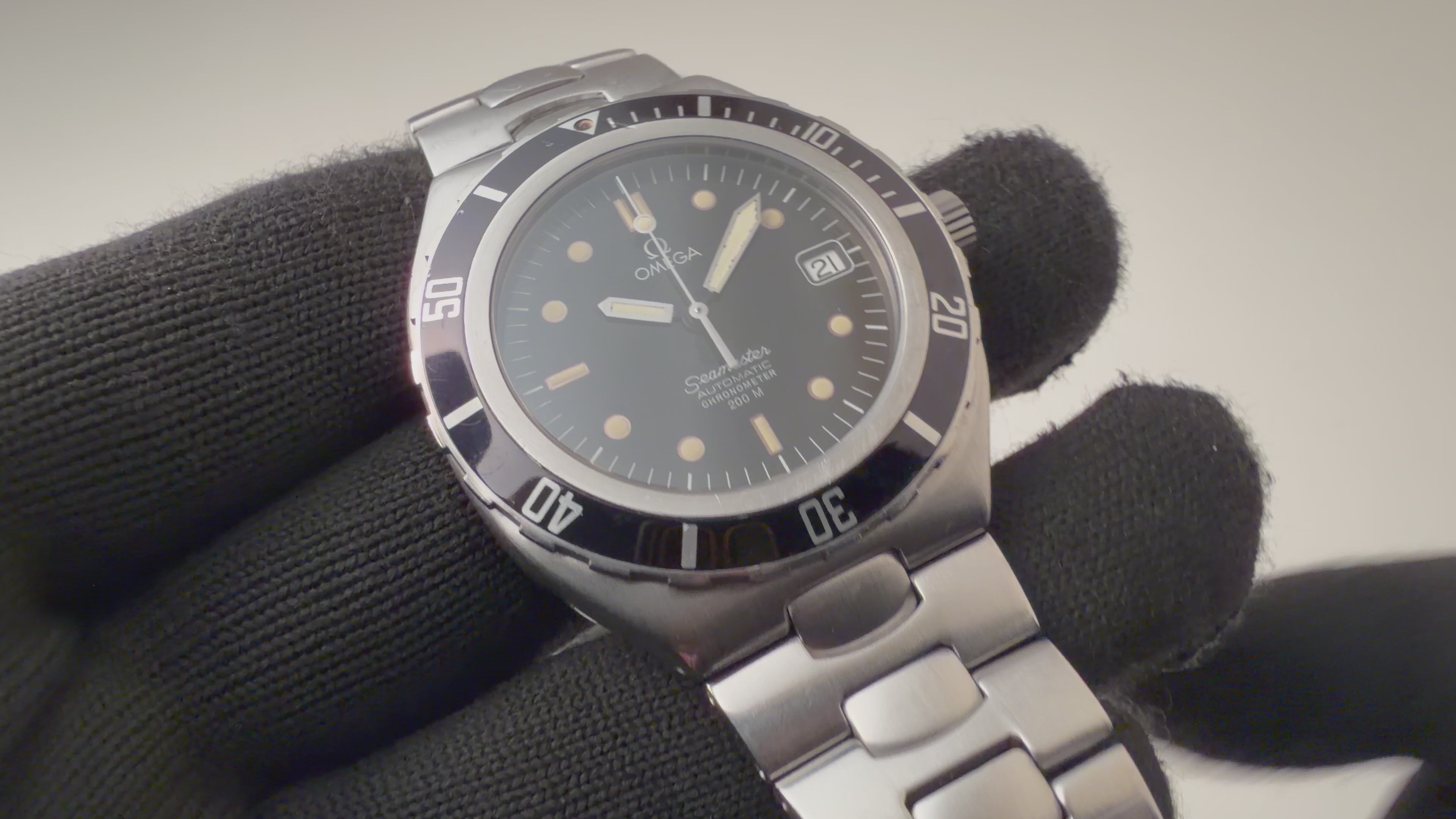 1988年製のオメガシーマスタークロノメーター200m、通称「プレボンド」です。デザインはジェラルド・ジェンタ氏が手掛けたと言われているダイバーズウオッチです。ベンツ針が付くタイプもございますが、本品はオメガらしいデザインの針が付いています。通常の36mm径より大きい39mmのケースは貴重かつ存在感があります。ダイバーズらしいサイズでありながら薄型で装着感に優れているのがポイントです。針夜光とインデックス夜光の色味が若干異なりますがこれで合っています。ムーブメントは自動巻きのCal.1111を搭載し、ファンクションも問題ありません。ベルトはケースと一体型の純正ステンレスブレスが取り付けてあります。ケースは小キズが見られますが大きなダメージはありません。こちらは分解掃除済みです。