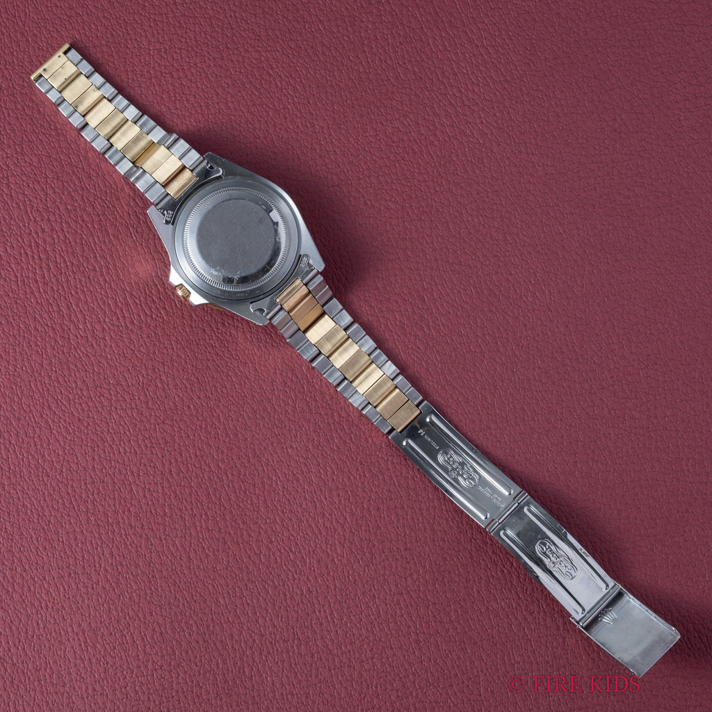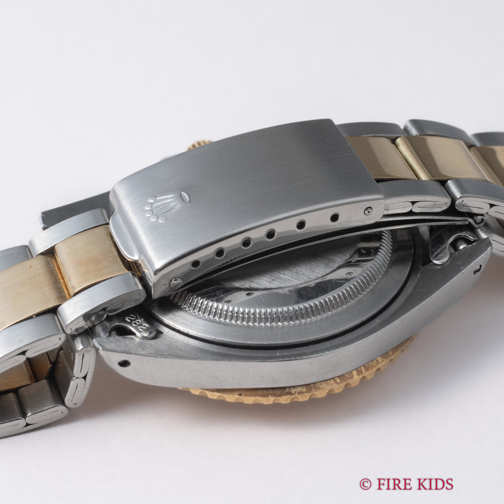 1978年製のロレックスGMTマスター Ref.1675コンビモデルです。インデックスが立体感のあることからフジツボのように見え通称茶ツボと呼ばれる一本。ベゼルは多少傷はございますが良い色の抜け具合をしていて雰囲気抜群です。ムーブメントは名機のCal.1570を搭載。ケースはステンレスとイエローゴールドのコンビで小キズが見られますが大きなダメージはありません。ベルトは3連の純正コンビブレスが取り付けてあります。手巻きや針回し、ねじ込みリューズの操作はスムースです。
