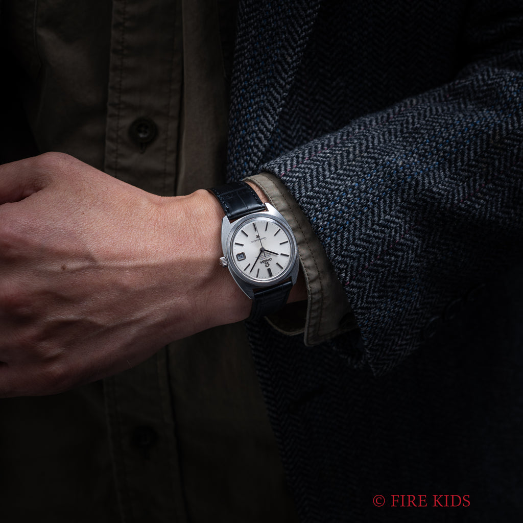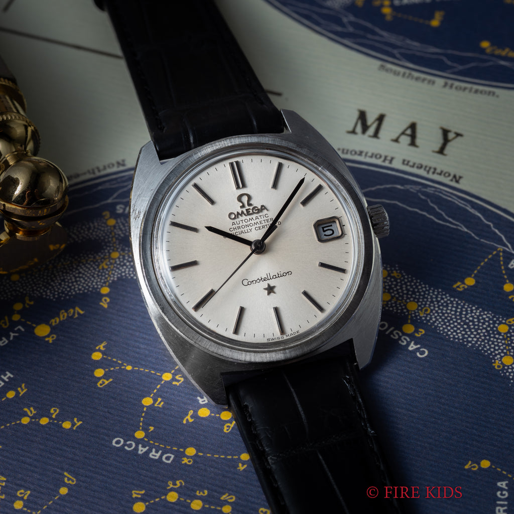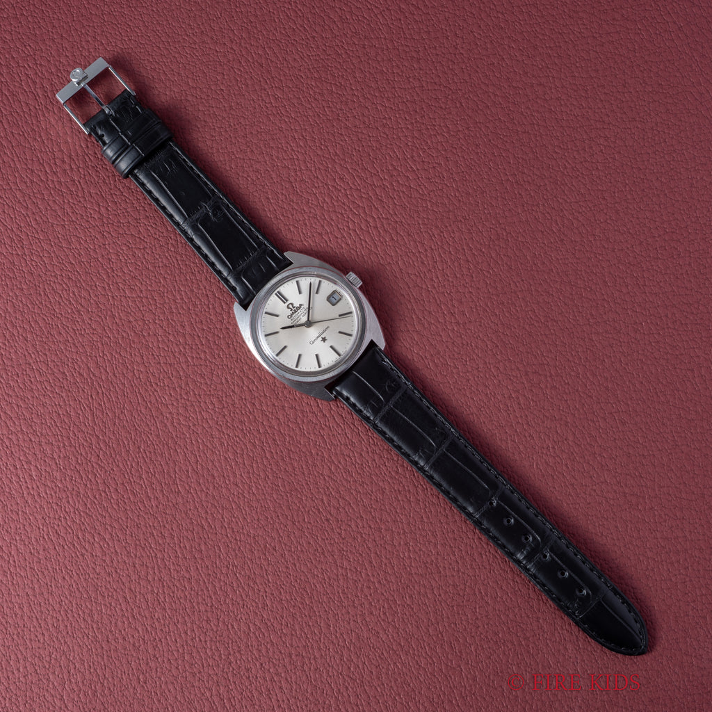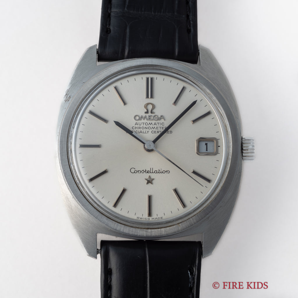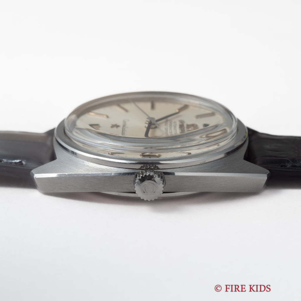 オメガ コンステレーション 1971年製 Ref.168.017 ジェンタ クロノメーター Cal.564 自動巻き 純正尾錠付きです。世界一有名な時計デザイナーとして知られるジェラルド・ジェンタ氏の代表作の一つです。ブラックペイントが施された針とインデックスは視認性も良いです。ムーブメントはクロノメーターのCal.564を搭載、リューズを2段階でカレンダーを早送りできます。手巻きや針回し操作もスムーズです。ベルトはファイアーキッズオリジナルのクロコダイル革ベルトに純正尾錠が取り付けてあります。こちらは箱が付属します。