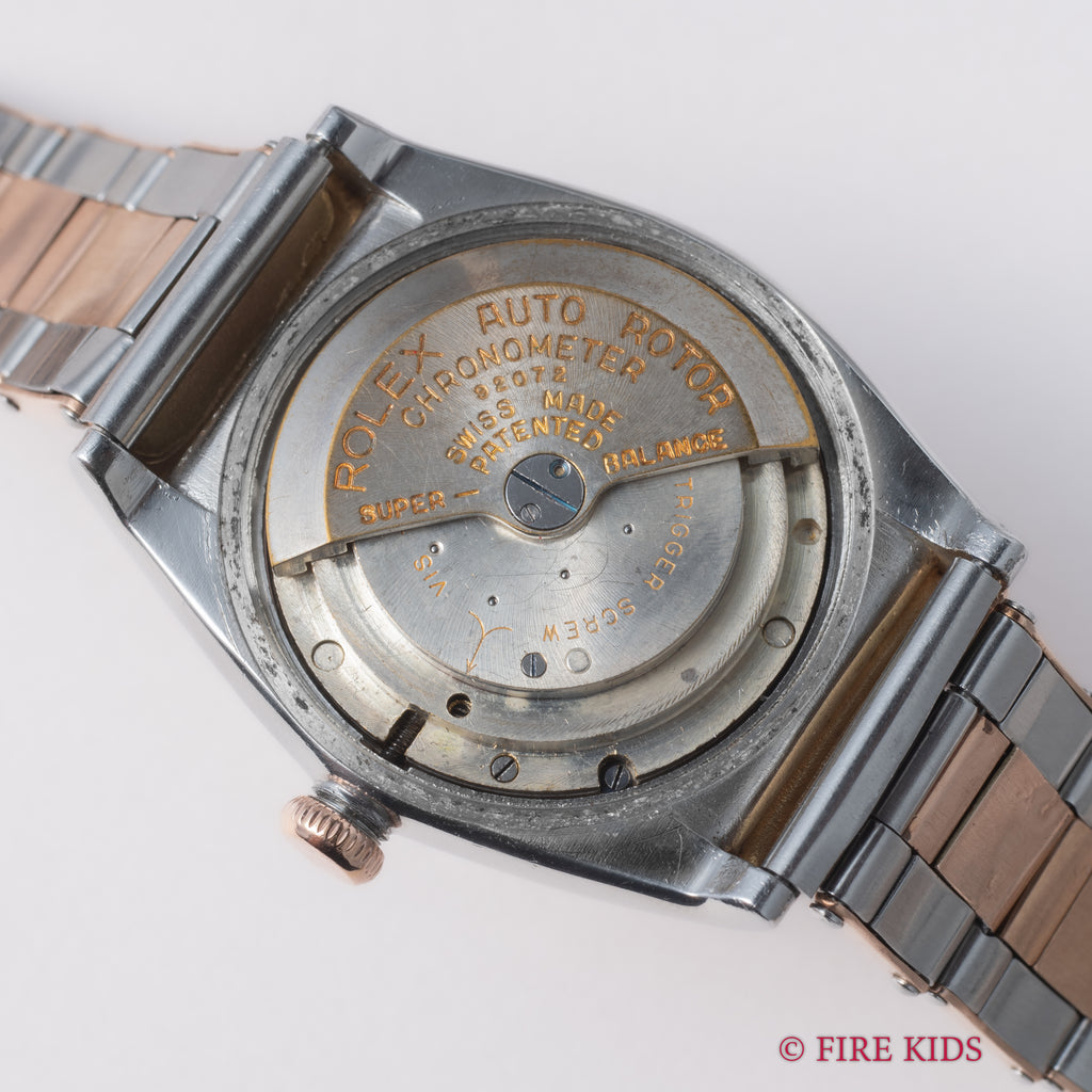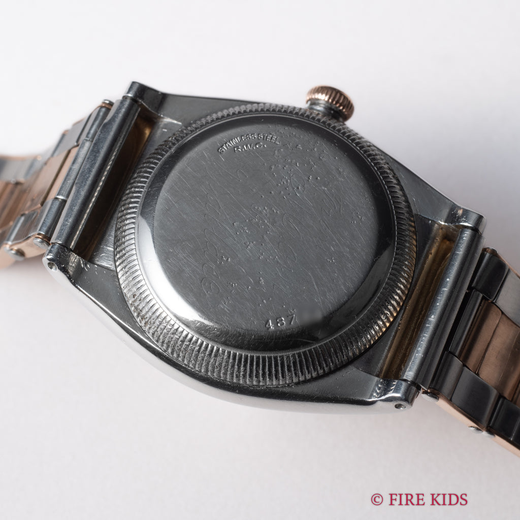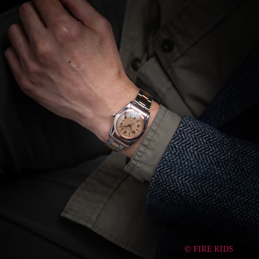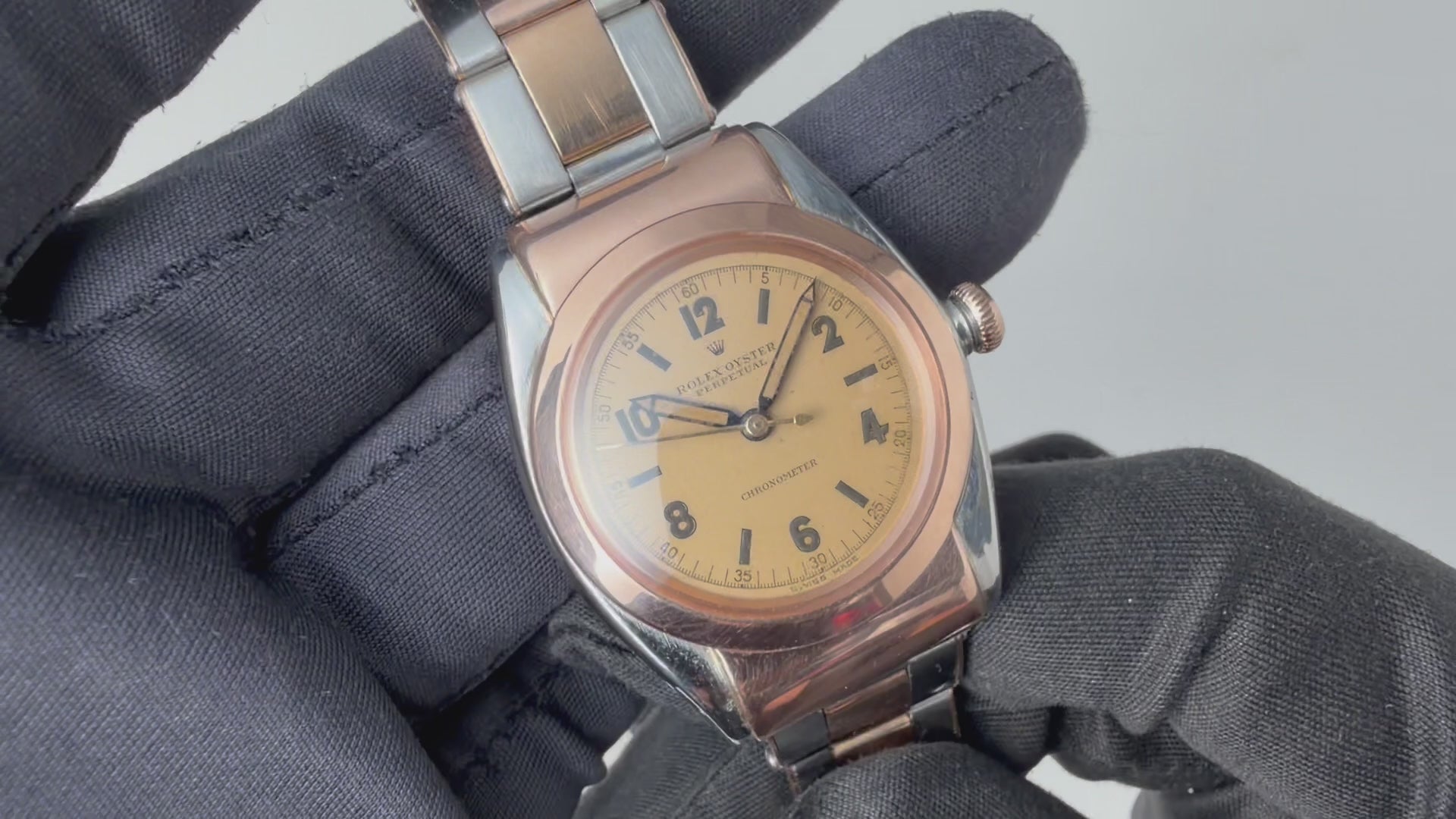 ロレックス バブルバック フーテッド ピンクゴールドコンビ 1940年代製 飛びアラビアダイヤル 純正コンビブレスの入荷になります。フーテッドはカバードとも呼ばれるラグの間にカバーが取り付けられたバブルバックでも希少なモデルになります。しかもピンクゴールドのコンビという所も魅力的です。文字盤はピンクダイヤルで表面に変色が見られますが抜群の雰囲気になっています。針の夜光は入れ直しされていますが雰囲気は損なわれていません。ケースは小傷が見られますが大きなダメージはありません。手巻きや針回しの操作はスムースです。ブレスは純正のPGコンビですが、バックル部分は後年に純正に交換されています。