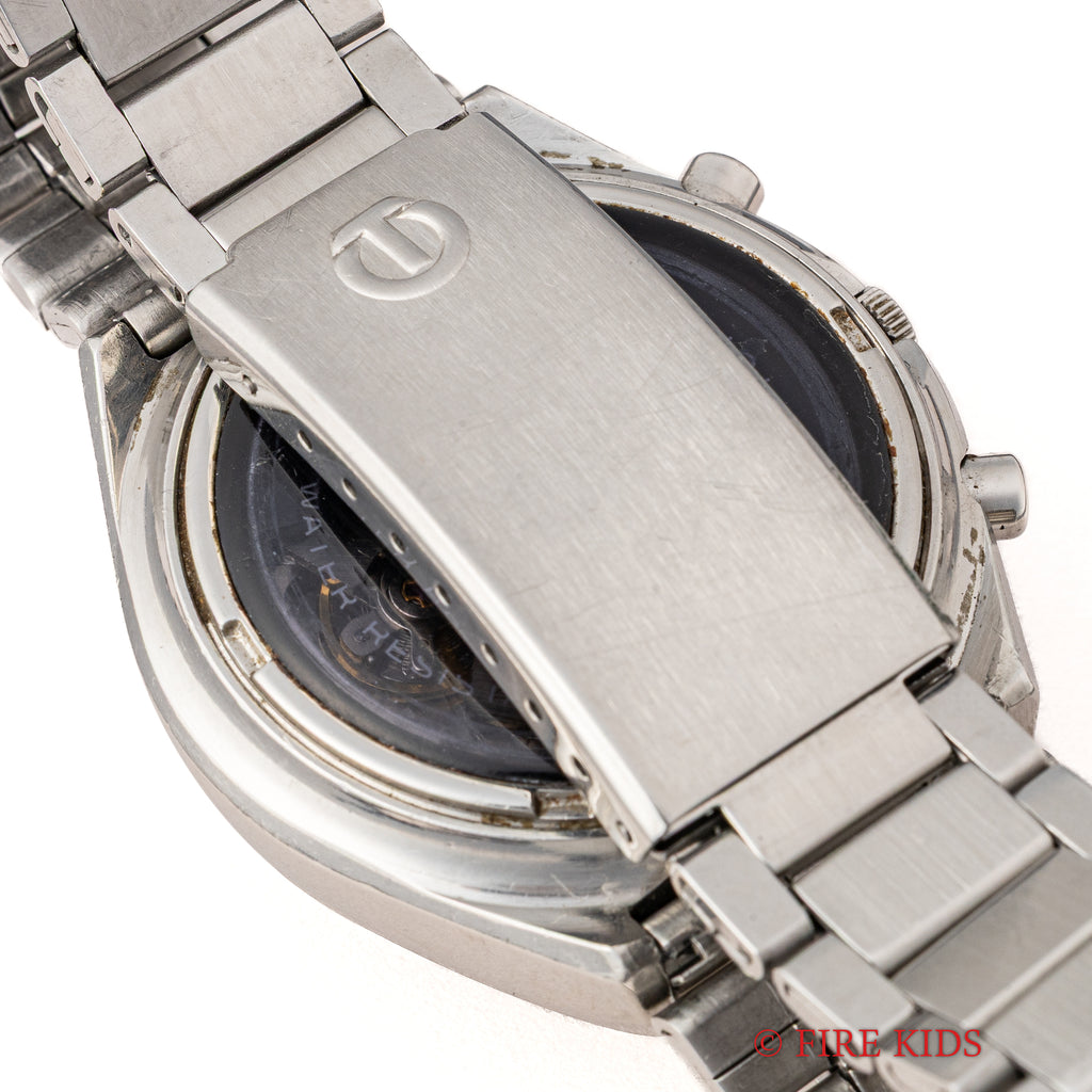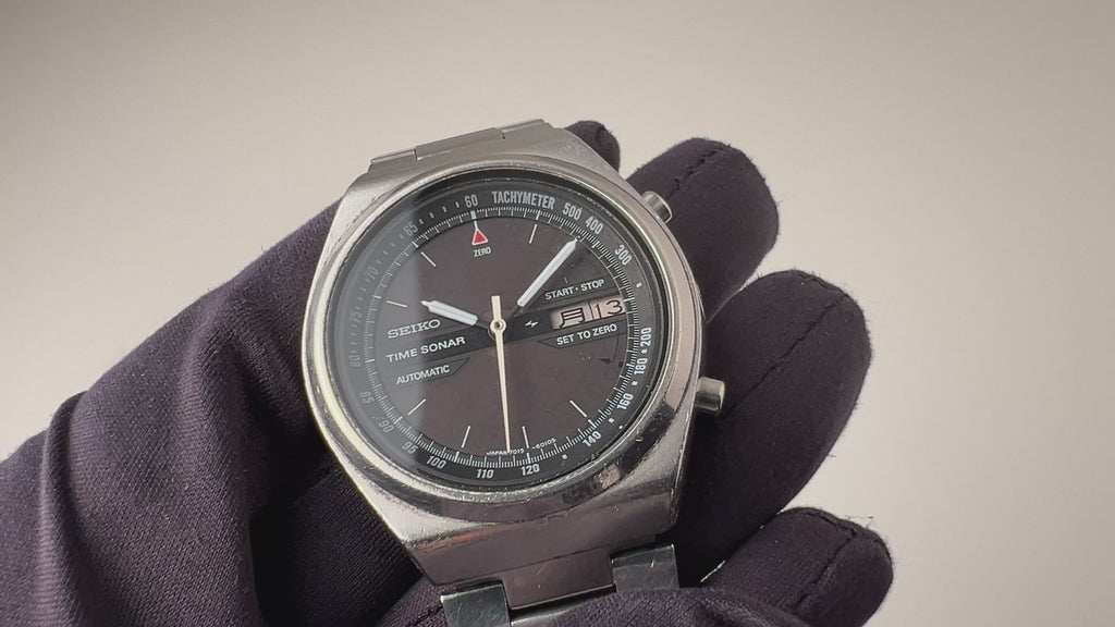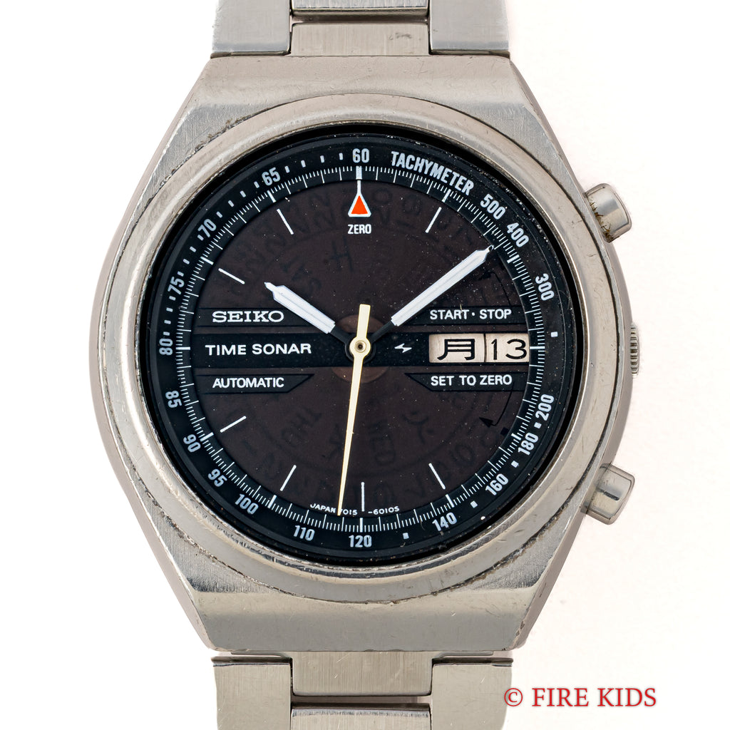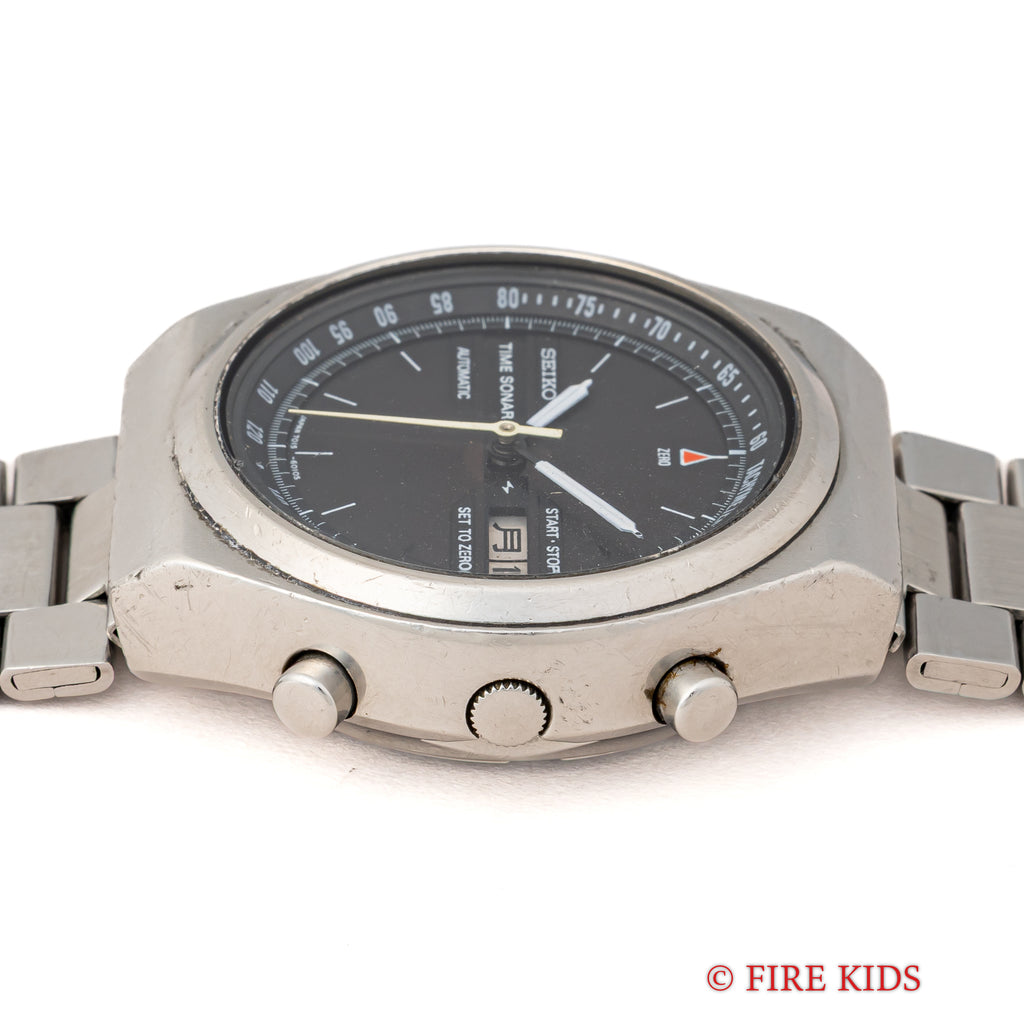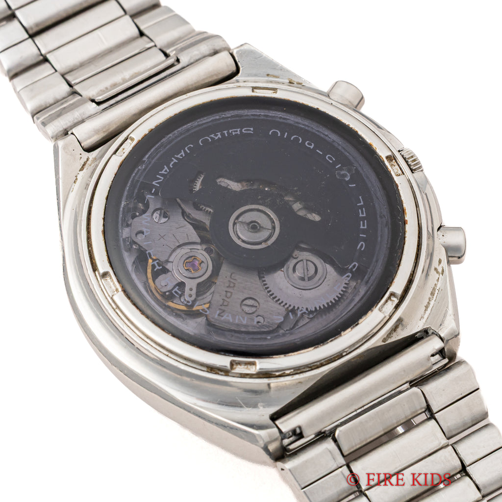 セイコー タイムソナー 1970年代製 裏蓋スケルトン 自動巻クロノグラフの入荷になります。1970年代らしい近未来的なデザインで裏蓋はスケルトン仕様になっています。ダイヤル側からもカレンダーディスクが透けて見えるのも面白いですね。小傷はありますが大きなダメージ無くまだまだご使用いただけます。ムーブメントは自動巻クロノグラフのCal.7015が搭載されています。ベルトは社外の金属ブレスを合わせています。