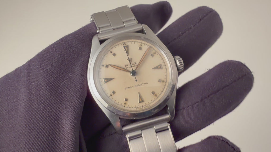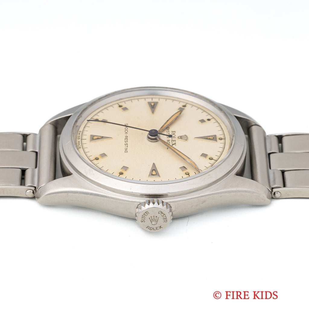 ロレックス オイスター ローヤル 1951年製 Ref.6144 手巻 スーパーオイスターリューズ PEブレスの入荷になります。ロレックスの手巻きモデルオイスターでも個性的な角と三角のインデックスにプロペラハンド、ブルースチール秒針、やや大きめなスーパーオイスターリューズとヴィンテージの魅力が詰まっています。文字盤は針灼けが見られ良い雰囲気になっています。ケースは小傷が見られますが大きなダメージはありません。手巻きや針回しの操作はスムースです。ベルトは社外の3連ブレスが取り付けされています。こちらの時計は分解掃除済みです。