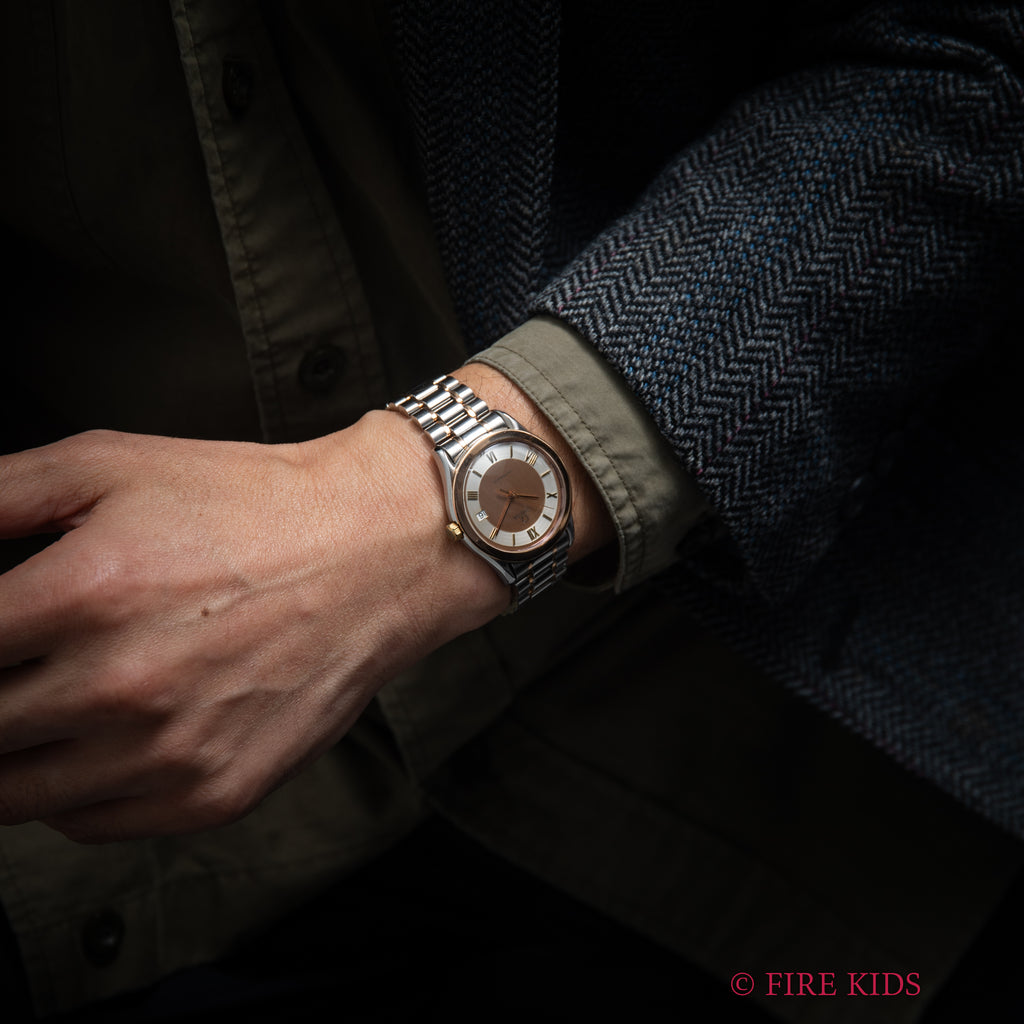 オメガ クラシック PGコンビ 1991年製 ツートーンローマンダイヤル 自動巻 Ref.166 0295 Cal.1110 純正コンビブレスの入荷になります。1940~50年代を思わせるツートーンの文字盤のオメガ クラシックです。ピンクゴールドとのコンビで独特の魅力があります。文字盤はシミ等無く綺麗です。ケースは小傷が見られますが大きなダメージはありません。リューズにメッキの剝がれが見られます。ベルトは純正コンビブレスが取り付けられています。