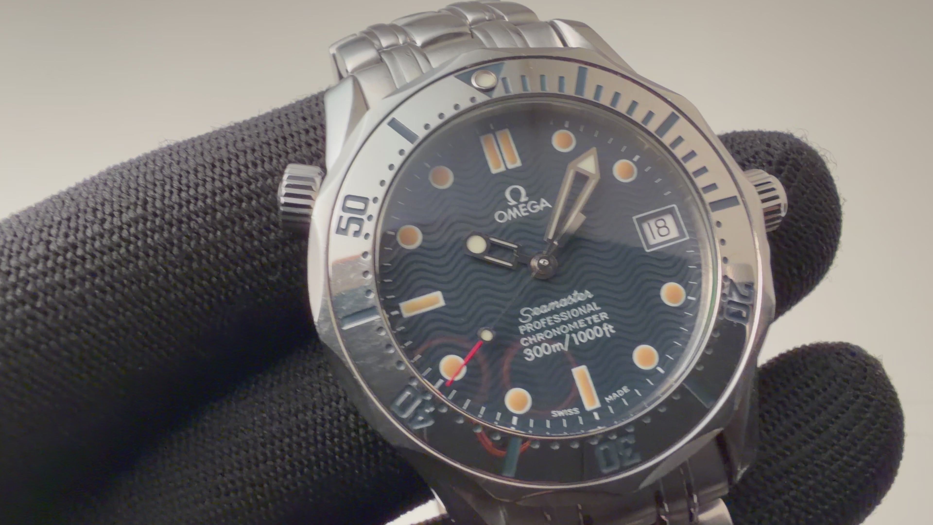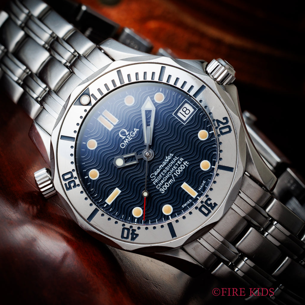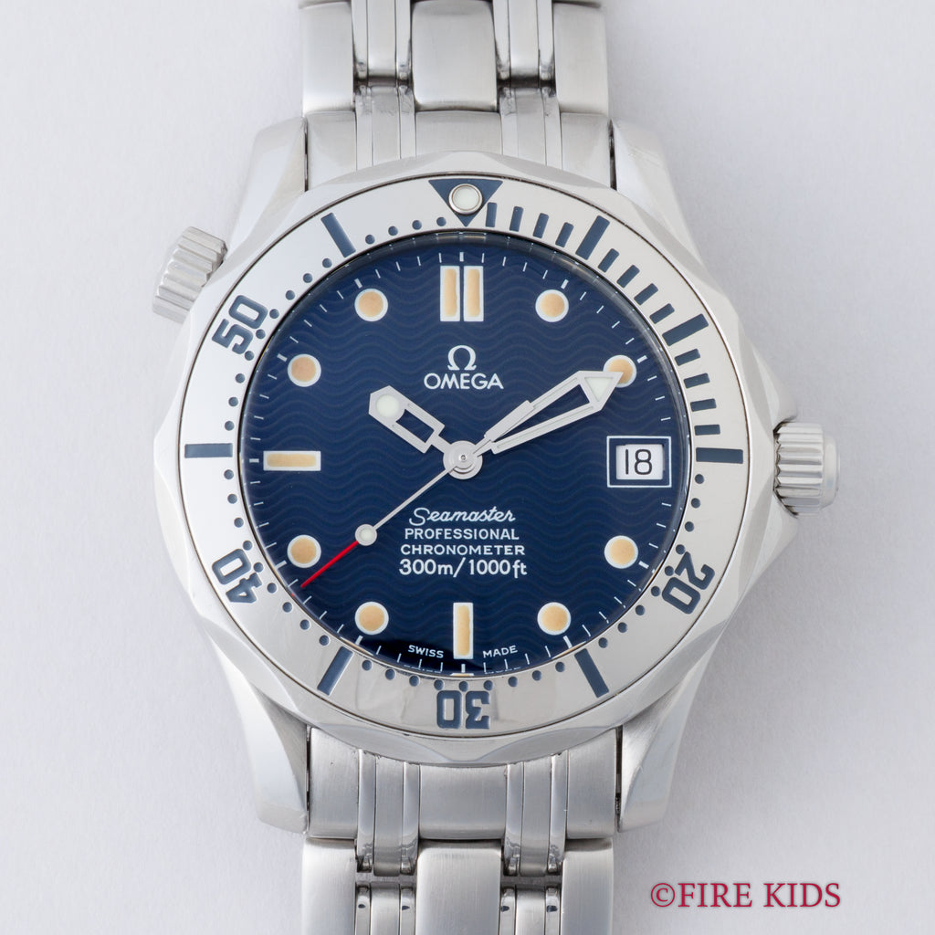 オメガ シーマスター プロフェショナル300m 1986年製 自動巻クロノメーター 純正ブレス 箱付の入荷になります。36㎜サイズながらも10時位置にエスケープバルブを備えたプロフェッショナル仕様で、回転ベゼルはスレ傷がいくつかありますが色抜けは少なく爽やかなブルーカラーを維持しています。ダイヤル夜光の痛みとマッチした良い雰囲気です。手巻きや針回しファンクションは問題ありません。ベルトは純正ステンレスブレスが取り付けされています。箱付きになります。