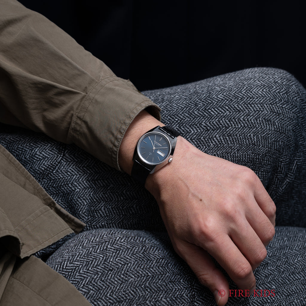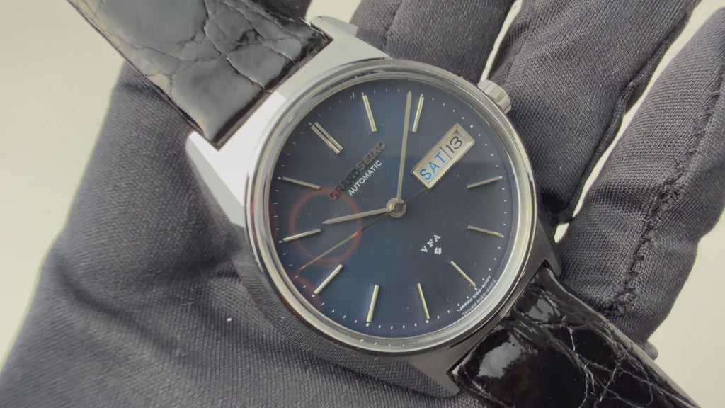 グランドセイコー VFA 1973年製 Ref.6186-8000-G 10振動 自動巻 ダークブルーダイヤル 純正尾錠の入荷になります。諏訪セイコーから製造された当時月差±1分以内という超高精度の調整が施された特別調整品(Very Fine Adjusted)です。希少なV.F.Aでも少ないダークブルーの文字盤で曜日表記は英語と日本語が選べるデイデイトです。ムーブメントは10振動(36000振動)で自動巻きのCal.6186Aを搭載。文字盤のコンディションは良好です。ケースは全体に小傷がありますが、磨きを感じないシャープな状態です。手巻きや針回しの操作はスムースです。ベルトは社外の革ベルトに純正尾錠が取り付けられています。こちらの時計は分解掃除済みです。こちらの時計は分解掃除済みです。過去にメーカーで修理した際の修理明細書が付属します。