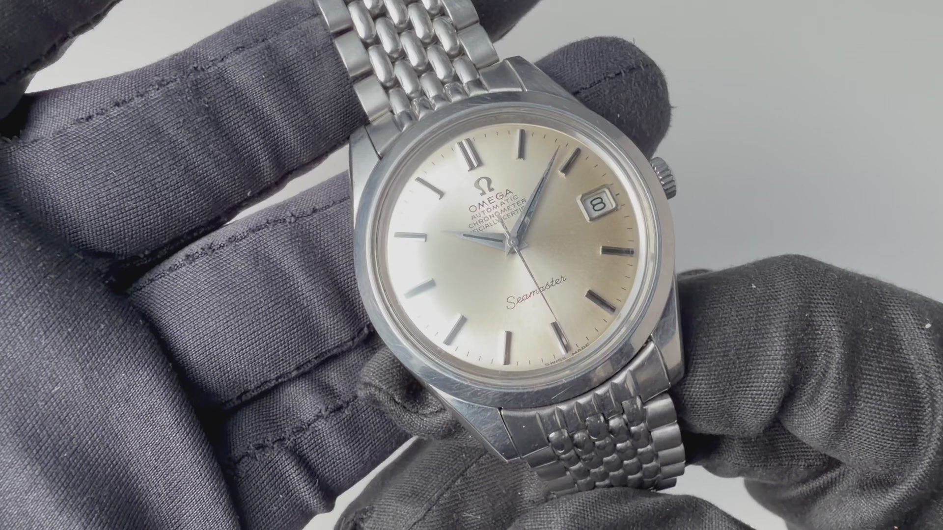 オメガ シーマスター クロノメーター 1969年製 自動巻 Cal.564 純正ライスブレスの入荷になります。シルバー文字盤とドーフィンハンドのシンプルで飽きの来ないデザインが魅力的な個体です。ムーブメントはクロノメーター仕様のCal.564を搭載、リューズを引っ張ることでカレンダーの早送りが出来るタイプです。ケースは小傷はございますが大きなダメージはございません。手巻きや針回しの操作はスムーズです。ベルトは純正ライスジュビリーが取り付けています。こちらの時計は分解掃除済みです。