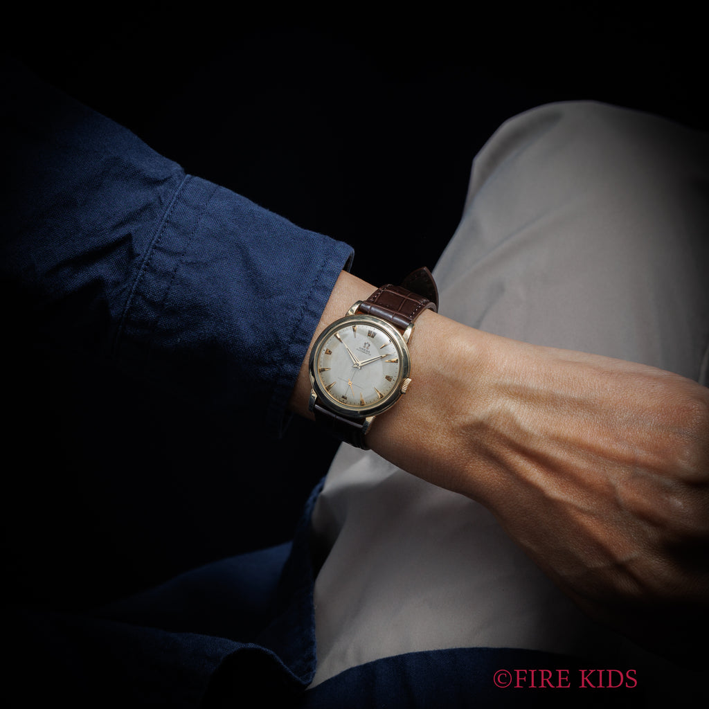 オメガ Ref.F6231 1952年製 バンパー式オートマチック Cal.344 14金張りです。楔インデックスにドーフィンハンドを配したヴィンテージらしい顔付きの一本です。文字盤経年はありますが良い雰囲気です。バンパー式オートマチックを搭載し、ローターがバネにあたる可愛らしい音が楽しめます。14金張りケースは小傷はありますが大きなダメージはありません。ベルトはファイアーキッズオリジナルのクロコダイル革ベルトを合わせています。手巻きや針回しはスムーズです。