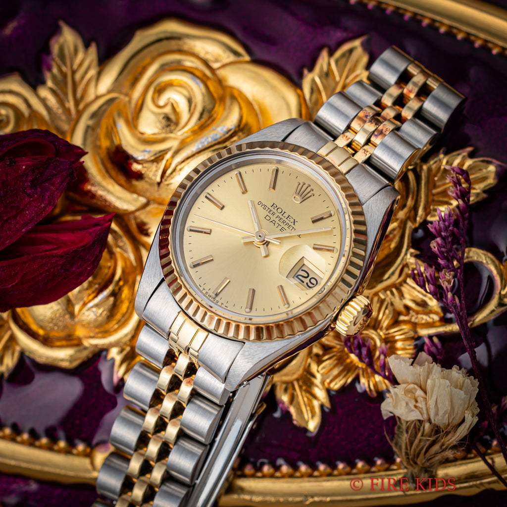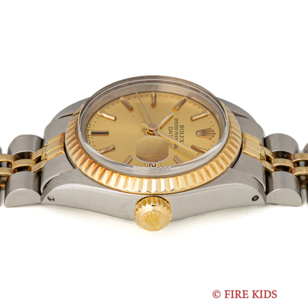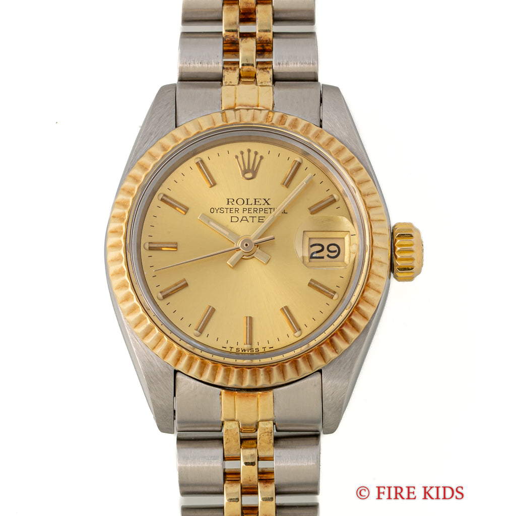 1980年製のロレックス オイスターパーペチュアルデイト レディースです。ステンレスとイエローゴールドの華やかなコンビモデルです。イエローゴールドのフル―テッドベゼルにシャンパンゴールド文字盤とバーインデックスのスタンダードな組み合わせで使いやすいモデルです。ムーブメントは自動巻きのCal.2030を搭載。手巻きや針回しの操作はスムースで、リューズのねじ込み具合も問題ありません。ベルトは純正巻きジュビリーブレスが装着されています。こちらは分解掃除済みになります。