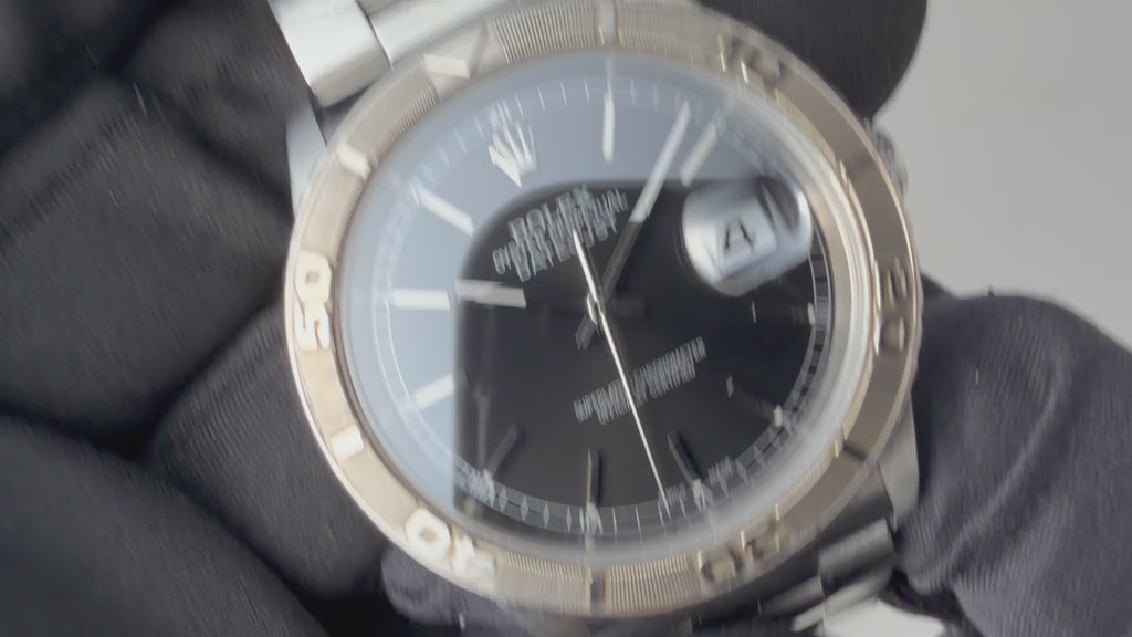 ロレックス サンダーバード 2002年製 Ref.16264 デイトジャスト ブラックダイヤル 3連オイスターブレスの入荷になります。ホワイトゴールドの回転ベゼルと、外周に小さくローマ数字が入ったブラック文字盤が特徴的な一本です。ムーブメントは名機のCal.3135を搭載。文字盤はシミ等無く綺麗です。ケースは小傷が見られますが大きなダメージはありません。手巻きや針回しの操作はスムースで、ねじ込み具合も問題ありません。ベルトは純正ステンレスブレス(78360/FF558B)が取り付けてあります。