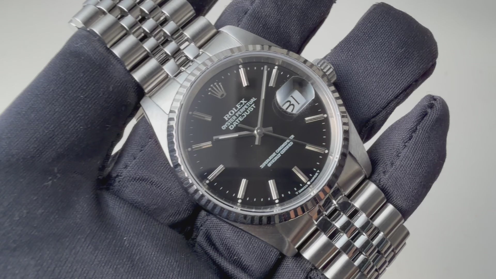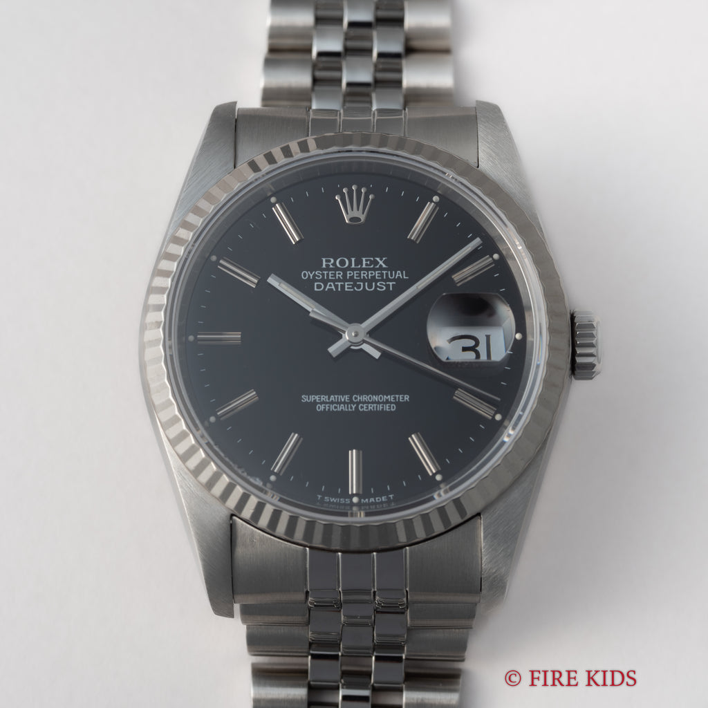 ロレックス デイトジャスト 1987~1988年製 Ref.16234 ブラックダイヤル 純正ジュビリーブレスです。使いやすい王道のステンレスモデルで文字盤は艶ありのブラック文字盤にホワイトゴールドのベゼルの組み合わせです。機械は完成度の高いCal.3135を搭載しております。手巻きや針回し、ねじ込みリューズの操作はスムースです。ベルトは純正ジュビリー62510H/FF555Bが取り付けてあります。手巻きや針回し、ねじ込みリューズの操作はスムースです。