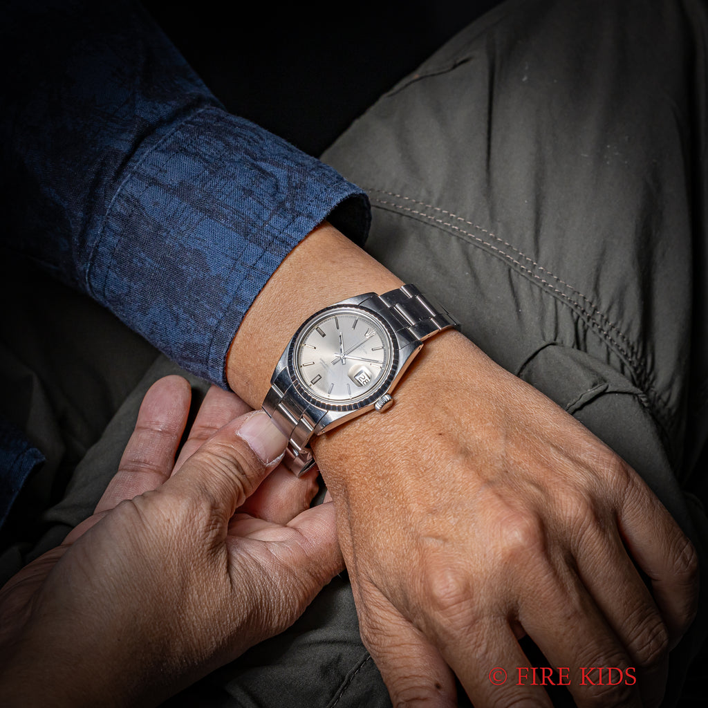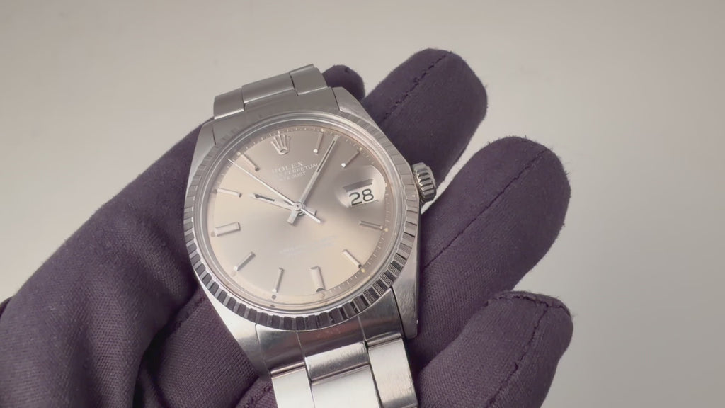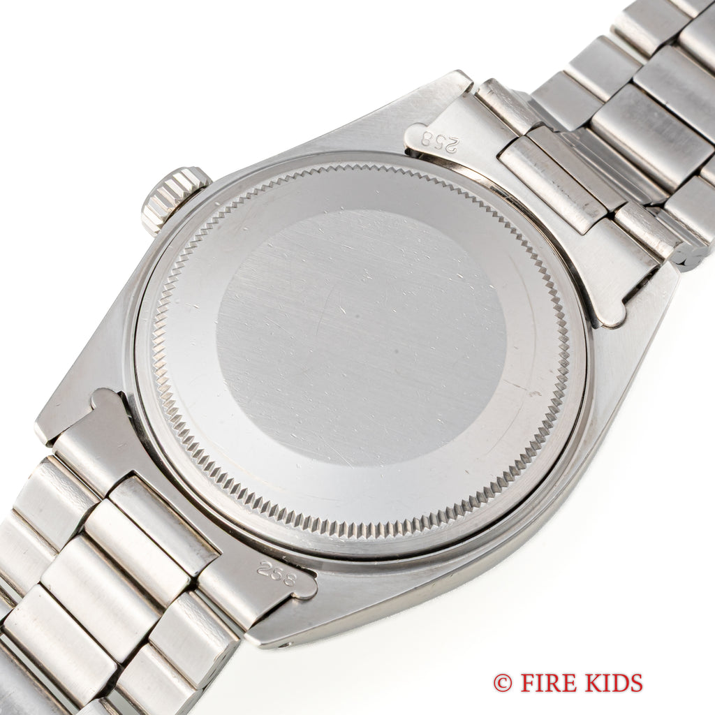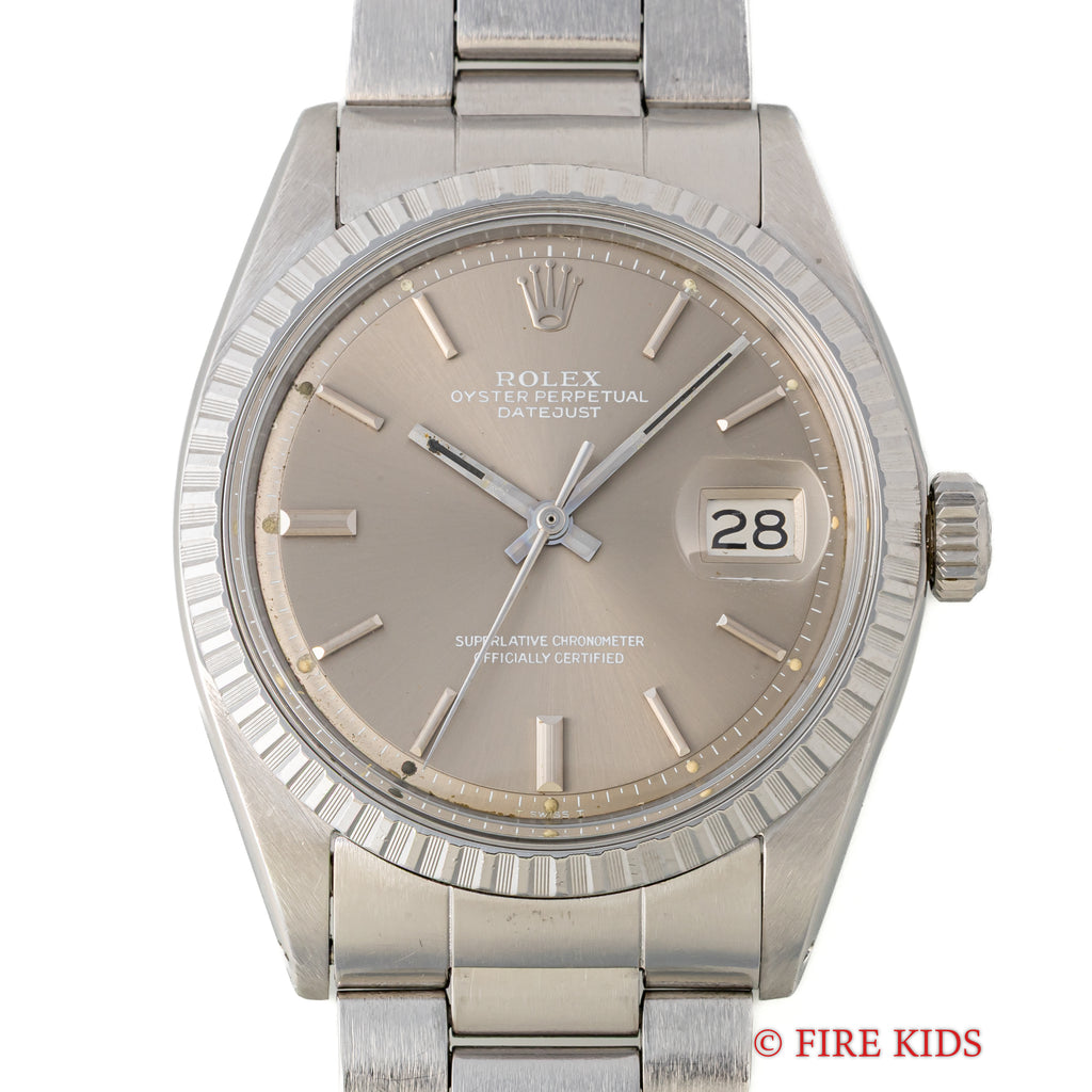 ロレックスのデイトジャスト グレーダイヤル1971年製です。定番のデイトジャストでもグレーダイアルにバーインデックスは魅力があります。文字盤は劣化も少なく良い状態です。ケース、ブレスに小傷などが見られますが大きなダメージはありません。ムーブメントは綺麗です。手巻きや針回しの操作はスムースです。純正巻きのジュビリーブレスが取り付けられています。こちらは分解掃除済みになります。