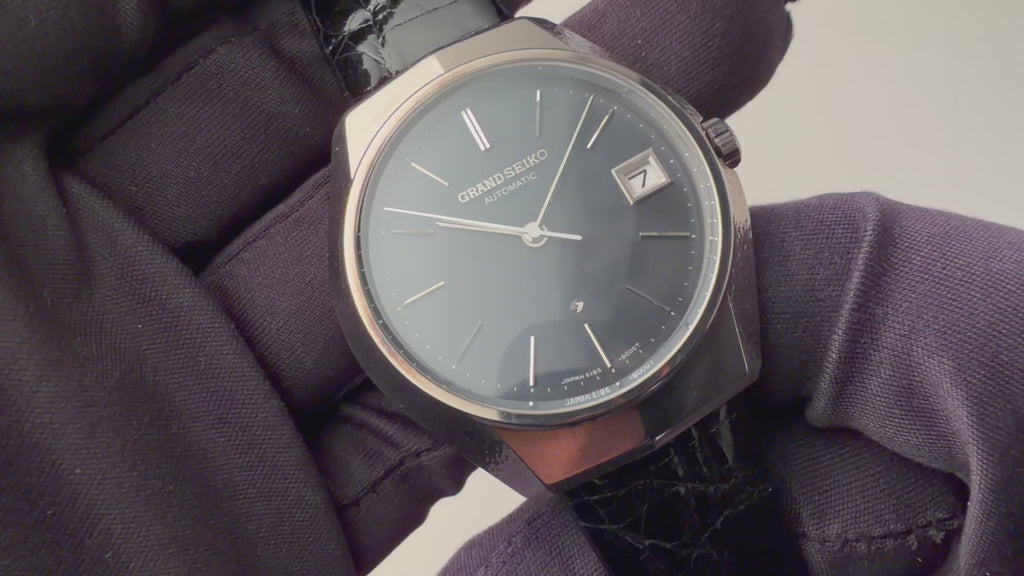 セイコー グランドセイコー 61GS V.F.A 銀パラ 1968年製です。1968年12月にのみ製造された希少なモデルで、ケースに銀パラジウム合金を採用したスペシャルな一本です。ダイヤルにV.F.A表記がない初期型で、多少の経年はありますがプリントの剥がれなどはありません。ケースは小傷はあるもののケースエッジの残るグッドコンディションで、素材にシルバーが混ざっていることからやや黒ずんでいて雰囲気があります。当時月差±1分を保証するというV.F.A企画をクリアしたCal.6185Aを搭載し、手巻きや針回し、カレンダー早送りはスムーズです。社外の艶有クロコに純正尾錠を合わせています。こちらは分解掃除済みです。