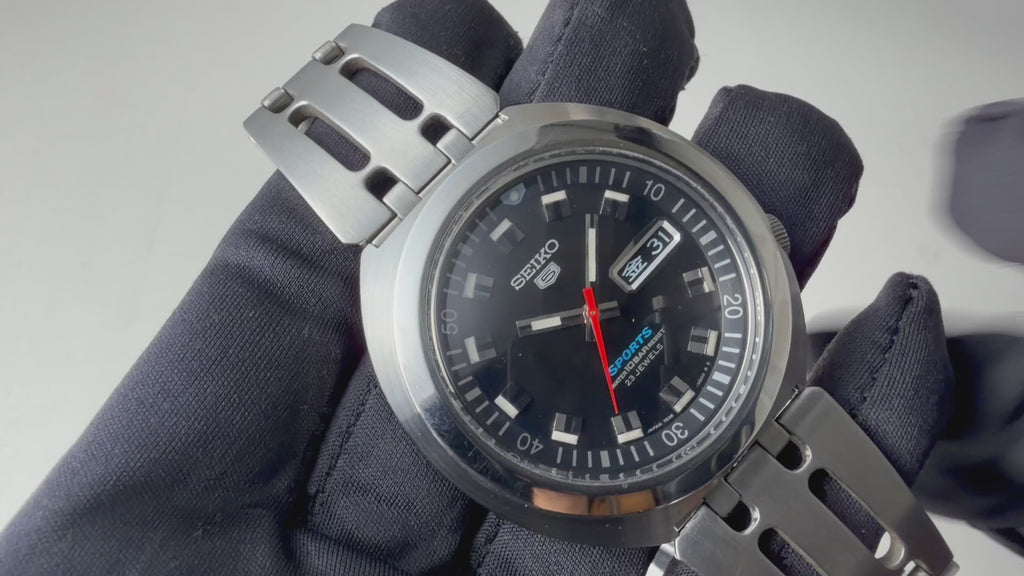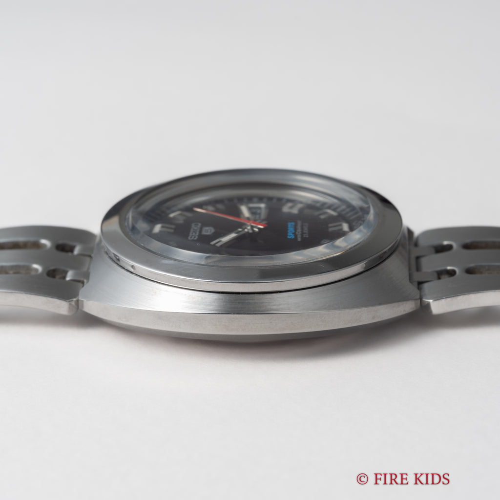 セイコー 5スポーツ 復刻モデル 1997年製 Ref.7S36-0060 Cal.7S36A 自動巻きです。70年代の復刻モデルで1997年製になります。デザインは大きな変化はなく復刻し、ブレスのバックル部分がサイドをプッシュする仕様に変わっています。機械はCal.7S36Aを搭載し、手巻き機能はありません。ベルトは純正ブレスが付いています。インナーベゼルの回転具合や日付早送り、針回しはスムーズです。
