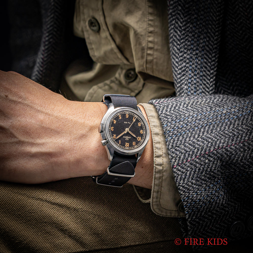 1954年に最初に支給され、1960年代中頃までスウェーデン軍に納入されたレマニアのTg195です。裏蓋はラージサイズのスリークラウンが刻印されています。「Tg」とはスウェーデン語で「Tid Givare」の略、英語で「Giving Time」です。ハック機能のために秒針を帰零させるプッシュボタンがついた。軍用時計ならではの特殊モデルです。ベルト取り付け部はパリス管(はめ殺し)で、雰囲気のあうナイロン製ベルトを装着しております。