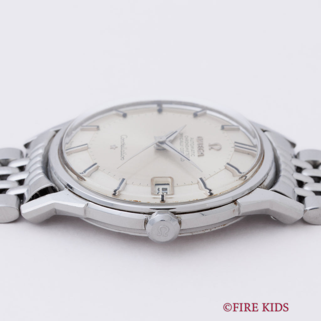 オメガ コンステレーション 12角 1966年製 パイパンダイヤル 自動巻クロノメーター Cal.564 純正ステンレスブレスの入荷になります。オメガの最上級モデル、コンステレーションの中でも人気の12角デザインです。文字盤は年代なりの経年は見受けられます。ケースは小傷が見られますが大きなダメージはありません。ムーブメントは自動巻きクロノメーターのCal.564を搭載しています。手巻きや針回しもスムーズです。ベルトは純正ステンレスライスブレスが取り付けられています。