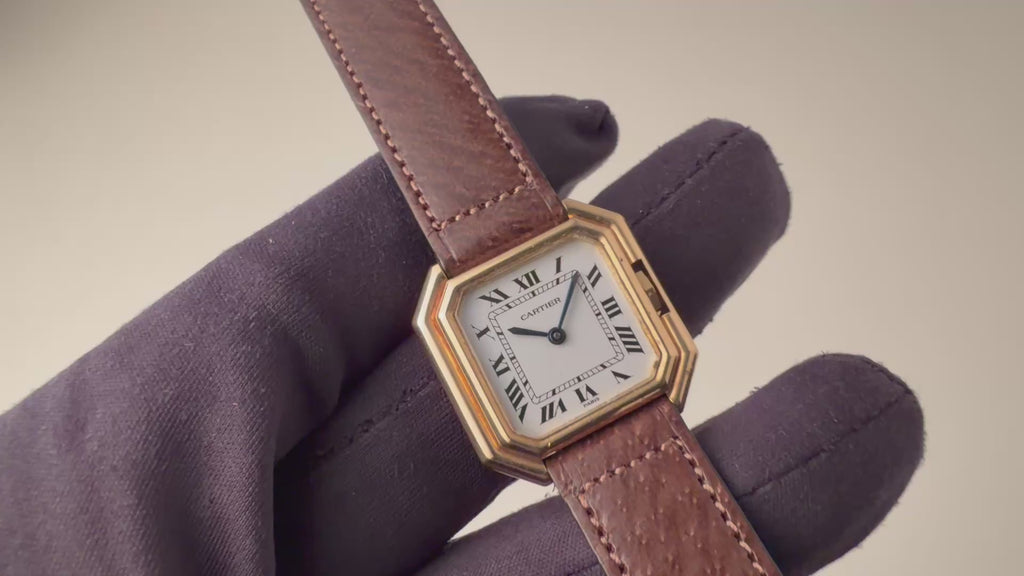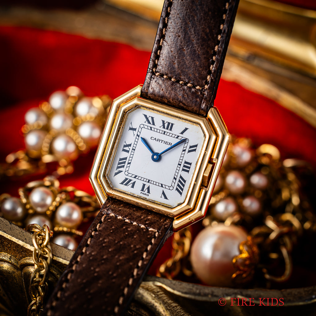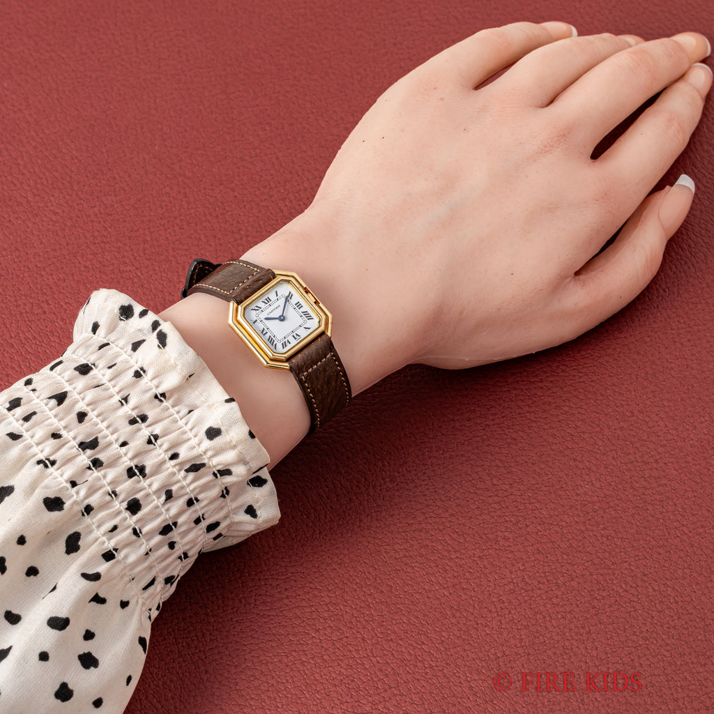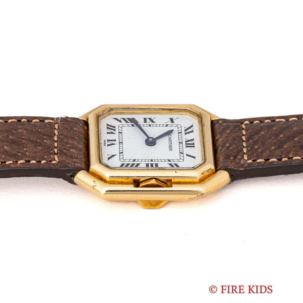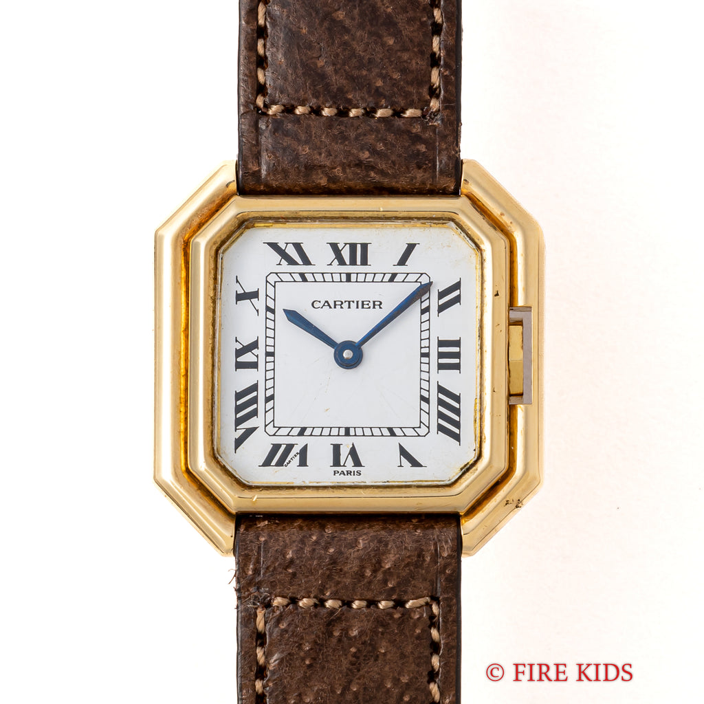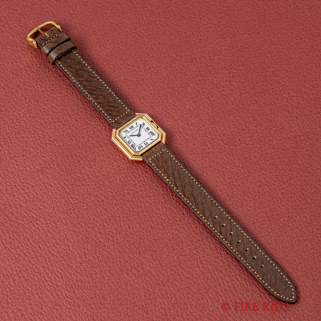 カルティエ サンチュール SMサイズ 18金無垢イエローゴールド 1970年代製 手巻き 純正尾錠付きです。レディースサイズで金無垢のオクタゴンケースはお洒落で上品な組み合わせです。カルティエらしいホワイトローマンダイヤルは、クラックはありますがオリジナルのパリス表記のダイヤルです。ケースは小傷がありますが大きなダメージはありません。手巻きや針回しの操作はスムースです。ベルトは社外の革ベルトに純正尾錠を合わせています。こちらは分解掃除済となります。