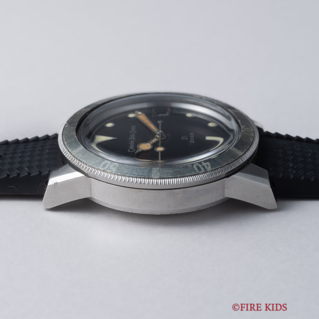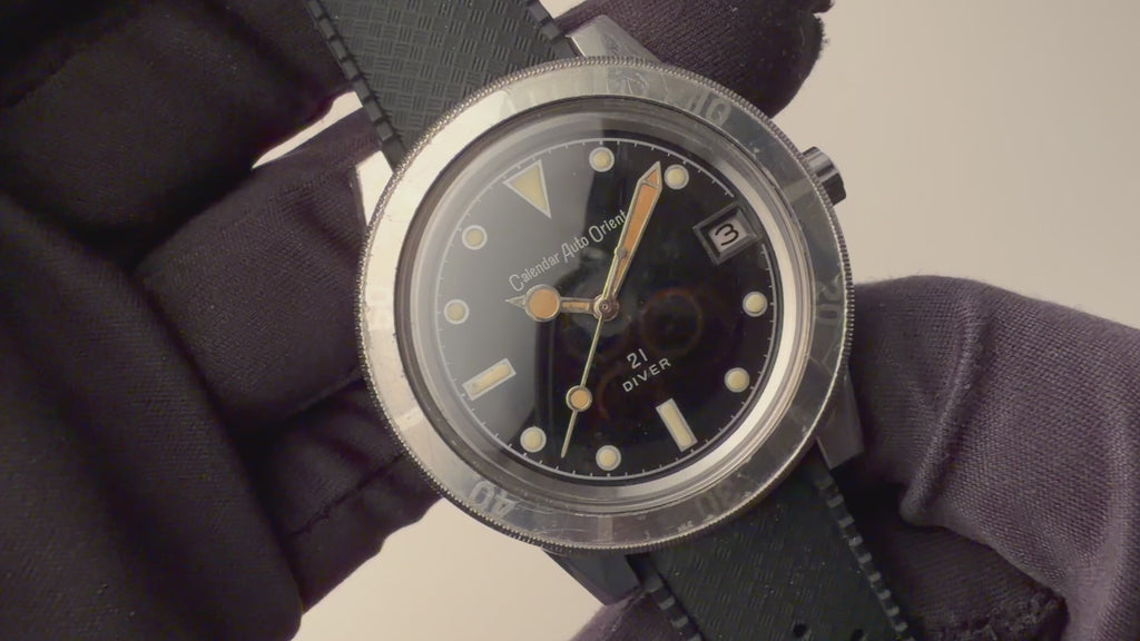 オリエント 21ダイバー ブラックサークルミラーダイヤル 1960年代製 自動巻 カレンダーオートオリエントの入荷になります。艶感がしっかりとしたサークルミラーブラックダイヤルはヴィンテージ感があります。ロリポップの短針も魅力的です。ダイヤルは肉眼では気ならない程度の経年変化はありますが、コンディションは良く、ケースも概ね良好な状態です。ムーブメントの巻き上げもスムーズです。ベルトは社外の雰囲気の合うラバー系素材のものを合わせております。