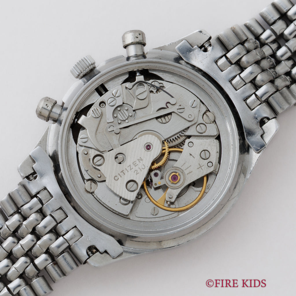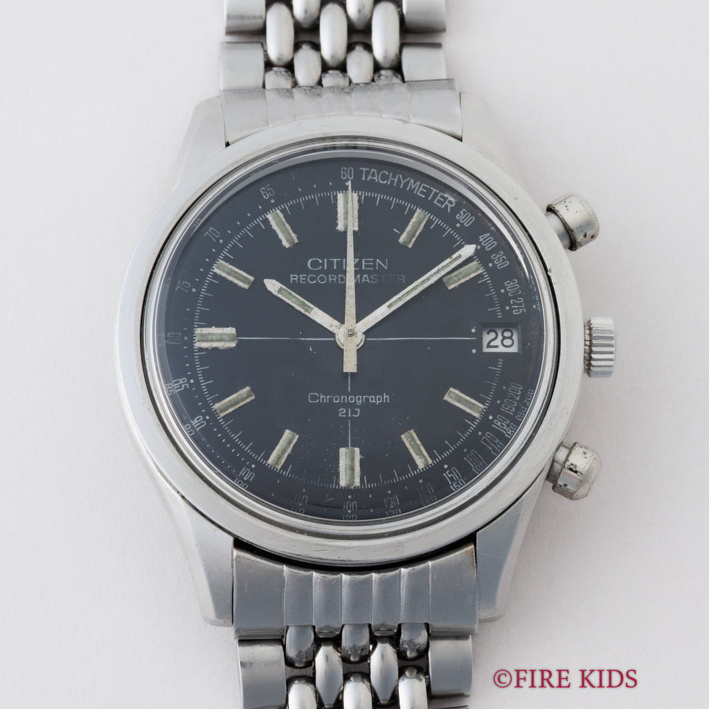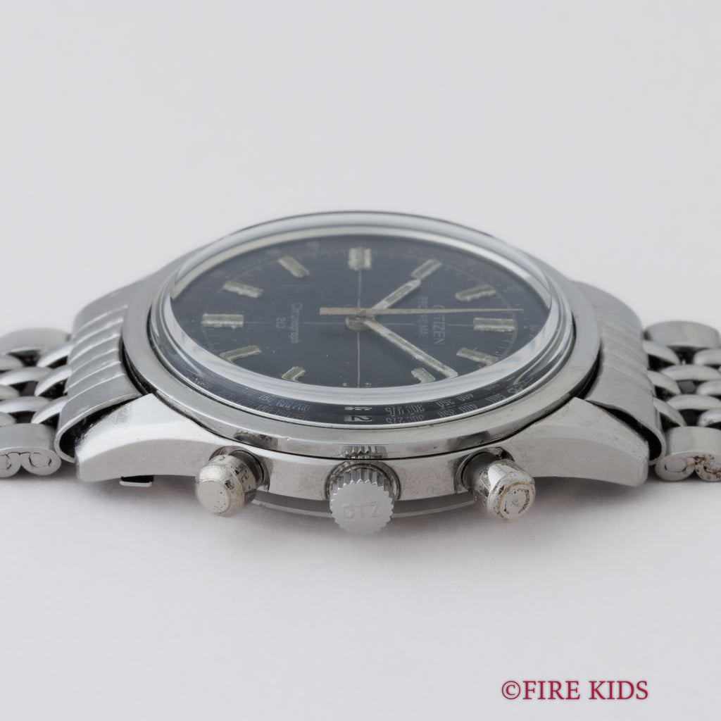 1973年製のシチズンレコードマスターです。フライバック機能搭載のクロノグラフで製造期間も僅か5年というレアなモデルです。ムーブメントは手巻き21石のCal.5702を搭載。手巻きや針回し、クロノグラフの操作はスムースです。ベルトは純正のステンレスブレスが取り付けられています。
