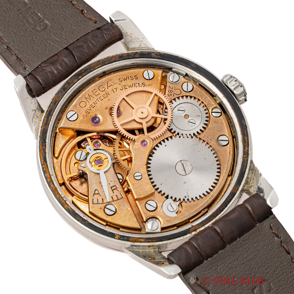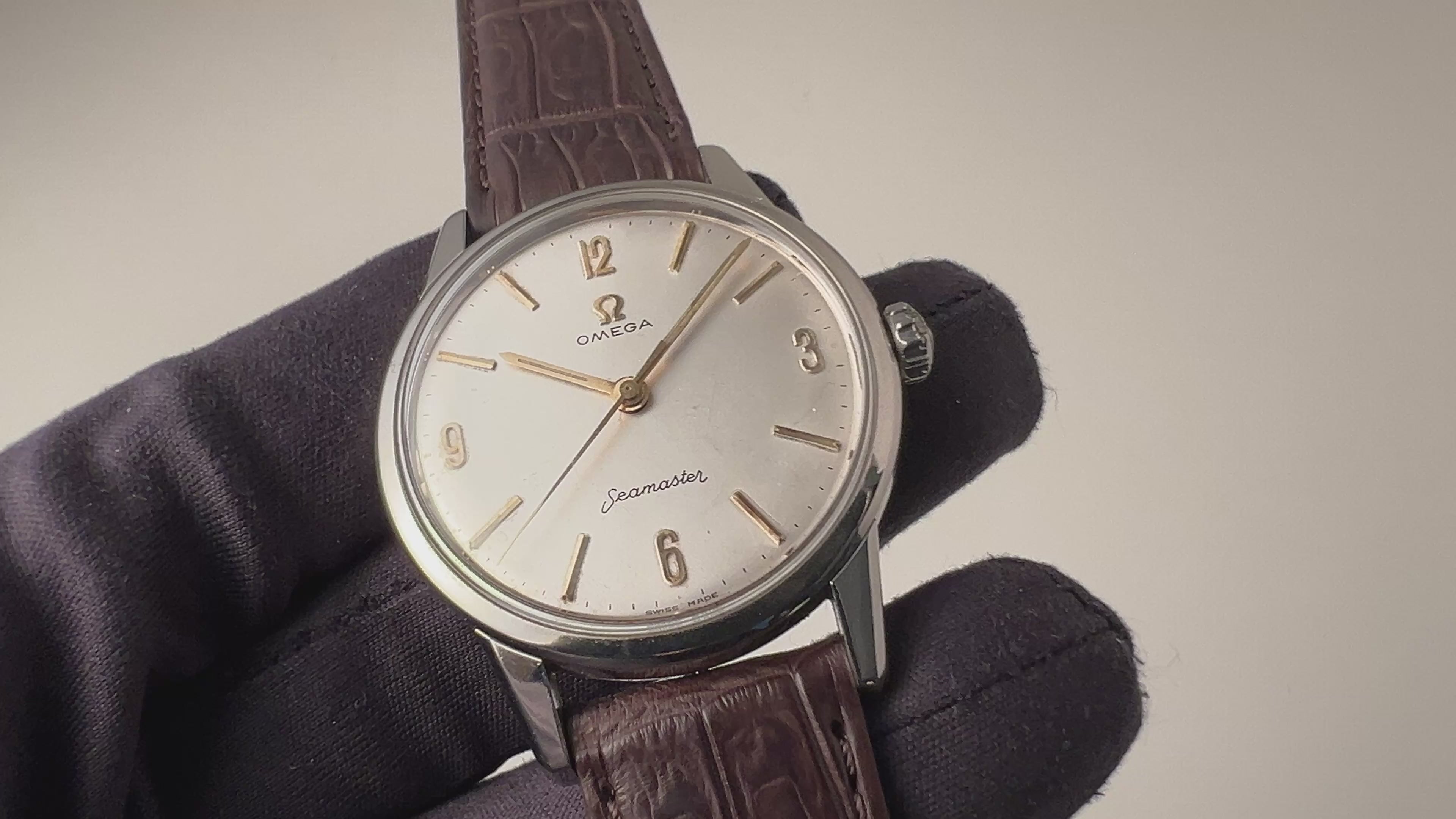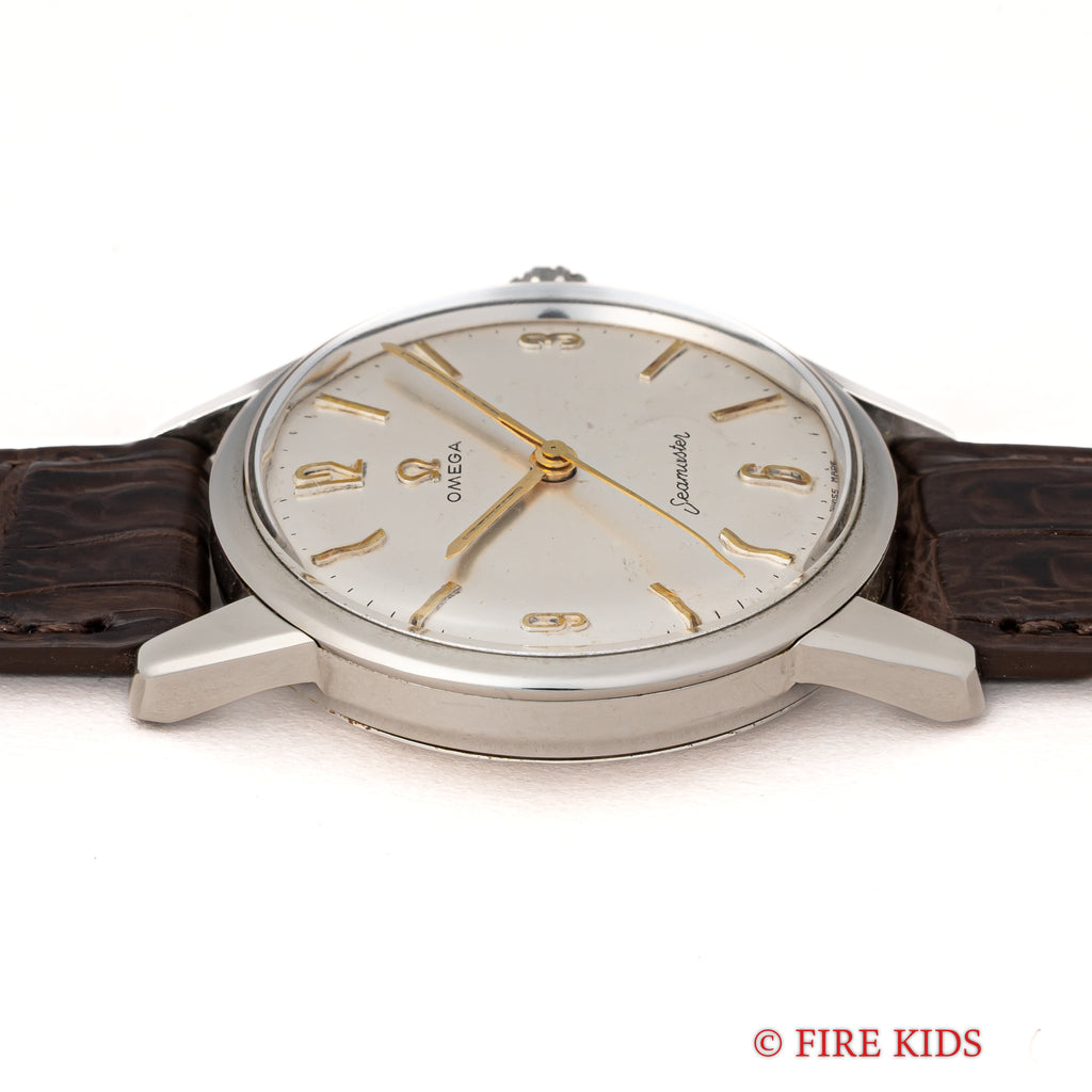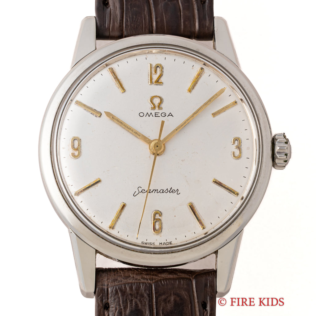 オメガ シーマスター 30mmキャリバー 1961年製 手巻 Cal.285 飛びアラビアダイヤルの入荷になります。オメガの代表的な手巻きキャリバー30㎜シリーズの後期型Cal.285を搭載している珍しい1本です。ラグのしっかりとした防水ケースで存在感があります。ゆったりとしたカーブを描く文字盤や切れ味良さそうな針も魅力的です。ケースは小傷が見られますが大きなダメージはありません。文字盤表面に荒れが見られますが良い雰囲気です。ベルトはファイアーキッズオリジナルのクロコダイル革ベルトが取り付けられています。