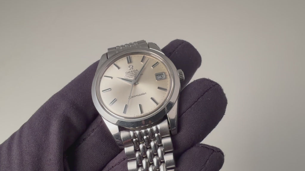 オメガ シーマスター クロノメーター 1969年製 自動巻 Cal.564 純正ライスブレスの入荷になります。シルバー文字盤とドーフィンハンドのシンプルで飽きの来ないデザインが魅力的な個体です。ムーブメントはクロノメーター仕様のCal.564を搭載、リューズを引っ張ることでカレンダーの早送りが出来るタイプです。ケースは小傷はございますが大きなダメージはございません。手巻きや針回しの操作はスムーズです。ベルトは純正ライスジュビリーが取り付けています。こちらの時計は分解掃除済みです。