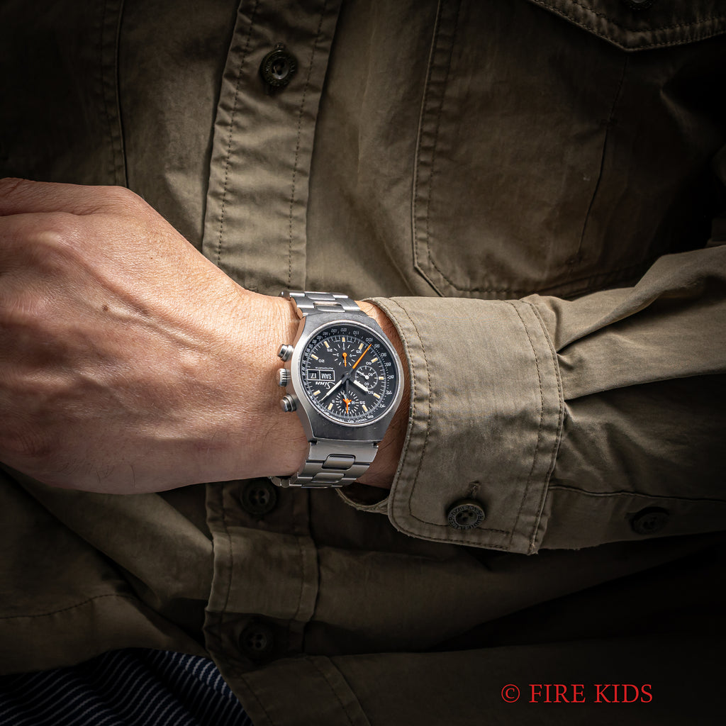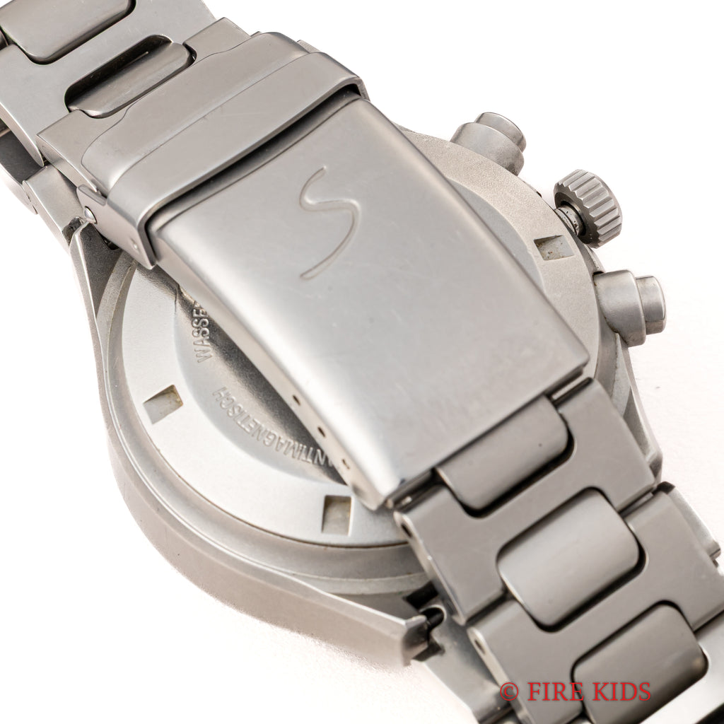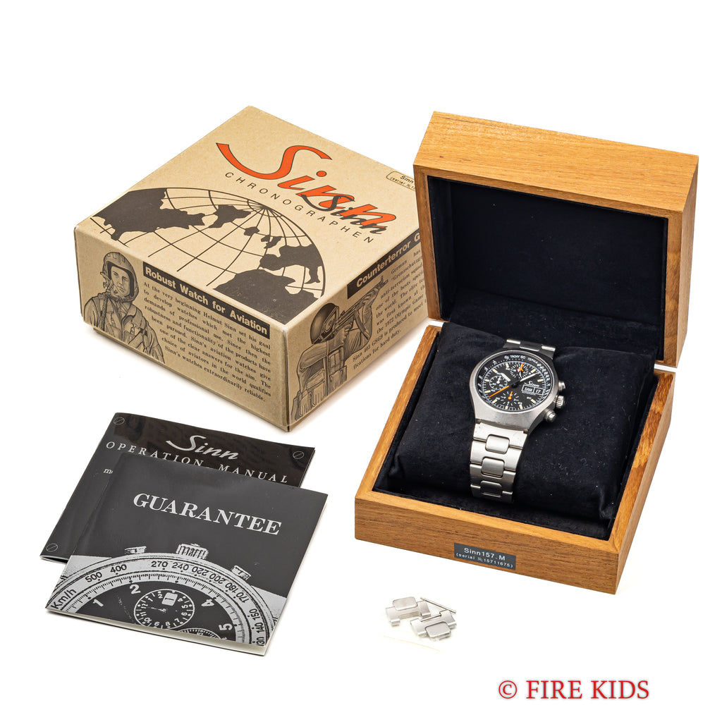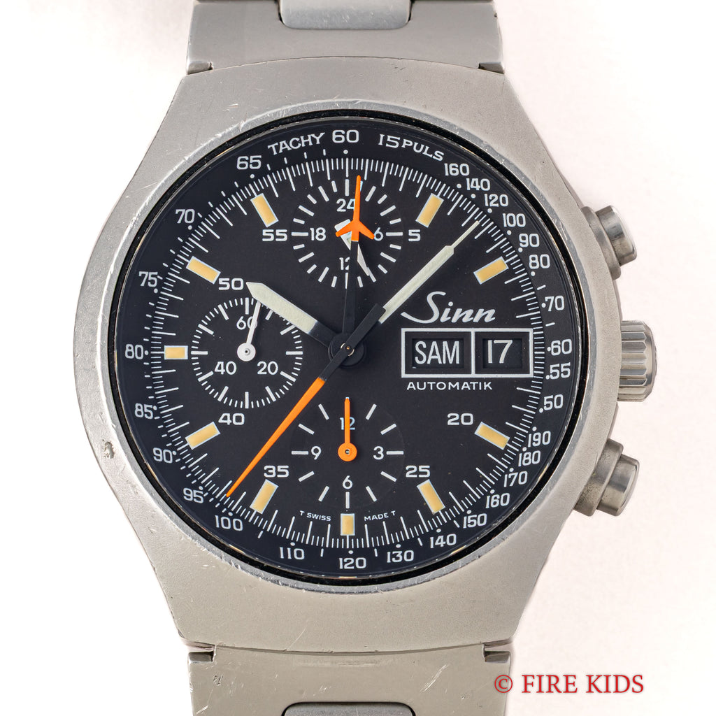 ジン クロノグラフ 157.M 2000年発行ギャラ(平成12年)自動巻 Cal.レマニア5100 純正ブレス 箱ギャラの入荷になります。ジンのパイロットクロノグラフ157Mで珍しいタキメーターとパルスメーター(脈拍計)表記したモデルです。ドイツらしいデザインの艶消しケースでミリタリーウオッチのスペックで製造された計器になっています。文字盤はトリチウム夜光の変色が見られますが良い雰囲気になっています。ケースは小傷が見られますが大きなダメージはありません。ムーブメントは自動巻クロノグラフの名作レマニア5100を搭載しています。ベルトは純正のステンレスブレスが取り付けられています。