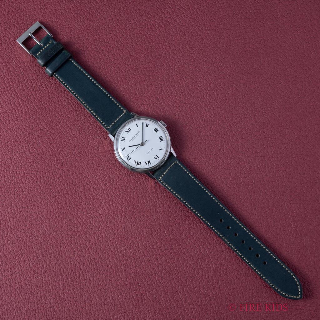 1965年製のIWC ラウンドモデル オートマチック ホワイトローマンダイヤルが入荷しました。ホワイトローマンダイヤルは肉眼で綺麗なコンディションをい維持しています。お魚リューズの残った防水スナップケースは小傷はありますが大きなダメージはありません。ケース形状も厚めで堅牢な雰囲気がありカッコいいです。貴重なノンデイトホワイトローマンダイヤルは入荷も少なくおススメです。ムーブメントはペラトン式自動巻Cal.854を搭載しています。ベルトはアキュレイトフォルムのレザーベルトを合わせています。手巻きや針回しはスムーズです。
