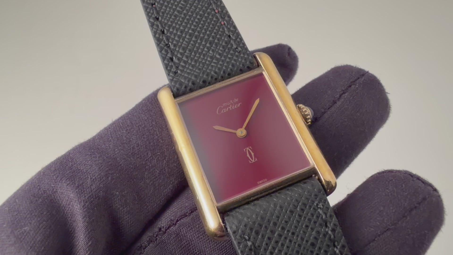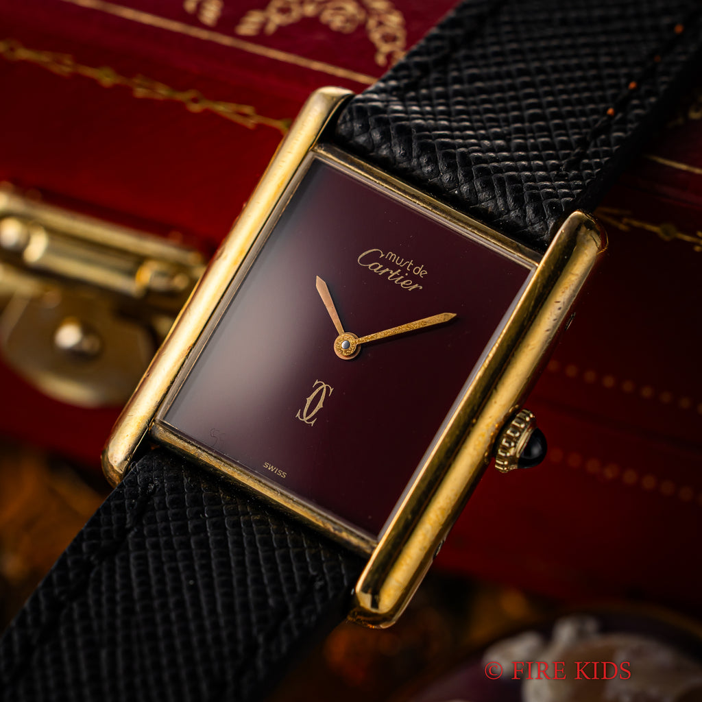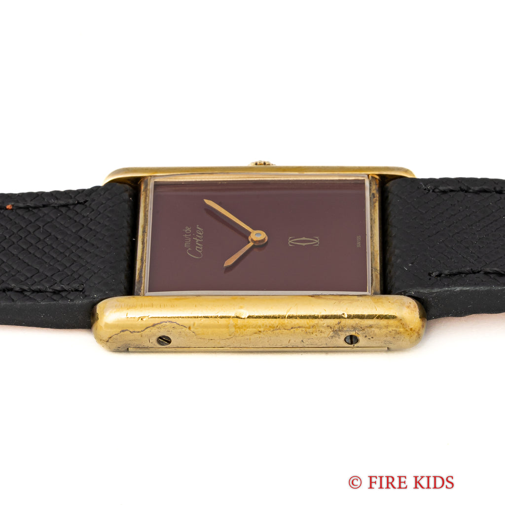 カルティエ マストタンク 1980年代製 LMサイズ 手巻き ガーネットダイヤルの入荷になります。カルティエらしいガーネット色の文字盤はクラックは無く綺麗です。ケースは小傷はございますが大きなダメージはございません。手巻きや針回しの操作はスムースです。ベルトは社外の革ベルトが取り付けられています。こちらの時計は分解掃除済みです。