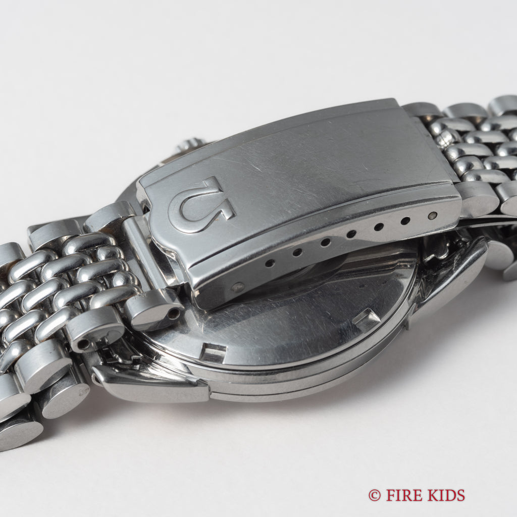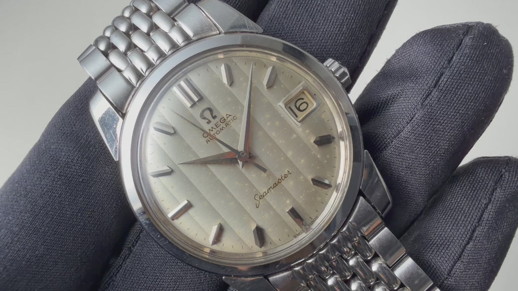 1962年製のオメガシーマスターです。文字盤は多少の経年はありますが、縦にストライプの仕上げが入ったあまり見る機会のないデザインです。ケースは小傷はありますが大きなダメージはありません。ムーブメントはCal.562を搭載、手巻きや針回しはスムーズです。ブレスレットは純正ライスブレスを装着しています。こちらの時計は分解掃除済です。