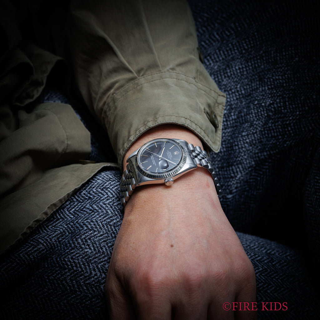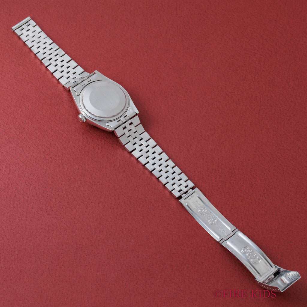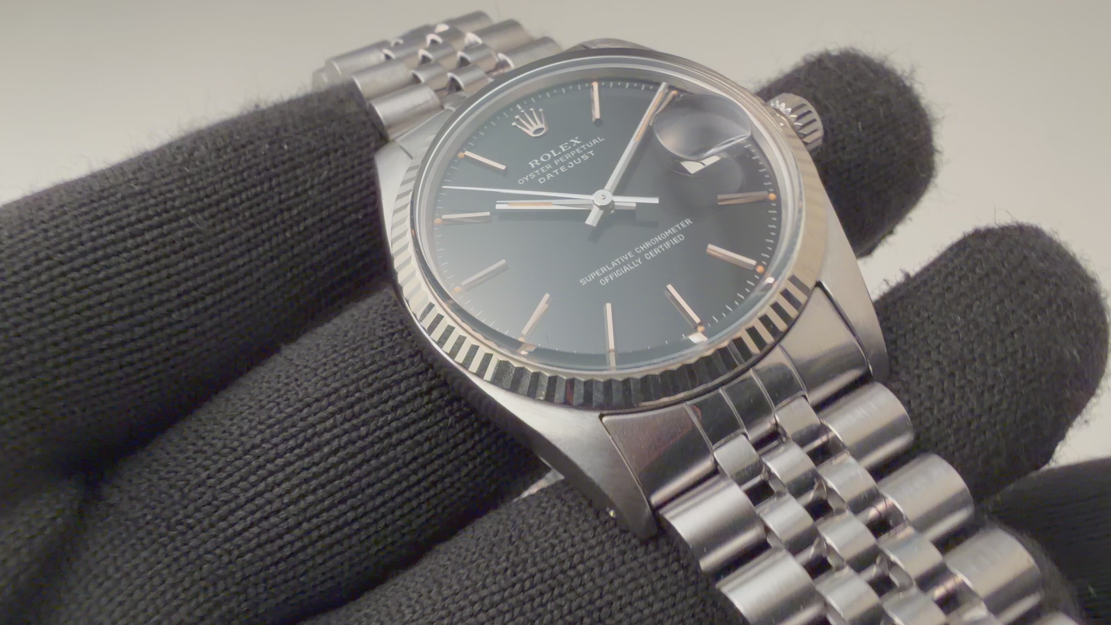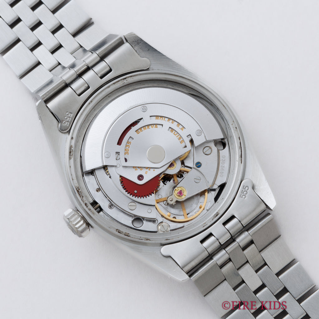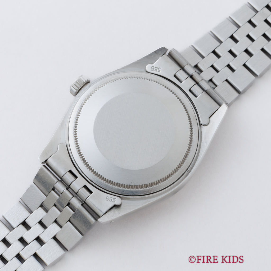 ロレックス デイトジャスト 1979年製 Ref.16014 ブラックダイヤル ギャラ付きです。艶のあるブラックダイヤルは表面の荒れが多少見られますが、夜光塗料も欠ける事無く維持されています。ケースも過去に磨かれた形跡はございますが、過度な仕上げは入っておらず、ダレてしまっている事も多いベゼルのエッジも残っており、自然な良いコンディションです。ムーブメントは実用性の高い早送りが付くcal.3035を搭載、巻き上げも針回しもスムースです。ブレスレットは純正のジュビリーブレスが付きます。こちらは分解掃除済みです。