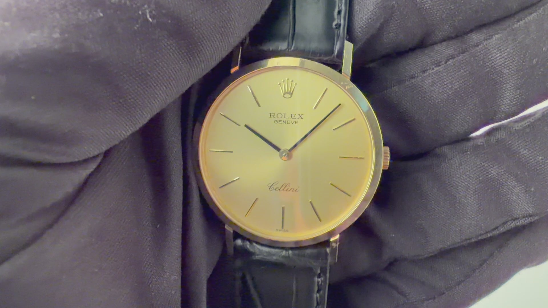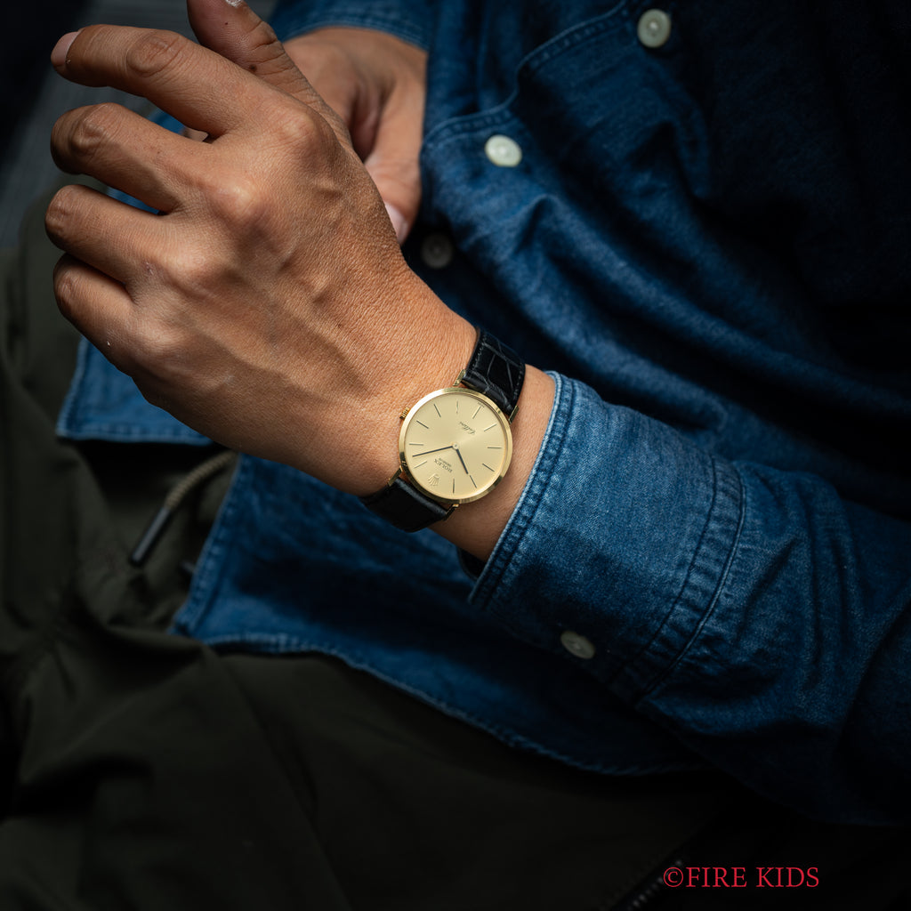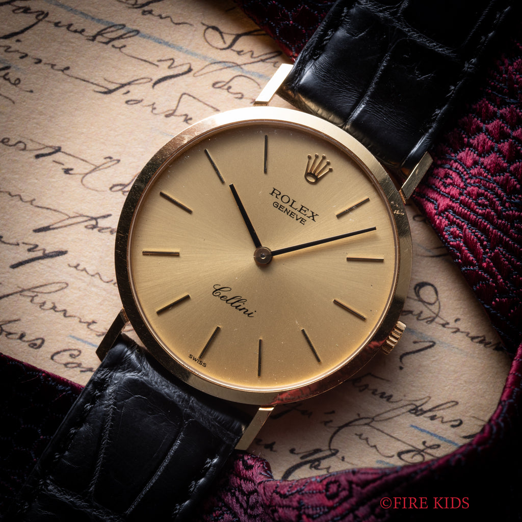 ロレックス チェリーニ 1975年製 Ref.4112 18金無垢ラウンドケース 純正尾錠付きです。デイトジャストなどスポーツ系のイメージが強いロレックスの中でノンデイト、二針のバーインデックス、厚さ5mmなどのドレスウォッチの要素を盛り込んだチェリーニ。芸術家チェッリーニのような優雅さと繊細さをコンセプトに作られました。メンズ・レディース共にお使いいただけるサイズになっております。裏蓋のシールが付いたままの状態で、大きなダメージはございません。ベルトはファイアーキッズオリジナルのクロコダイル革ベルトが装着してあります。