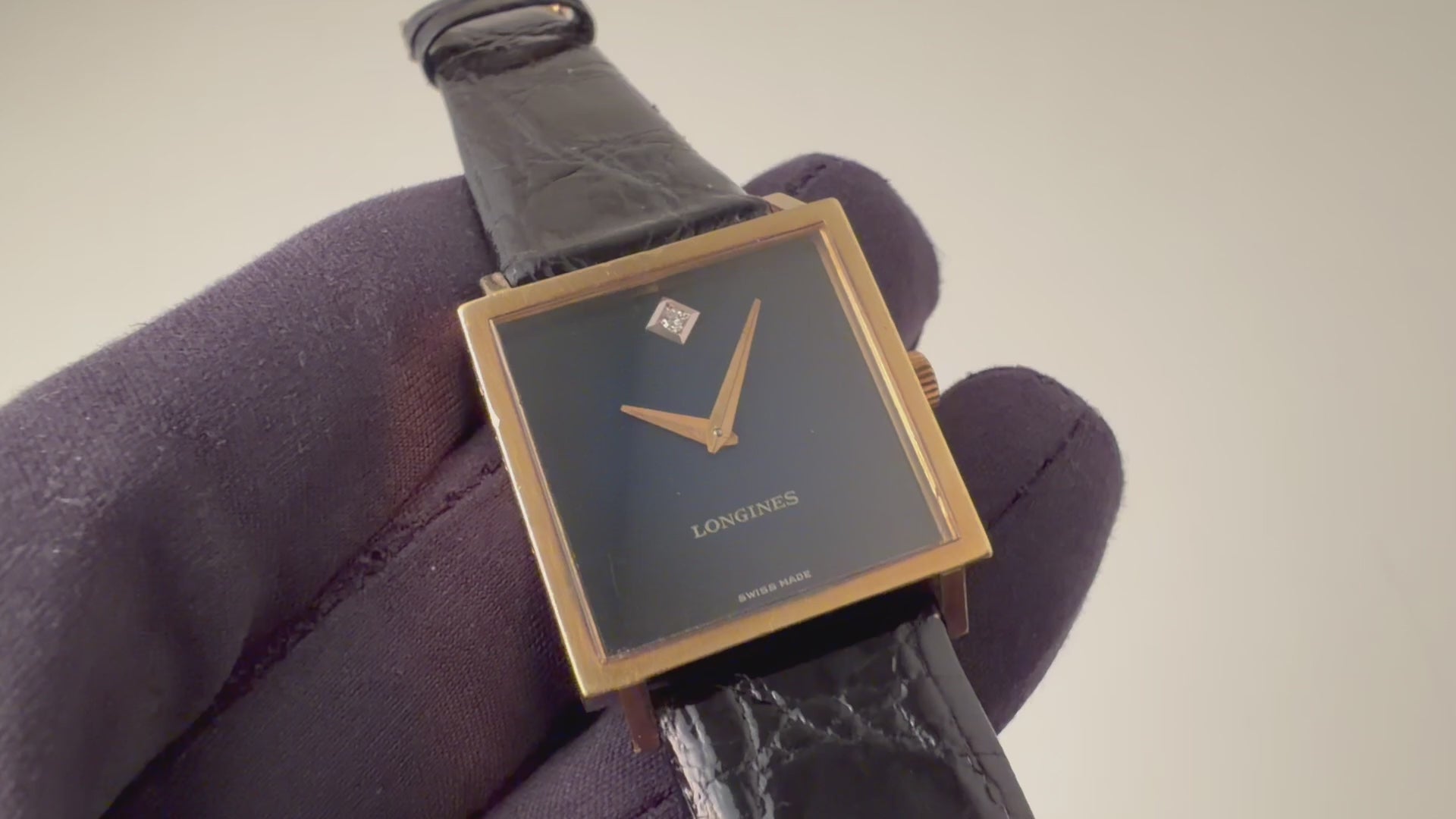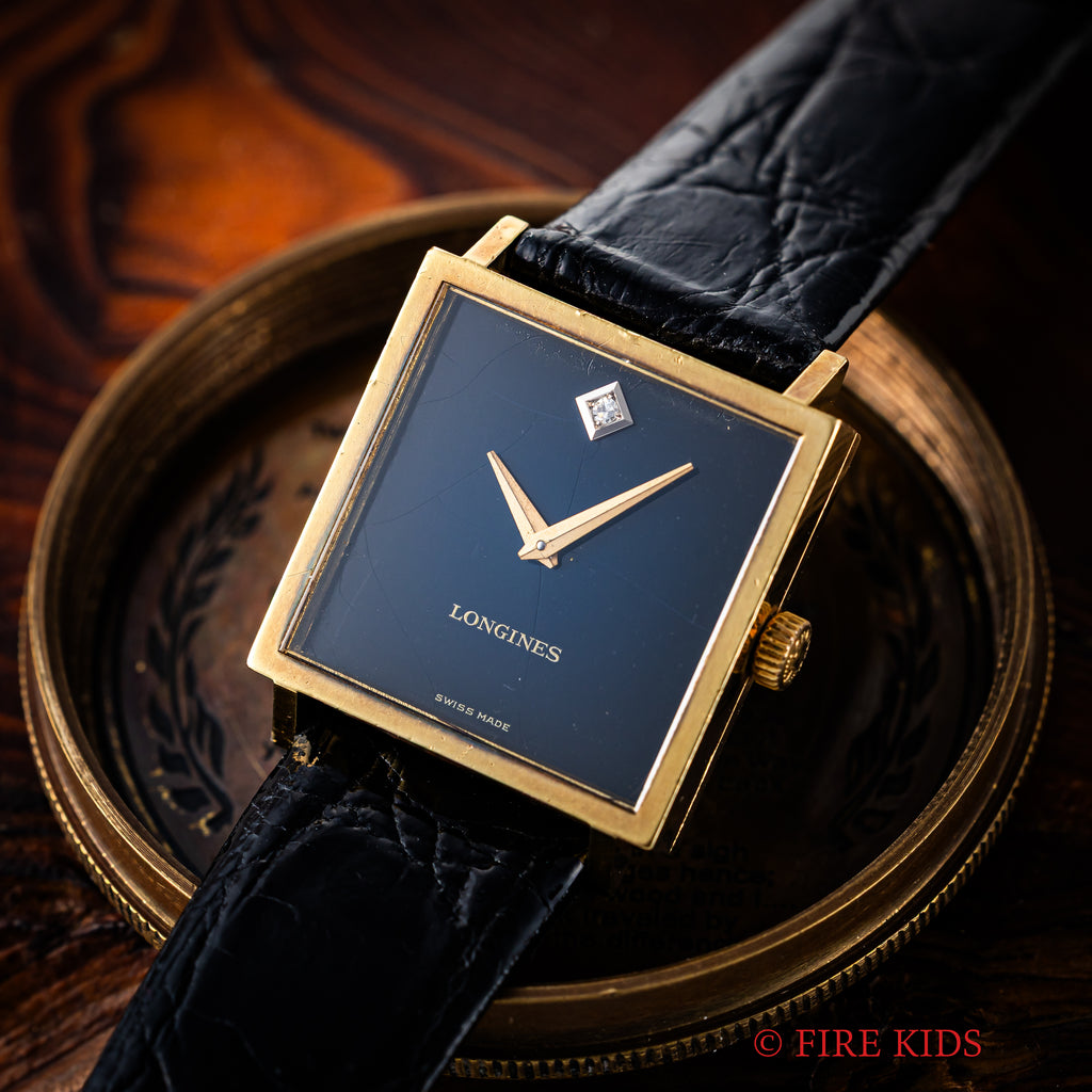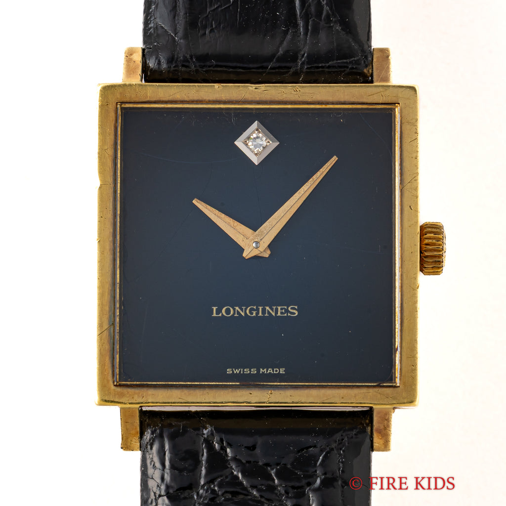 ロンジン スクエア 18金無垢イエローゴールド ダイヤ 1970年代製 手巻き Ref.4043 Cal.528です。18金無垢イエローゴールドケースに2針、ブラックダイヤルとデザイン性の高い一本です。ダイヤルはクラックが見受けられます。ケースは小傷はありますが磨きはそこまで感じません。ベルトは社外のクロコダイル革ベルトを合わせています。手巻きや針回しはスムーズです。