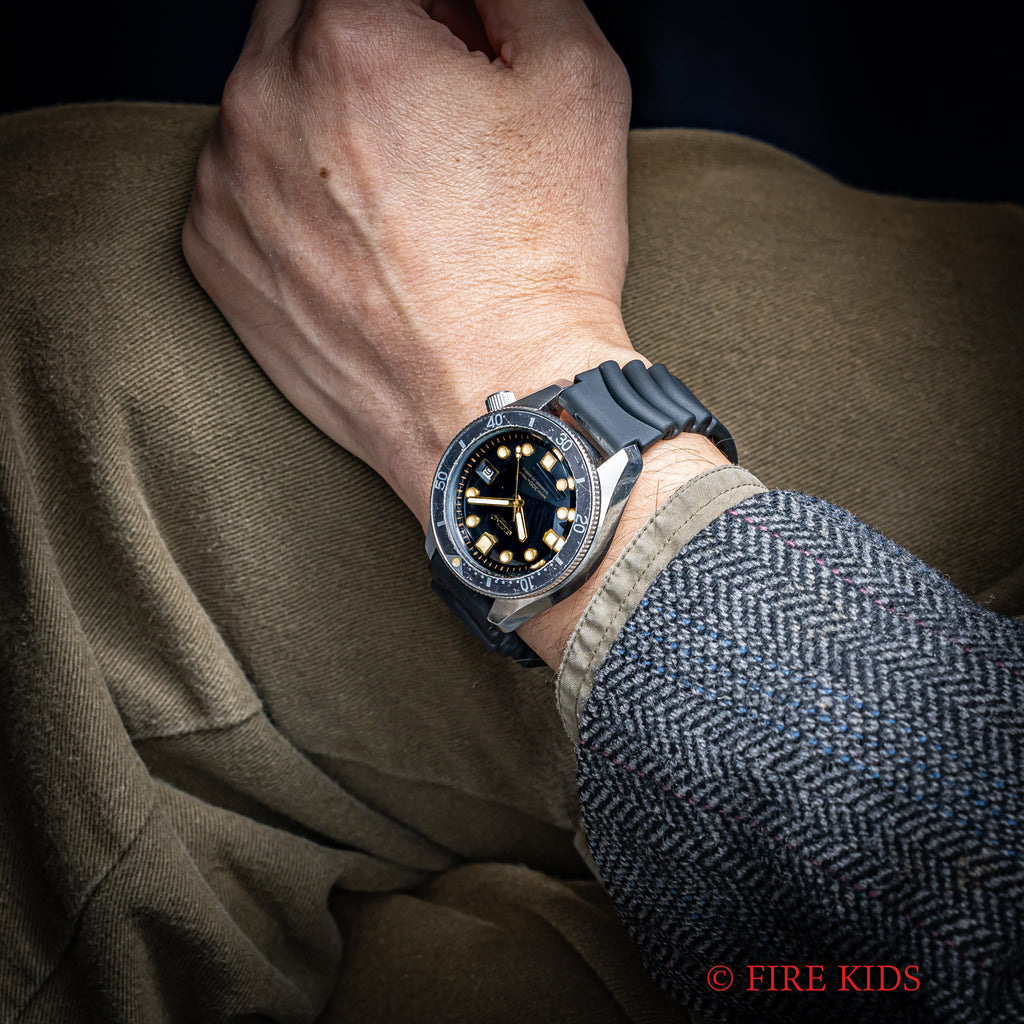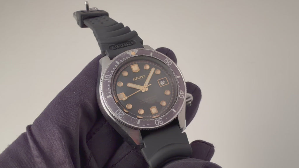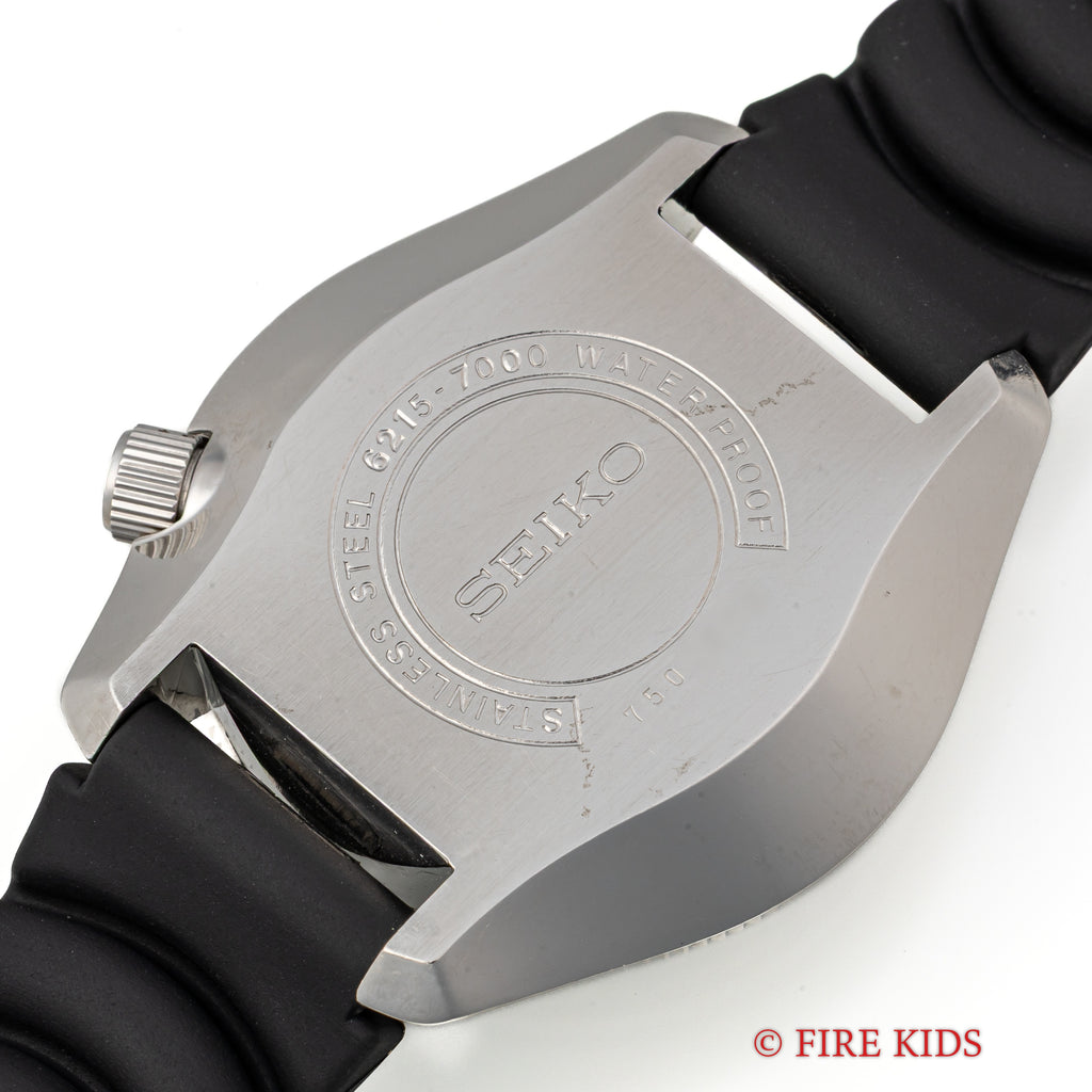 セイコー300mダイバーファーストモデル初期型6215-7000カウントダウンベゼル1967年製です。セイコー初のプロフェッショナルダイバーズでロービート自動巻きムーブメントを搭載しています。ロレックスやオメガよりも早く300m防水を市販したセイコーのスイス勢に負けない技術力の高さを証明したモデルです。ケースは小傷が見られますが大きなダメージはありません。文字盤は艶が飛んでマット調になっています。ベゼルの色抜けとマッチしておりカッコいいです。ベルトは後年の純正ラバーベルトに純正尾錠が取り付けられています。こちらは分解掃除済みです。