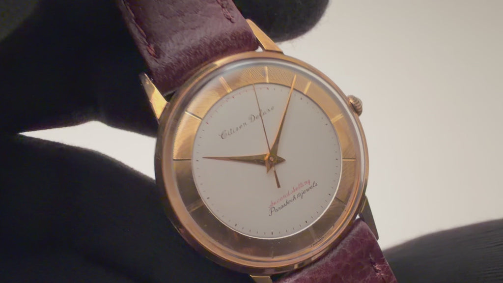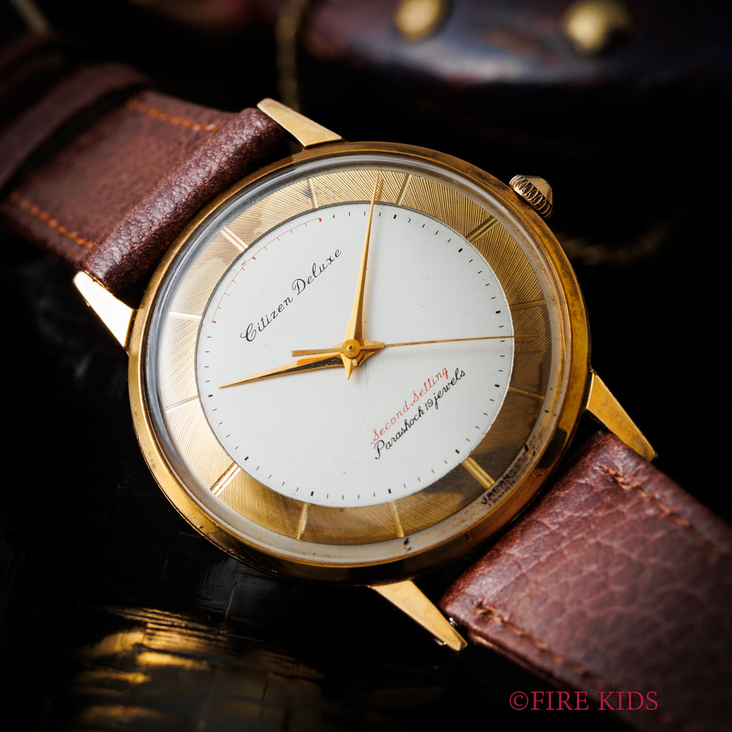 シチズン デラックス セコンドセッティング Ref.R150805 1960年製です。赤文字でセコンドセッティングの表記がされている事から当時でも珍しい秒針規制装置をアピールする目的です。リューズを一段引いて秒針が12時位置に来るとハックが効きます。ケースは小傷程度です。ベルトは社外の革ベルトを合わせています。