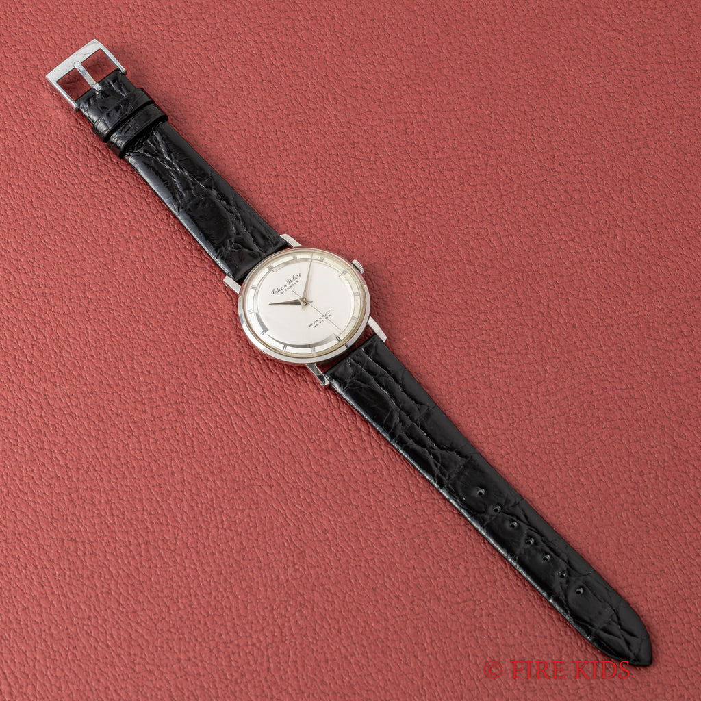 シチズン デラックス 1960年製 変わり文字盤 オリジナル革ベルト付きです。シチズン初の本格派薄型三針時計として誕生したデラックスです。本品のように変わったデザインの文字盤も多く、好みの一本を探す楽しみもあります。年代なりの経年はありますが、大きなダメージは無くケースもエッジがあります。ベルトは社外のクロコダイル革ベルトに純正尾錠を合わせています。使用感はありますが、オリジナルの革ベルトが付属します。手巻きや針回しはスムーズです。