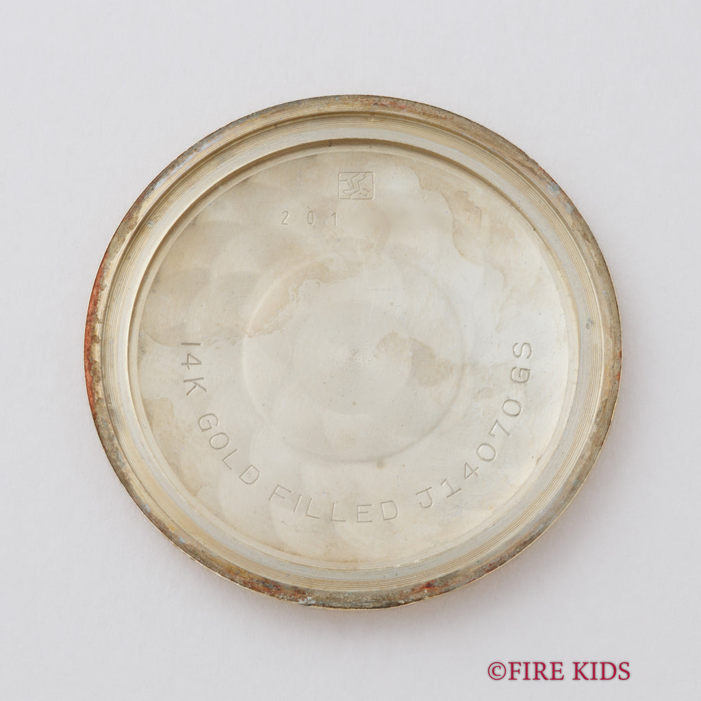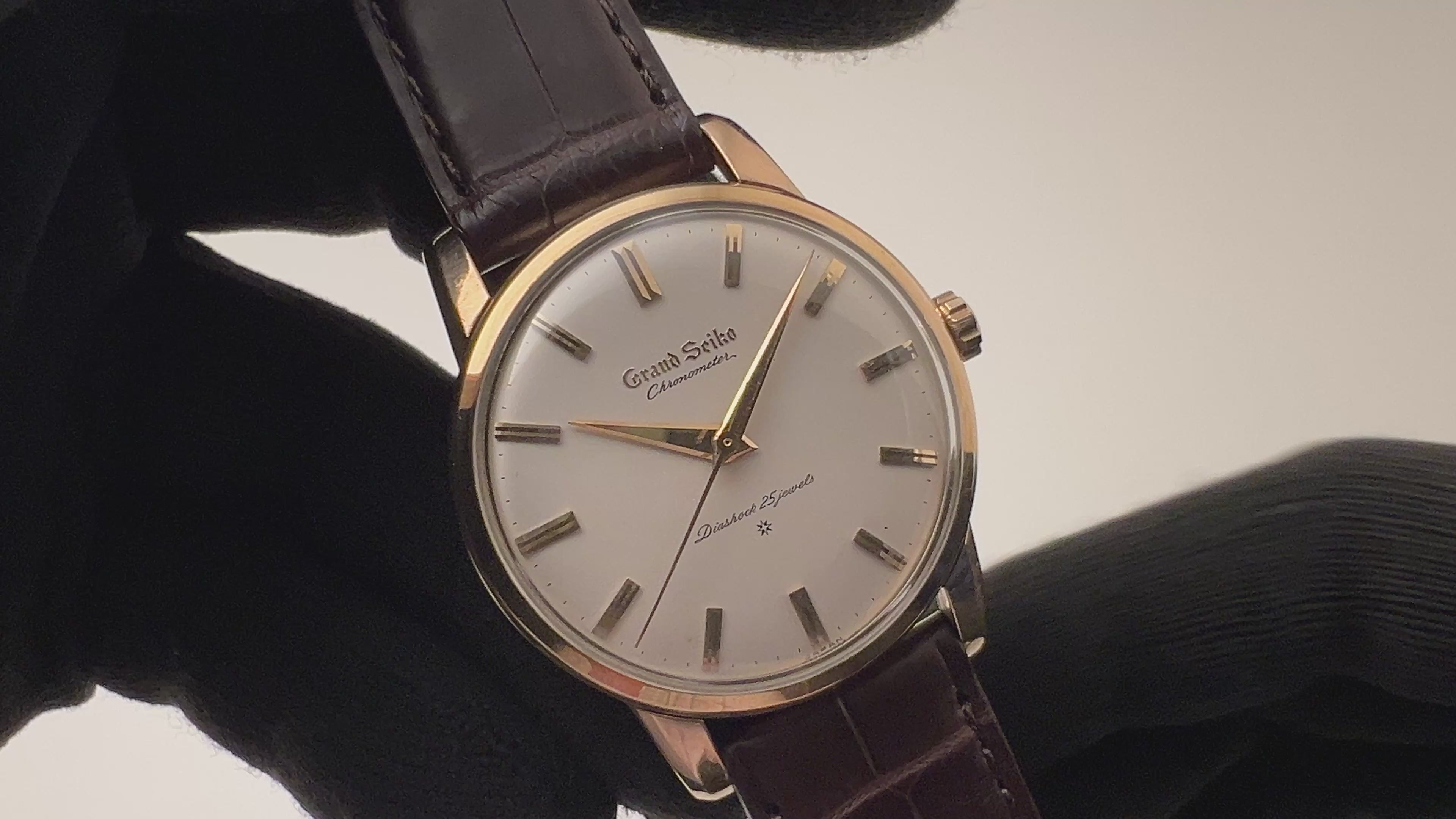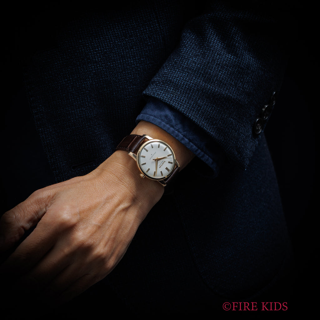 グランドセイコー ファーストモデル 1962年製 Ref.J14070 GS アップライトロゴです。グランドセイコー1stモデルは、1960年から1963年の3年間だけ製造され、こちらの文字盤は、後期型で『GRAND SEIKO』の文字がアップライト仕様のものになります。ダイヤルは多少経年変化が見られますが、概ね良好なコンディションです。14金80ミクロンの金張りケースは、大きなダメージもなく、ライオンメダリオンはしっかり残っています。手巻きや針回しファンクションは問題ありません。ベルトはファイアーキッズオリジナルのクロコダイル革ベルトを合わせています。