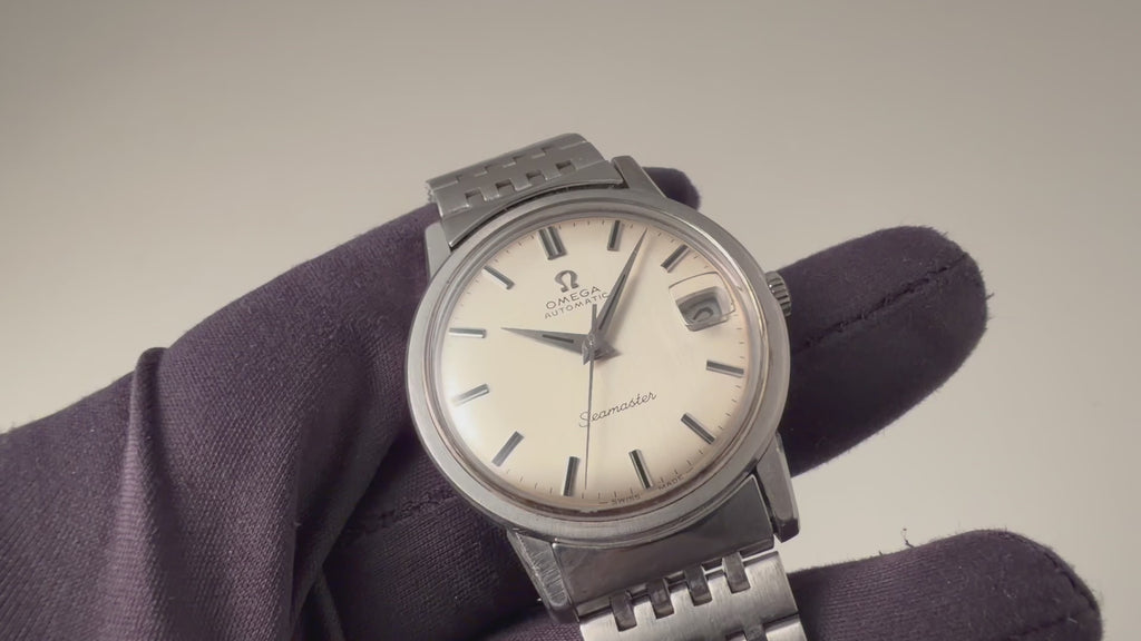 オメガ シーマスター 1967年製 自動巻 Cal.565 Ref.166.003 純正ライスブレス付の入荷になります。シンプルなラウンドケース、アップライトバーインデックスとΩマークとシルバー文字盤のシンプルですが飽きの来ない組み合わせです。デイトは早送り付きで実用性も高いモデルです。文字盤は肉眼で気になるダメージは無く、概ね良好です。ムーブメントはオメガの黄金時代を支えた500番台のCal.565を搭載。手巻きや針回しの操作はスムースです。ベルトは後年の純正ブレスが付いています。