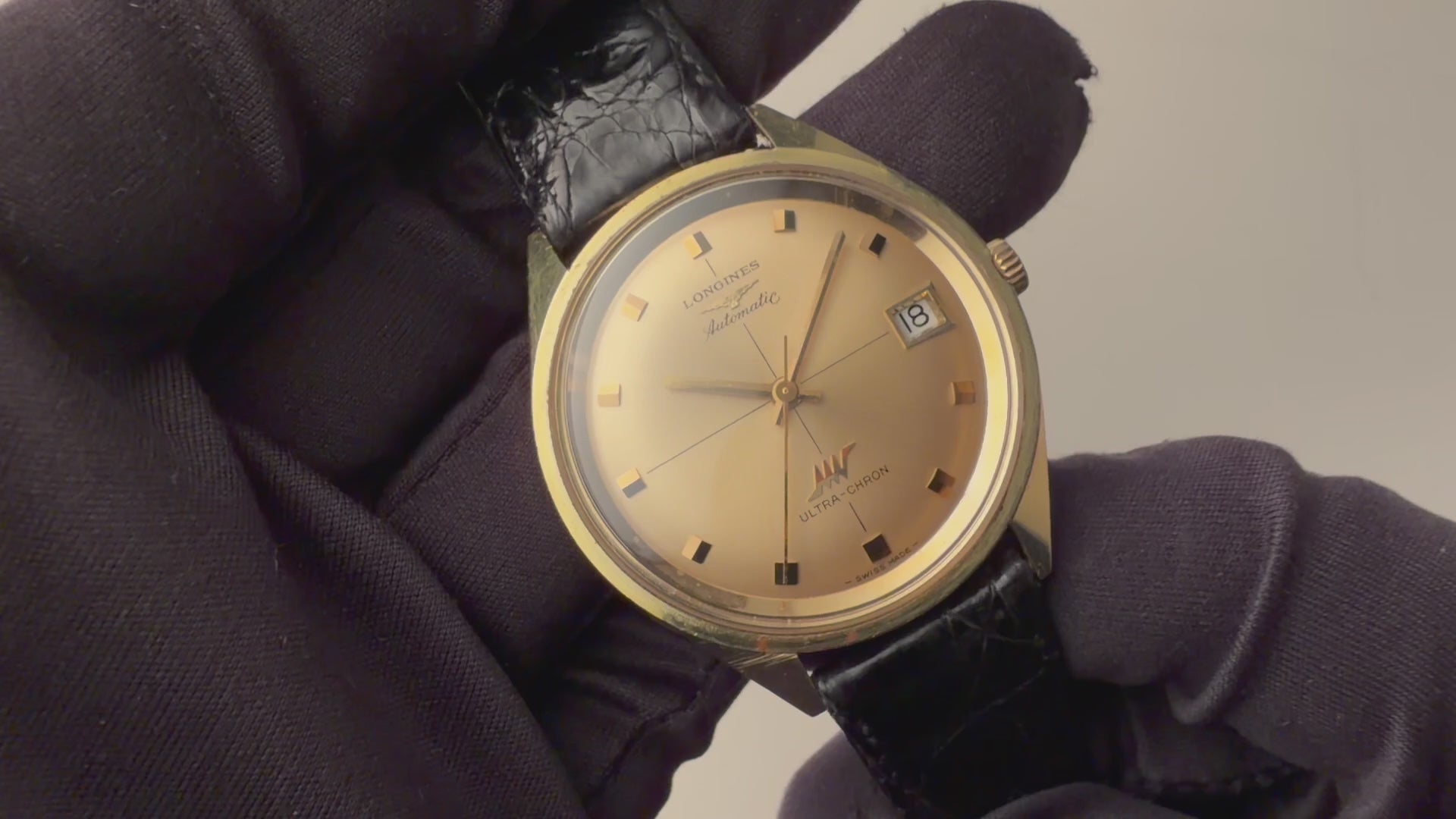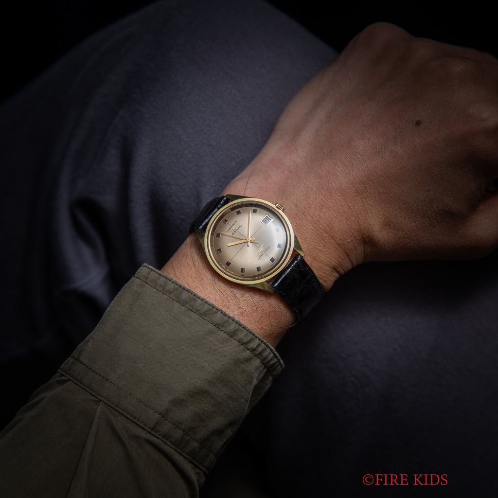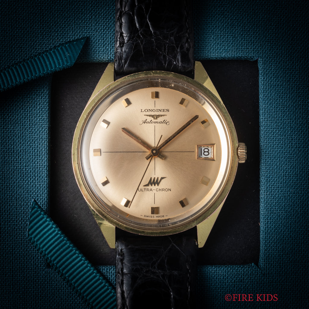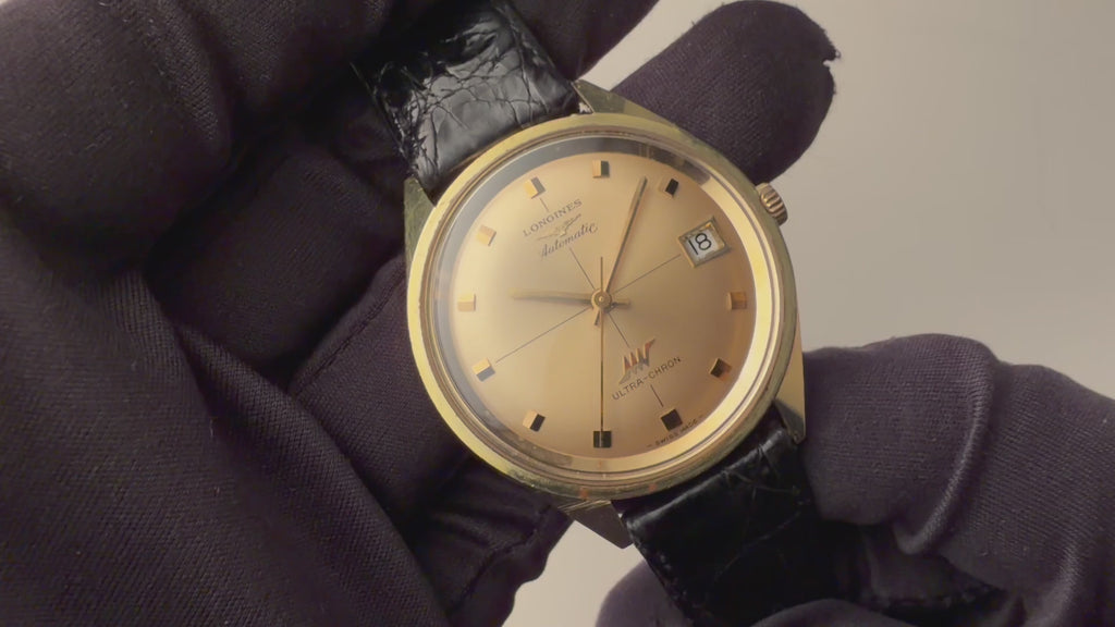 1969年製のロンジン ウルトラクロン 金張りケースです。ハイビート(10振動)自動巻きの機械を搭載し、精度を追い込んだウルトラクロン。文字盤はシャンパンゴールドにクロスライン入り、バトンハンドに段差のあるインデックスが見易さとデザイン性も兼ね備えています。ダイヤル、ケースともに多少の経年や小傷、打痕はありますがさほど大きなダメージはありません。手巻きや針回しはスムーズです。ベルトはに純正尾錠を合わせています。こちらは分解掃除済みです。