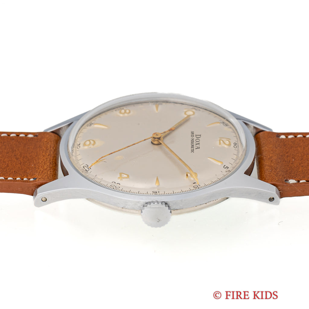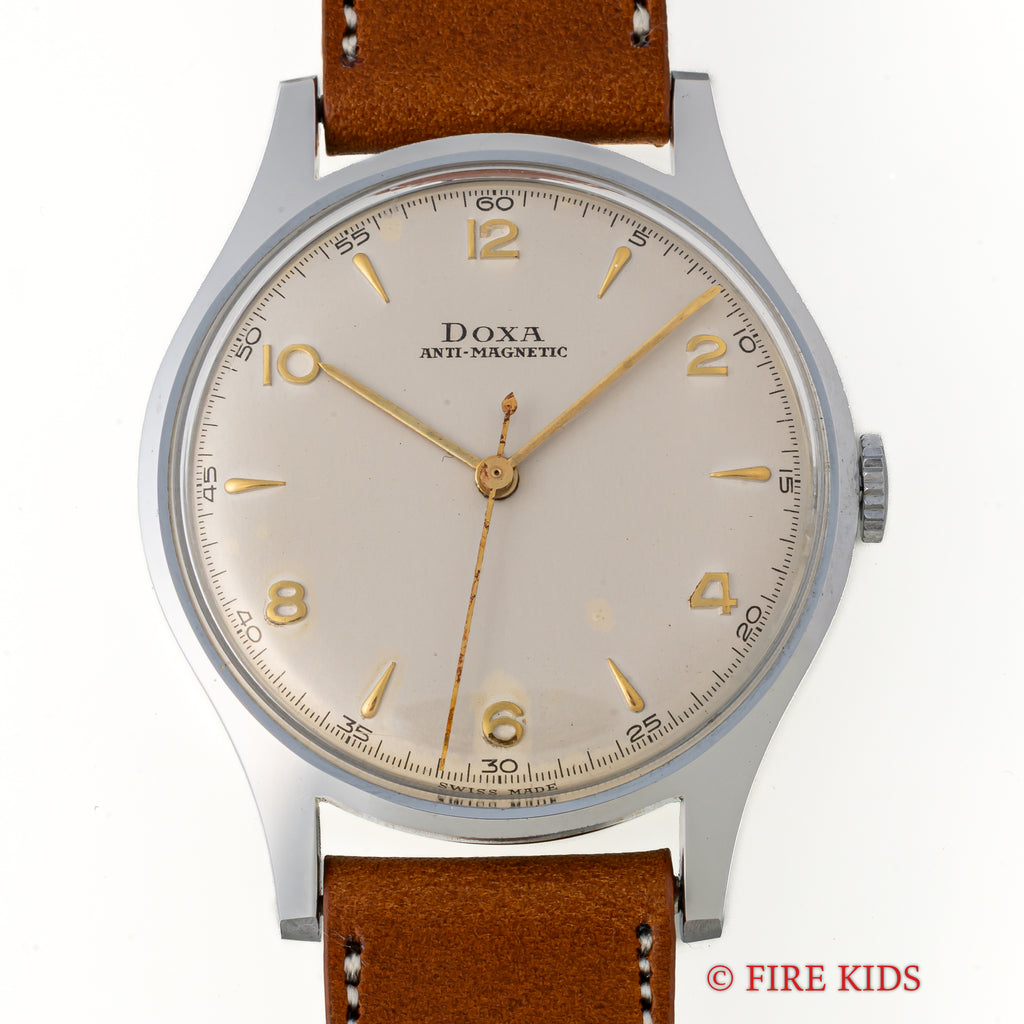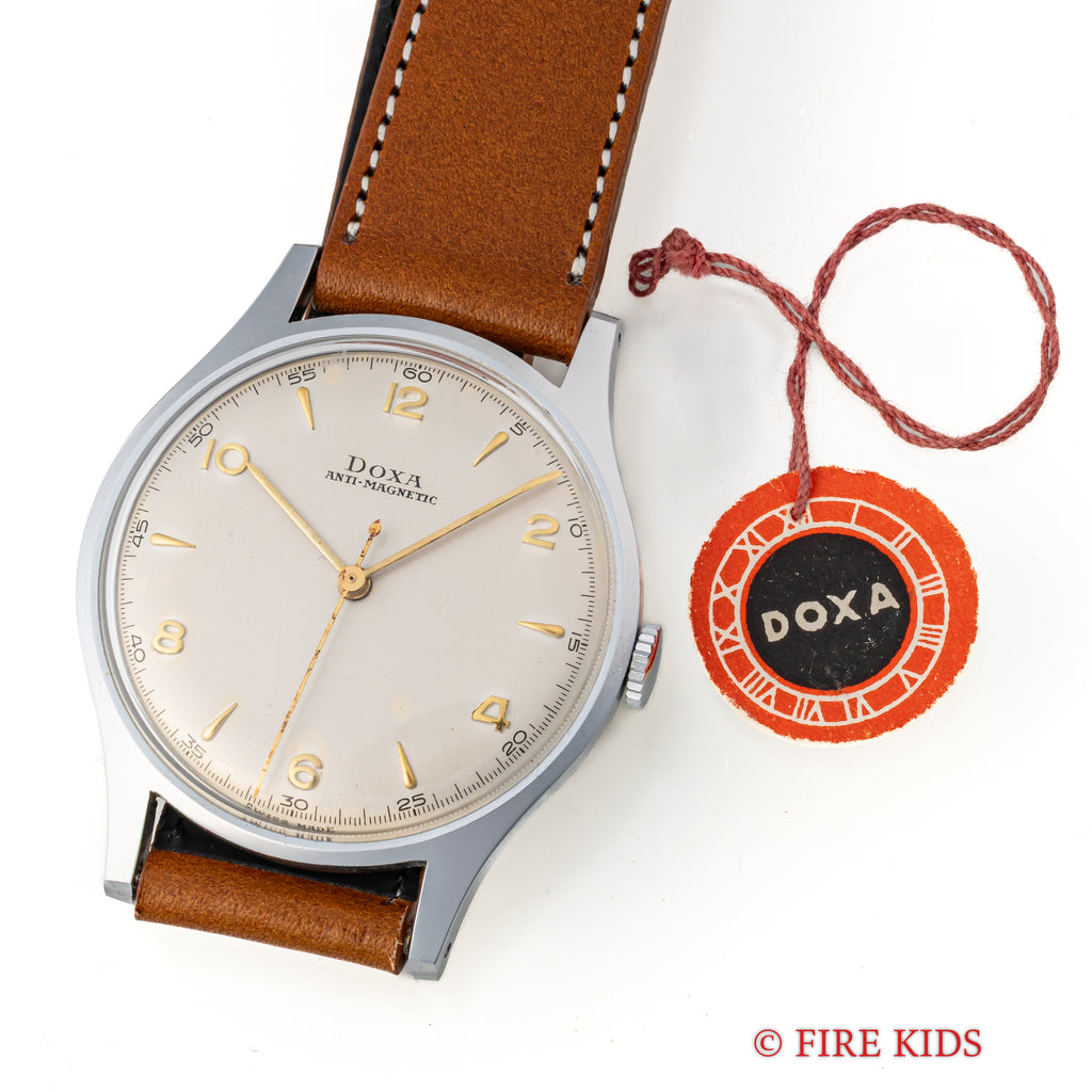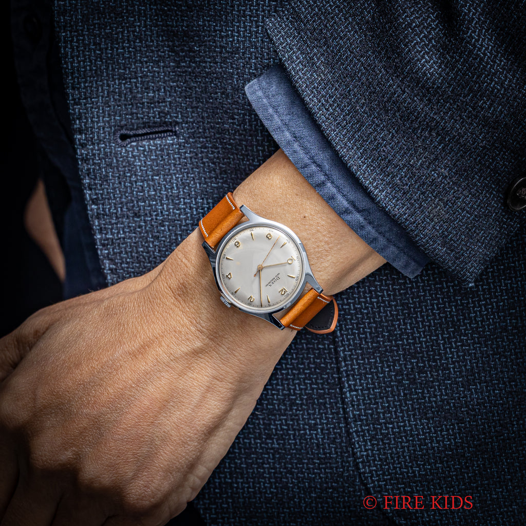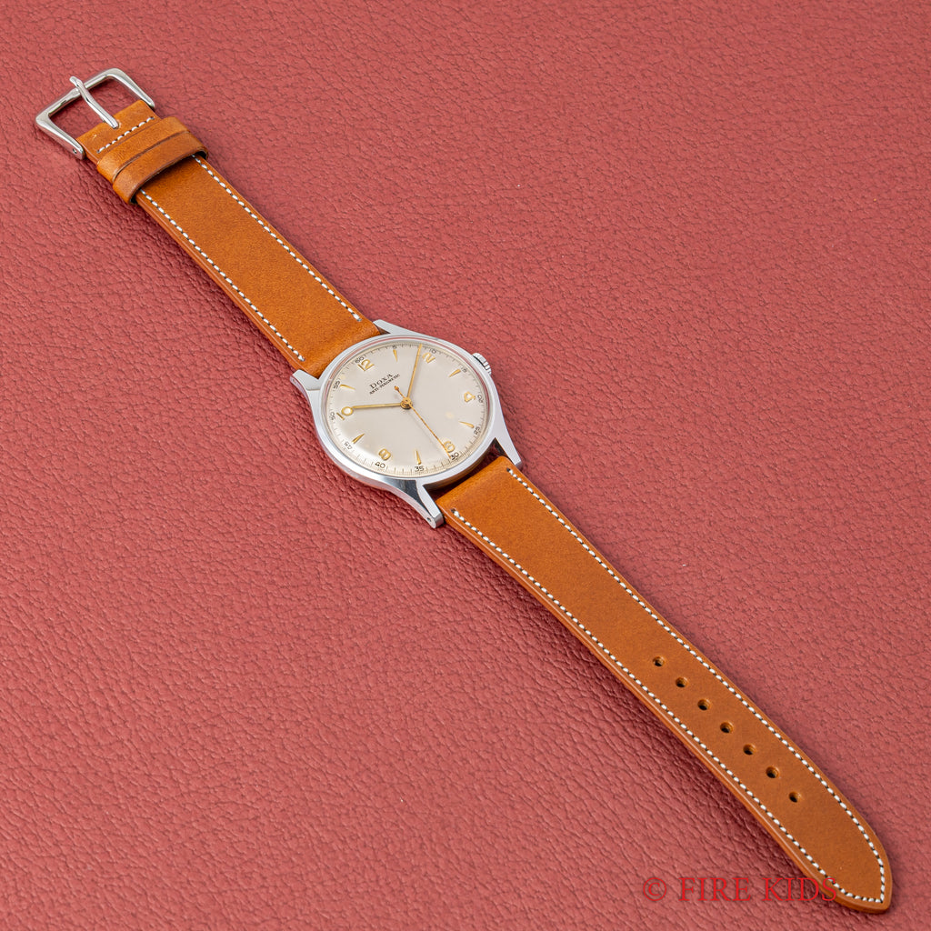 1950年代製のドクサのシンプルな手巻きモデルが未使用の状態で入荷しました。良質なクロノグラフの製作でヴィンテージウォッチファンからは一目を置かれているドクサですが、こちらはシンプルな3針タイプで、上品な雰囲気です。文字盤はわずかなエイジングが見られますが、ケースはエッジが立って当時のフォルムを完璧に残しています。ベルトはファイアーキッズオリジナルのブッテーロレザー(裏面ラバー)を合わせています。こちらの時計は分解掃除済です。