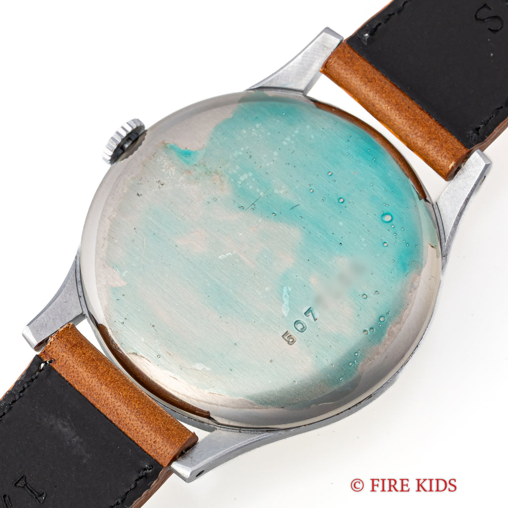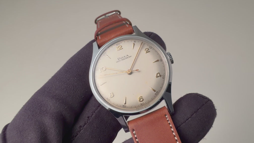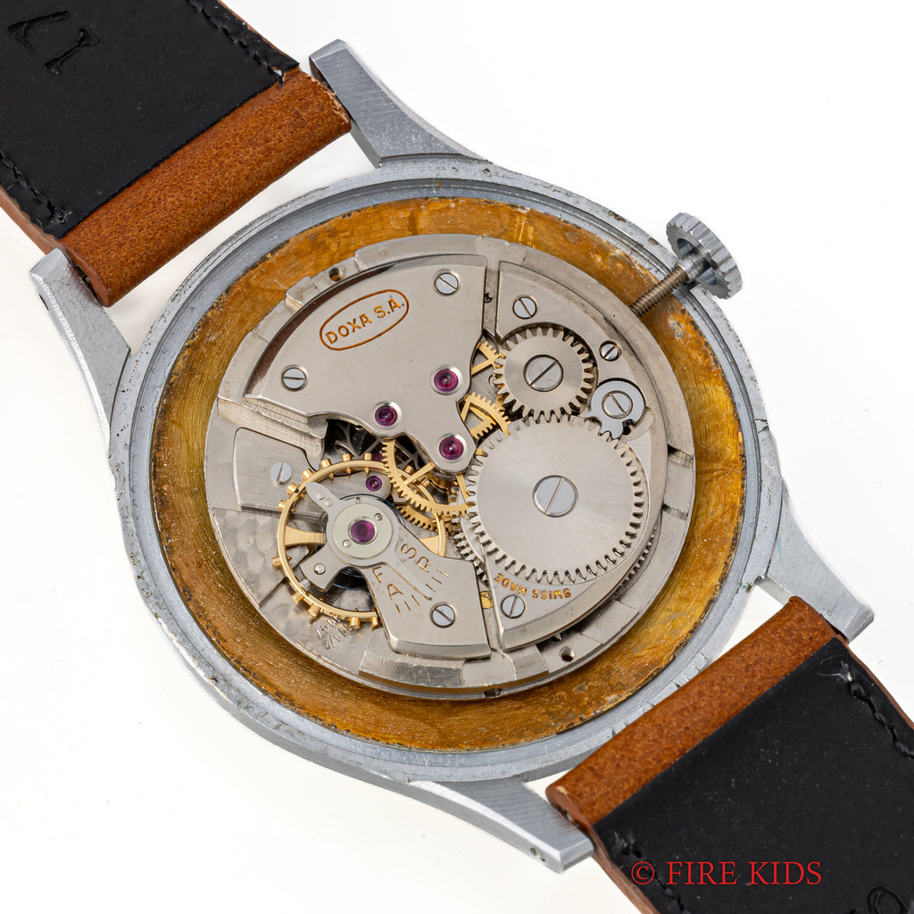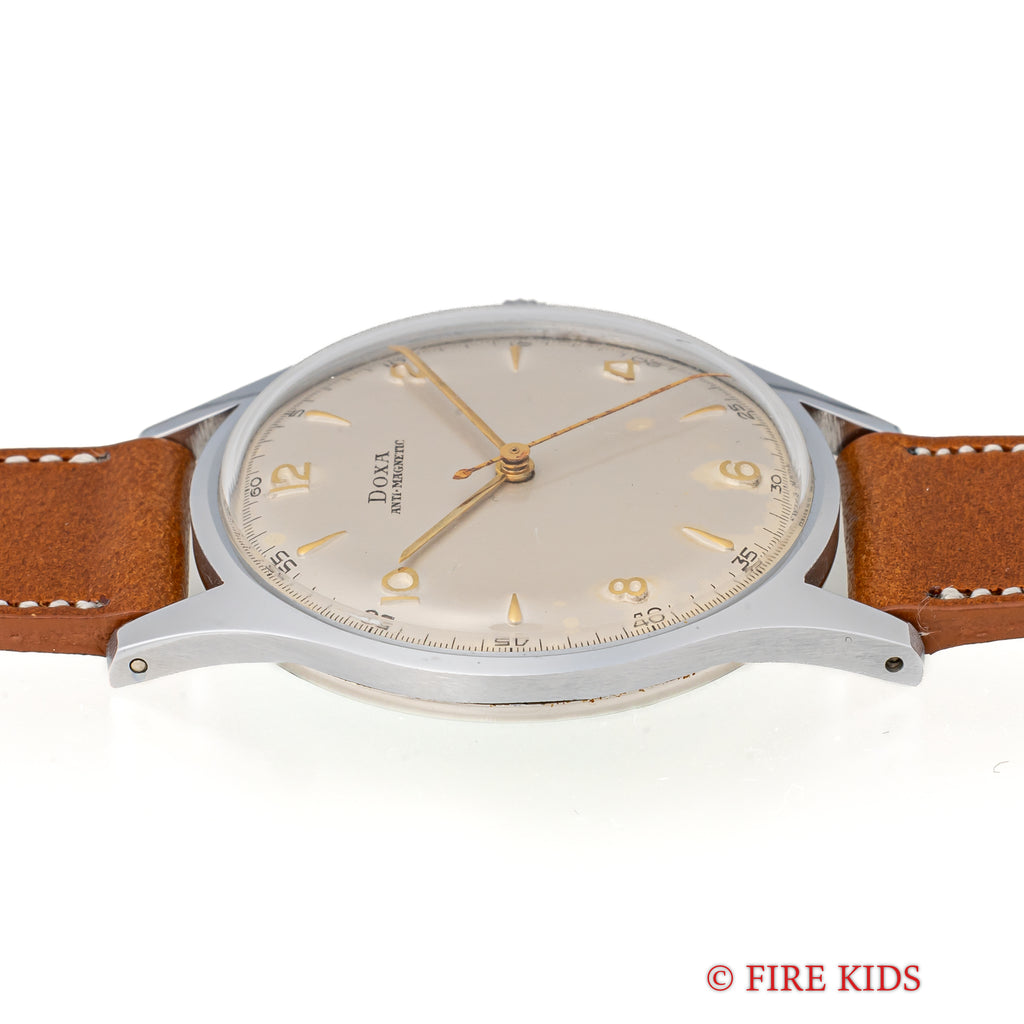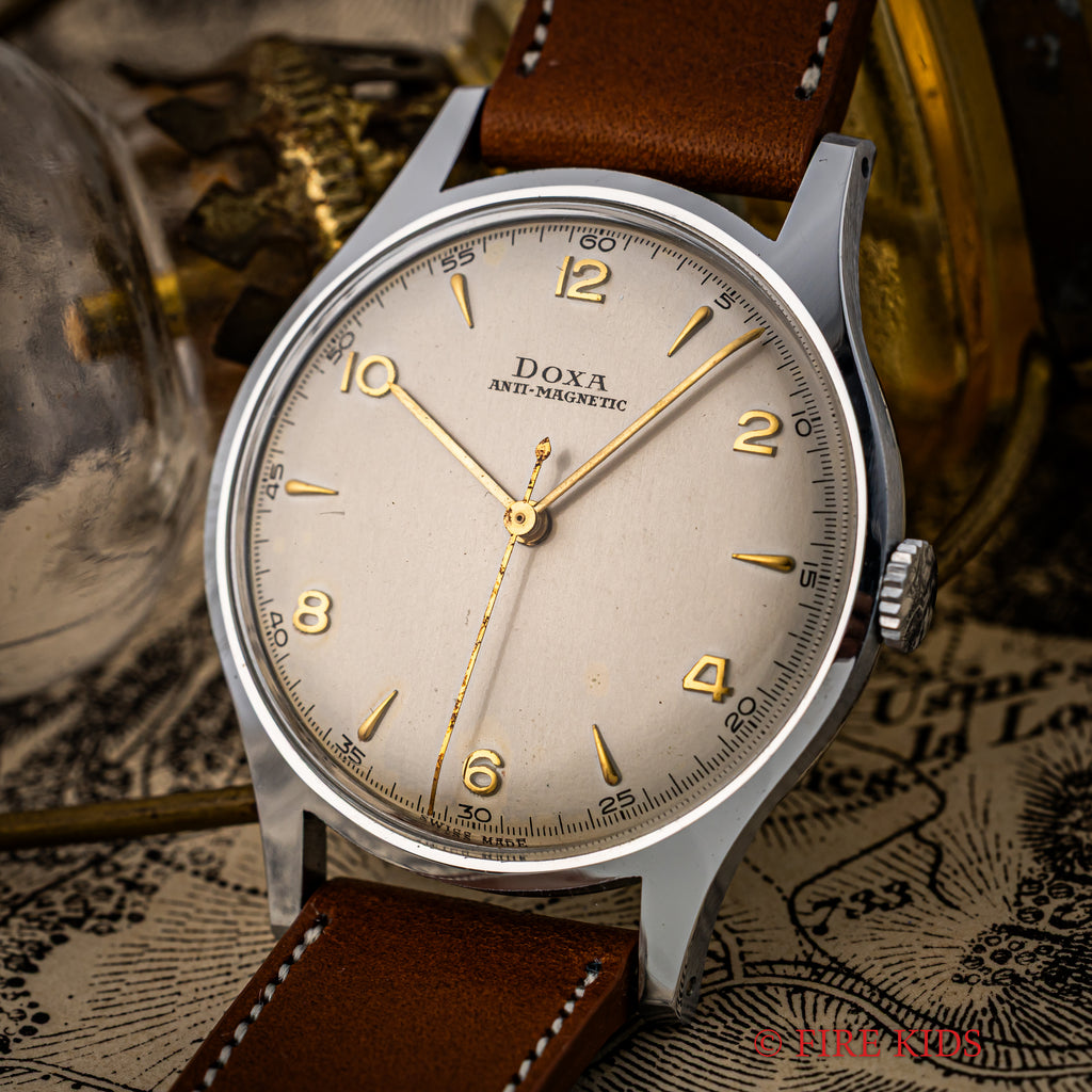 1950年代製のドクサのシンプルな手巻きモデルが未使用の状態で入荷しました。良質なクロノグラフの製作でヴィンテージウォッチファンからは一目を置かれているドクサですが、こちらはシンプルな3針タイプで、上品な雰囲気です。文字盤はわずかなエイジングが見られますが、ケースはエッジが立って当時のフォルムを完璧に残しています。ベルトはファイアーキッズオリジナルのブッテーロレザー(裏面ラバー)を合わせています。こちらの時計は分解掃除済です。