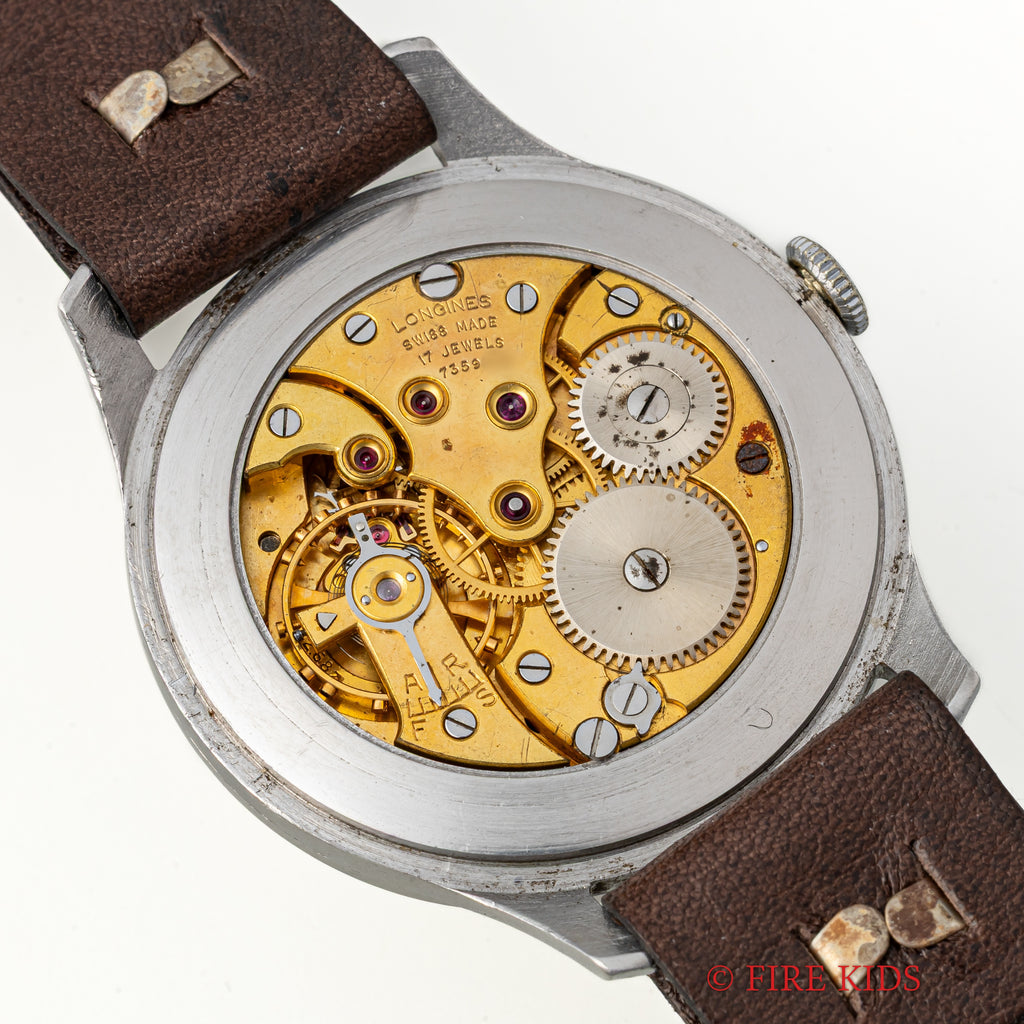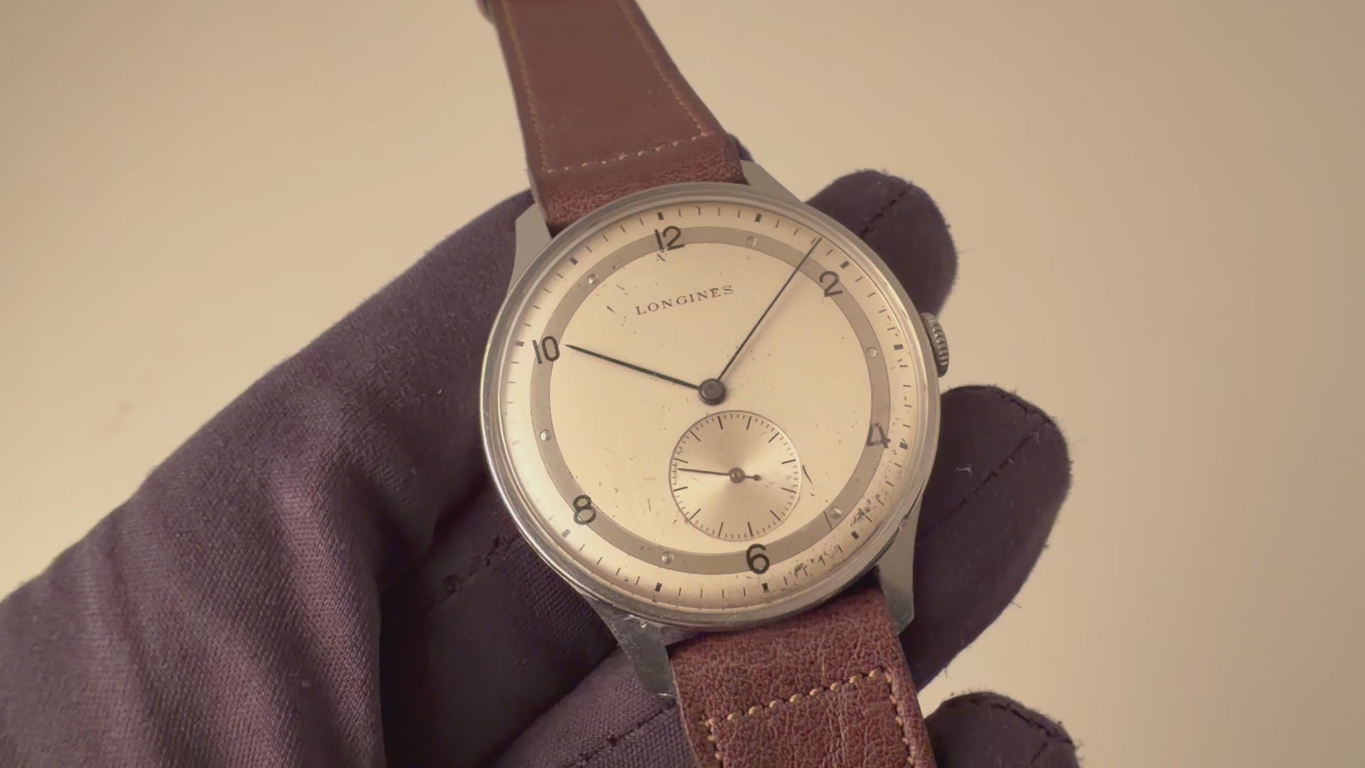 ロンジン 37㎜ビッグケース 1947年製 スモールセコンド手巻 Cal.12.68Z 飛びアラビアブルズアイダイヤルの入荷になります。存在感抜群の37㎜(リューズ別)ケースに非常に長いブルースチール針が魅力的です。文字盤外周に劣化が見られますがヴィンテージらしい良い雰囲気になっています。ケースは小傷が見られますが大きなダメージはありません。手巻きや針回しの操作はスムースです。ムーブメントは粒金メッキが施された名作Cal.12.68Zを搭載しています。ベルトはヴィンテージと相性の良いアキュレイトフォルムが取り付けされています。