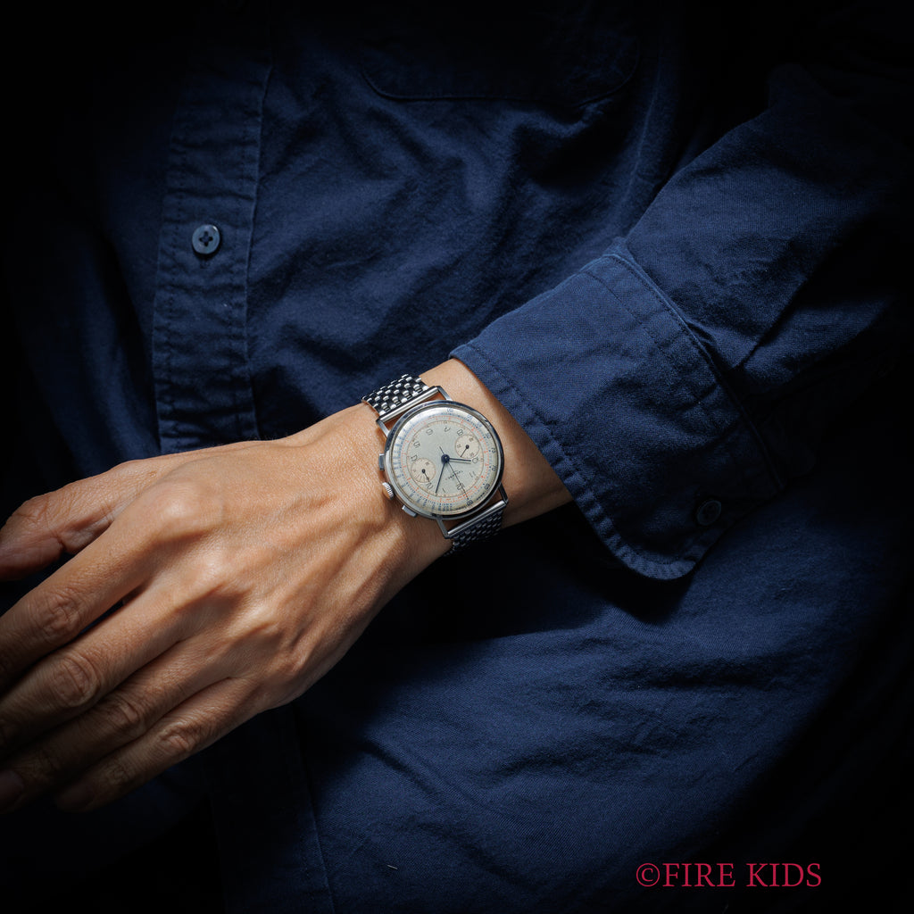 タバン 2レジスタークロノグラフ Ref.760 1940年代製 ヴィーナス175搭載 シルバーダイヤルの入荷になります。38㎜(リューズ別)のビッグケースの2レジスタークロノグラフでシルバーの文字盤にレターが3カラーになっています。文字盤は若干経年はございますが綺麗です。ケースは小傷が見られますが大きなダメージはありません。手巻きや針回し、クロノグラフの操作はスムースです。ベルトはプライベートアイズの9連ジュビリーブレスが取り付けられています。