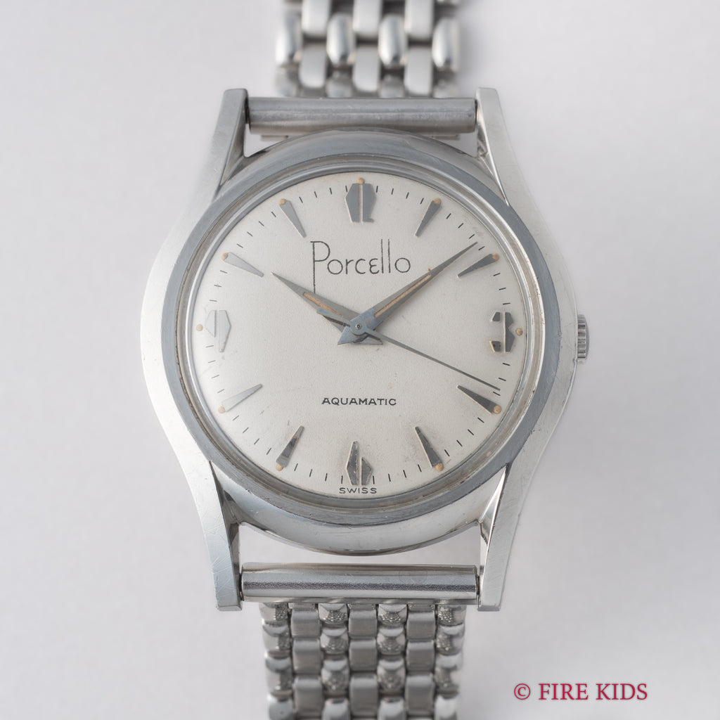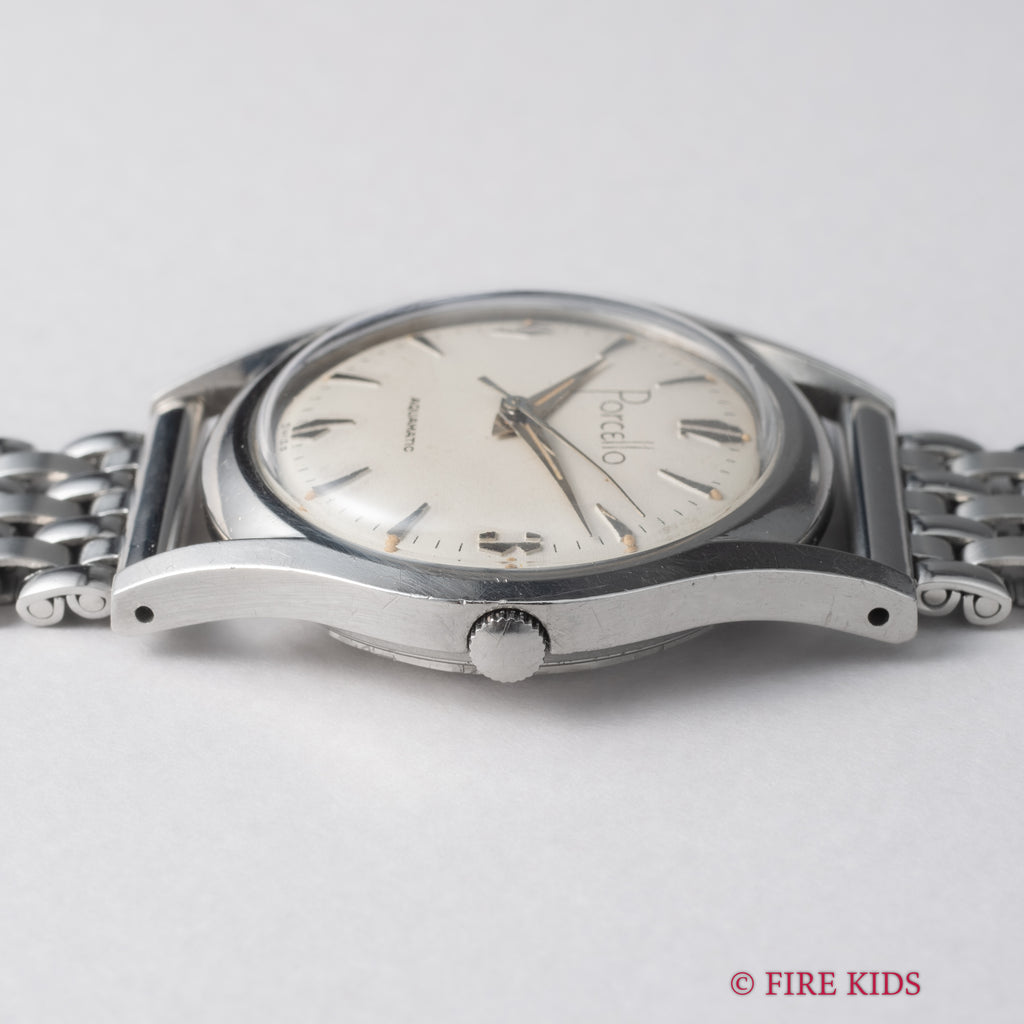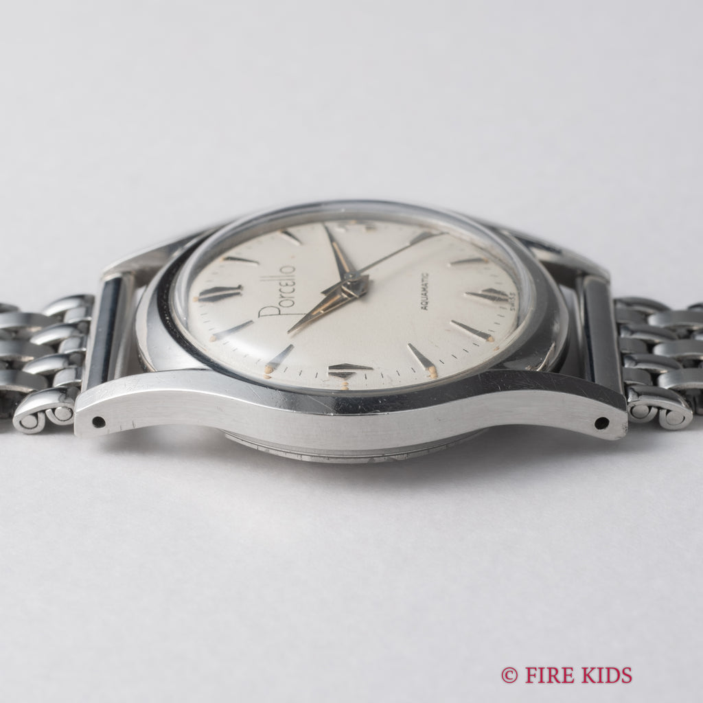 1950年代にアメリカのジュエラー「PORCELLO」がクロトンニバダに製作依頼したアクアマチックです。大きなロゴと、デコラティブなインデックスがインパクトあります。ベゼルを持たず、ミドルケースから流線形に延びるラグは1950年代の時計に多く見られることから当時の流行デザインを感じることができます。全体的に使用感は少なく、パウダーホワイトの文字盤が雰囲気があります。ムーブメントは耐震装置付きのETA1256を搭載。ベルトは雰囲気の合う社外のステンレスを取り付けてあります。
